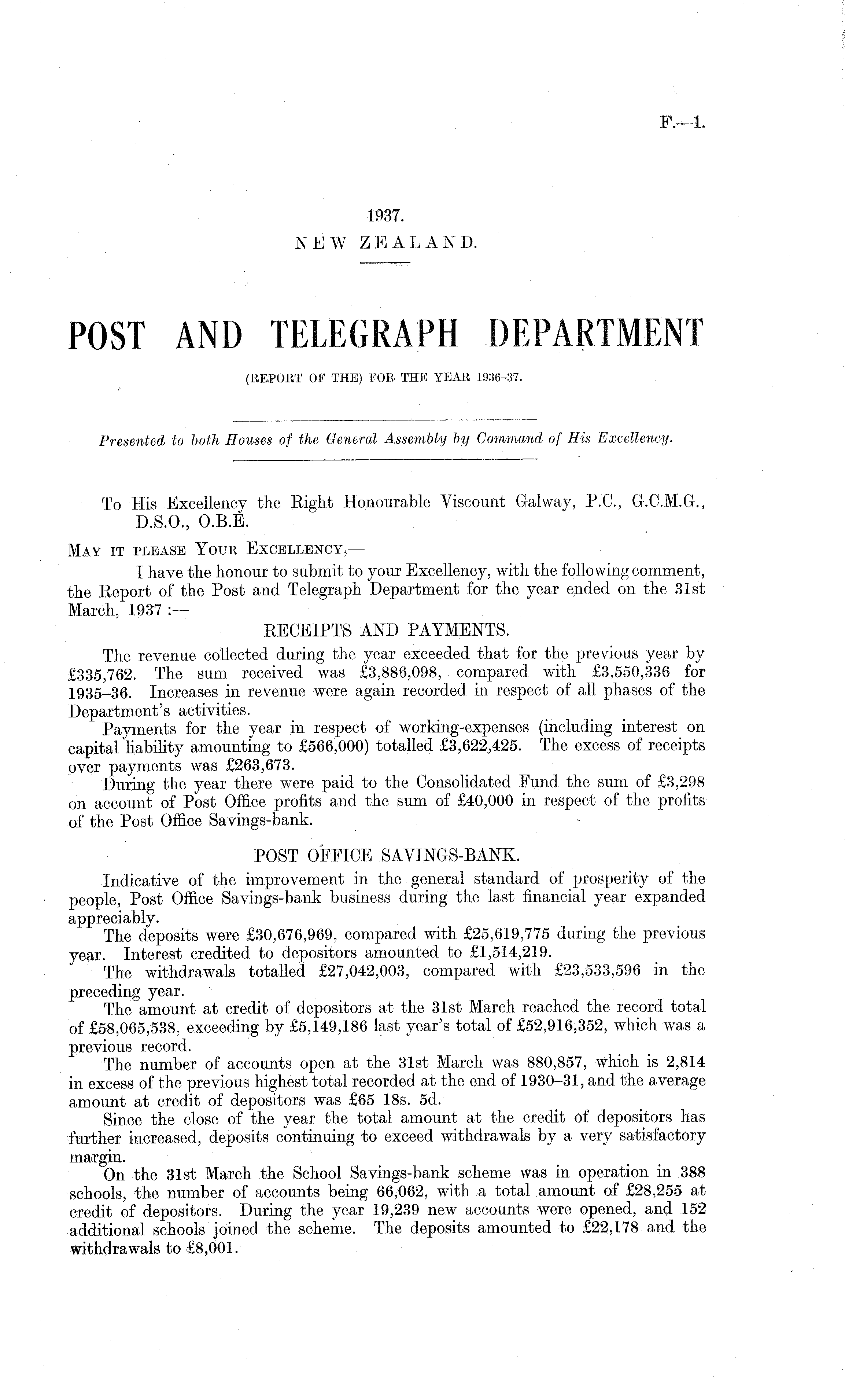 To His Excellency the Right Honourable Viscount Galway, PC., G.C.M.G., D.5.0., 0.8. E. May it please Your Excellency,— I have the honour to submit to your Excellency, with the following comment, the Report of the Post and Telegraph Department for the year ended on the 31st March, 1937 : — RECEIPTS AND PAYMENTS. The revenue collected during the year exceeded that for the previous year by £335,762. The sum received was £3,886,098, compared with £3,550,336 for 1935-36. Increases in revenue were again recorded in respect of all phases of the Department's activities. Payments for the year in respect of working-expenses (including interest on capital liability amounting to £566,000) totalled £3,622,425. The excess of receipts over payments was £263,673. During the year there were paid to the Consolidated Fund the sum of £3,298 on account of Post Office profits and the sum of £40,000 in respect of the profits of the Post Office Savings-bank. POST OFFICE SAVINGS-BANK. Indicative of the improvement in the general standard of prosperity of the people, Post Office Savings-bank business during the last financial year expanded appreciably. The deposits were £30,676,969, compared with £25,619,775 during the previous year. Interest credited to depositors amounted to £1,514,219. The withdrawals totalled £27,042,003, compared with £23,533,596 in the preceding year. The amount at credit of depositors at the 31st March reached the record total of £58,065,538, exceeding by £5,149,186 last year's total of £52,916,352, which was a previous record. The number of accounts open at the 31st March was 880,857, which is 2,814 in excess of the previous highest total recorded at the end of .1930-31, and the average amount at credit of depositors was £65 18s. sd. Since the close of the year the total amount at the credit of depositors has further increased, deposits continuing to exceed withdrawals by a very satisfactory margin. On the 31st March the School Savings-bank scheme was in operation in 388 schools, the number of accounts being 66,062, with a total amount of £28,255 at credit of depositors. During the year 19,239 new accounts were opened, and 152 additional schools joined the scheme. The deposits amounted to £22,178 and the withdrawals to £8,001.