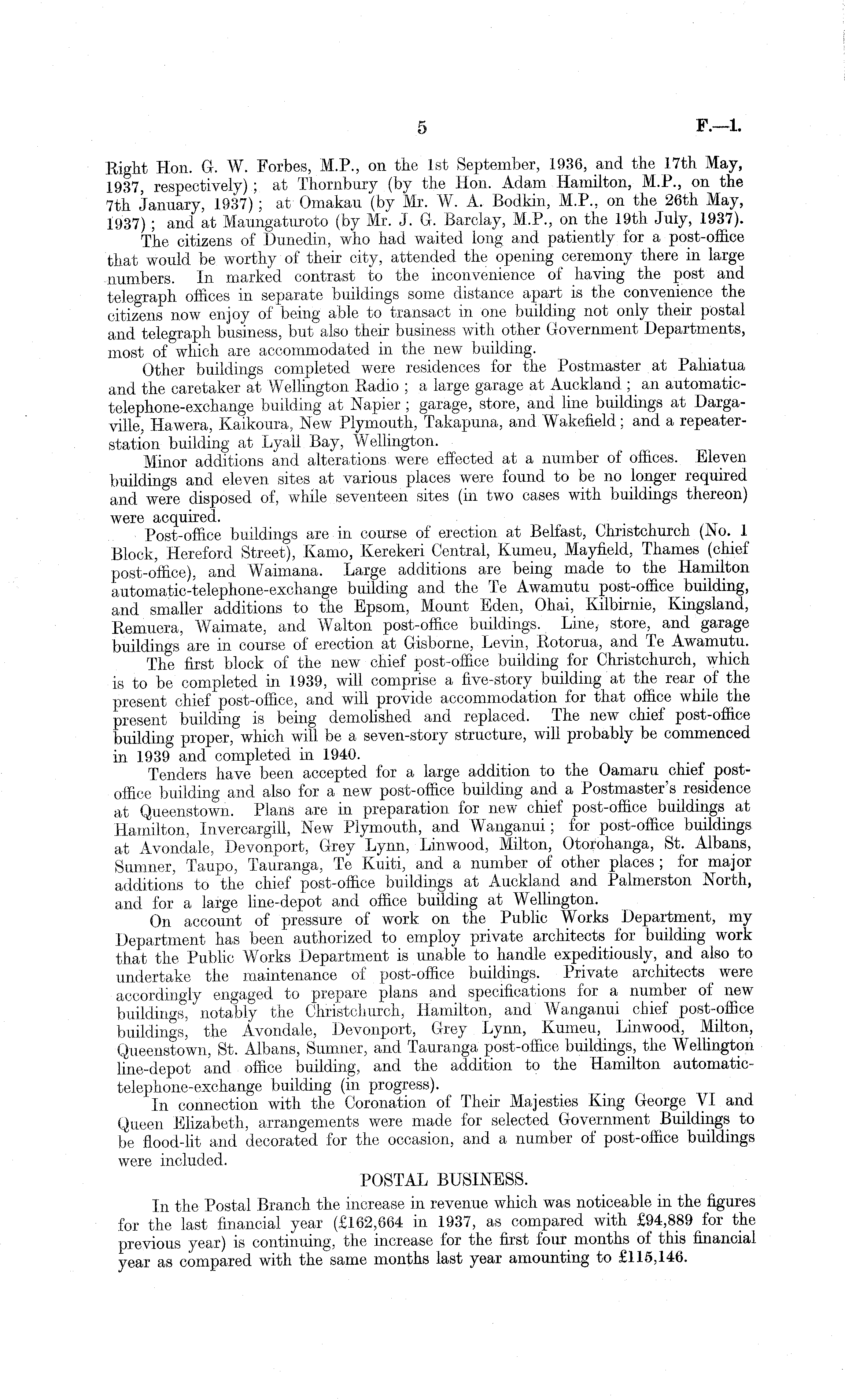 Right Hon. G. W. Forbes, M.P., on the Ist September, 1936, and the 17th May, 1937, respectively) ; at Thornbury (by the Hon. Adam Hamilton, M.P., on the 7th January, 1937) ; at Omakau (by Mr. W. A. Bodkin, M.P., on the 26th May, 1937) ; and at Maungaturoto (by Mr. J. Gr. Barclay, M.P., on the 19tli July, 1937). The citizens of Dunedin, who had waited long and patiently for a post-office that would be worthy of their city, attended the opening ceremony there in large numbers. In marked contrast to the inconvenience of having the post and telegraph offices m separate buildings some distance apart is the convenience the citizens now enjoy of being able to transact in one building not only their postal and telegraph business, but also their business with other Government .Departments, most of which are accommodated in the new building. Other buildings completed were residences for the Postmaster at Pahiatua and the caretaker at Wellington Radio ; a large garage at Auckland ; an automatic-telephone-exchange bnilding at Napier ; garage, store, and line buildings at Dargaville, Hawera, Kaikoura, New Plymouth, Takapuna, and Wakefield; and a repeaterstation building at Lyail Bay, Wellington. Minor additions and alterations were effected at a number of offices. Eleven buildings and eleven sites at various places were found to be no longer required and were disposed of, while seventeen sites (in two cases with buildings thereon) were acquired. Post-office buildings are in course of erection at Belfast, Christchurch (No. 1 Block, Hereford Street), Kamo, Kereken Central, Kumeu, Mayfield, Thames (chief post-office), and Waimana. Large additions are being made to the Hamilton automatic-telephone-exchange building and the Te Awamutu post-office building, and smaller additions to the Epsom, Mount Eden, Ohai, Kilbirnie, Kingsland, Remuera, Waimate, and Walton post-office buildings. Line, store, and garage buildings are in course of erection, at Gisborne, Levin, Rotorua, and Te Awamutu. The first block of the new chief post-office building for Christchurch, which is to be completed in 1939, will comprise a five-story building at the rear of the present chief post-office, and will provide accommodation for that office while the present building is being demolished and replaced. The new chief post-office building proper, which will be a seven-story structure, will probably be commenced in 1939 and completed in 1940. Tenders have been accepted for a large addition to the Oamaru chief postoffice building and also for a new post-office building and a Postmaster s residence at Queenstown. Plans are in preparation for new chief post-office buildings at Hamilton, Invereargill, New Plymouth, and Wanganui; for post-office buildings at Avondale, Devonport, Grey Lynn, Linwood, Milton, Otorohanga, St. Albans, Sumner, Taupo, Tauranga, Te Kuiti, and a number of other places ; for major additions to the chief post-office buildings at Auckland and 1 almerston Noith, and for a large line-depot and office building at Wellington. On account of pressure of work on the Public Works Department, my Department has been authorized to employ private architects for building work that the Public Works Department is unable to handle expeditiously, and also to undertake the maintenance of post-office buildings. Private architects were accordingly engaged to prepare plans and specifications for a number of new buildings, notably the Christchurch, Hamilton, and Wanganui chief post-office buildings, the Avondale, Devonport, Grey Lynn, Kumeu, Linwood, Milton, Queenstown, St. Albans, Sumner, and Tauranga post-office buildings, the Wellington line-depot and office building, and the addition to the Hamilton automatic-telephone-exchange building (in progress). In connection with the Coronation of Their Majesties King George VI and Queen Elizabeth, arrangements were made for selected Government Buildings to be flood-lit and decorated for the occasion, and a number of post-office buildings were included. POSTAL BUSINESS. In the Postal Branch the increase in revenue which was noticeable in the figures for the last financial year (£162,664 in 1937, as compared with £94,889 for the previous year) is continuing, the increase for the first four months of this financial year as compared with the same months last year amounting to £115,146.