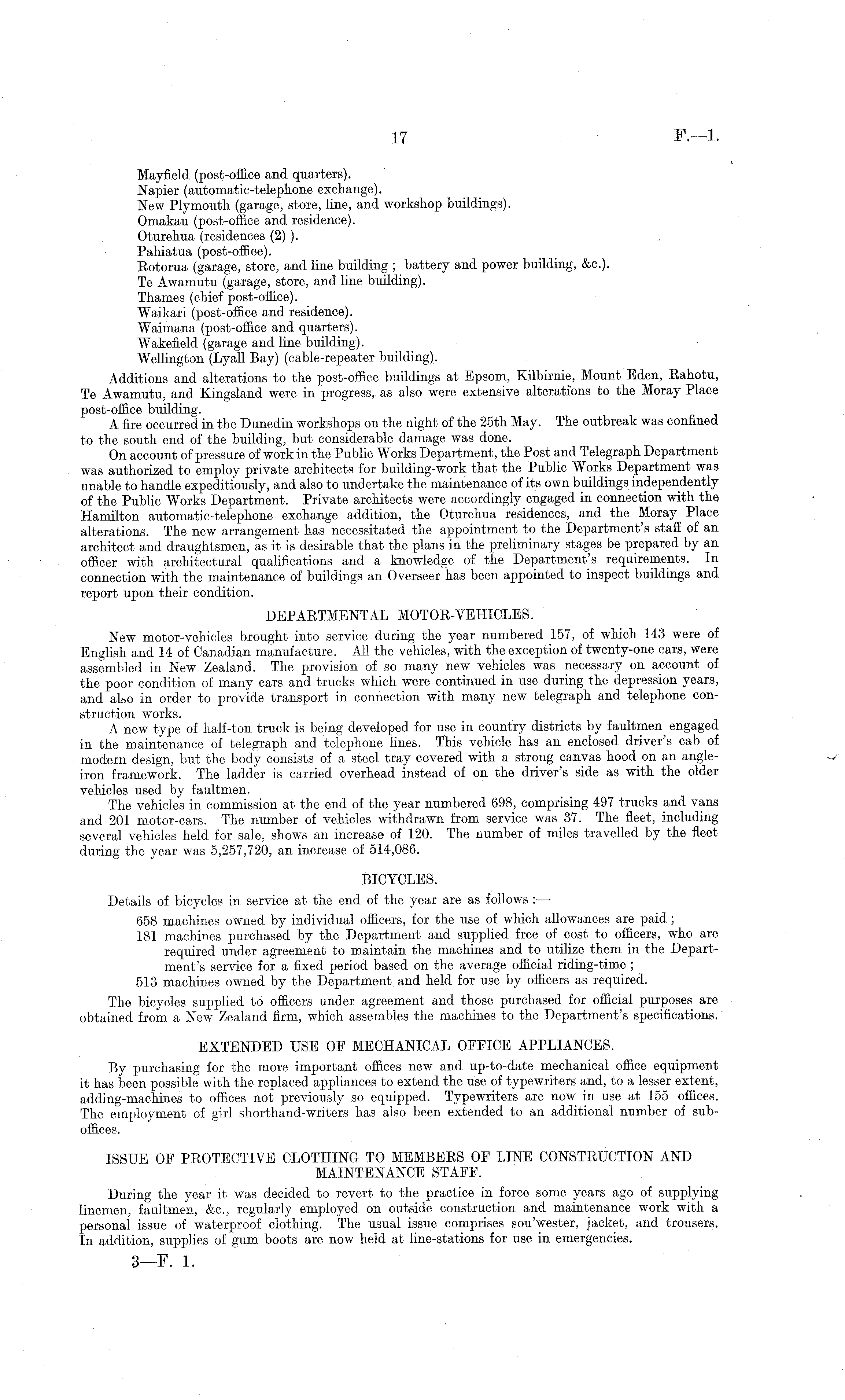 Mayfield (post-office and quarters). Napier (automatic-telephone exchange). New Plymouth (garage, store, line, and workshop buildings). Omakau (post-office and residence). Oturehua (residences (2) ). Pahiatua (post-office). Rotorua (garage, store, and line building ; battery and power building, &c.). Te Awamutu (garage, store, and line building). Thames (chief post-office). Waikari (post-office and residence). Waimana (post-office and quarters). Wakefield (garage and line building). Wellington (Lyall Bay) (cable-repeater building). Additions and alterations to the post-office buildings at Epsom, Kilbirnie, Mount Eden, Rahotu, Te Awamutu, and Kingsland were in progress, as also were extensive alterations to the Moray Place post-office building. A fire occurred in the Dunedin workshops on the night of the 25th May. The outbreak was confined to the south end of the building, but considerable damage was done. On account of pressure of work in the Public Works Department, the Post and Telegraph Department was authorized to employ private architects for building-work that the Public Works Department was unable to handle expeditiously, and also to undertake the maintenance of its own buildings independently of the Public Works Department. Private architects were accordingly engaged in connection with the Hamilton automatic-telephone exchange addition, the Oturehua residences, and the Moray Place alterations. The new arrangement has necessitated the appointment to the Department's stafl of an architect and draughtsmen, as it is desirable that the plans in the preliminary stages be prepared by an officer with architectural qualifications and a knowledge of the Department s requirements. In connection with the maintenance of buildings an Overseer has been appointed to inspect buildings and report upon their condition. DEPARTMENTAL MOTOR-VEHICLES. New motor-vehicles brought into service during the year numbered 157, of which 143 were of English and 14 of Canadian manufacture. All the vehicles, with the exception of twenty-one cars, were assembled in New Zealand. The provision of so many new vehicles was necessary on account of the poor condition of many cars and trucks which were continued in use during the depression years, and also in order to provide transport in connection with many new telegraph and telephone construction works. A new type of half-ton truck is being developed for use in country districts by faultmen engaged in the maintenance of telegraph and telephone lines. This vehicle has an enclosed driver's cab of modern design, but the body consists of a steel tray covered with a strong canvas hood on an angleiron framework. The ladder is carried overhead instead of on the driver's side as with the older vehicles used by faultmen. The vehicles in commission at the end of the year numbered 698, comprising 497 trucks and vans and 201 motor-cars. The number of vehicles withdrawn from service was 37. The fleet, including several vehicles held for sale, shows an increase of 120. The number of miles travelled by the fleet during the year was 5,257,720, an increase of 514,086. BICYCLES. Details of bicycles in service at the end of the year are as follows : — 658 machines owned by individual officers, for the use of which allowances are paid ; 181 machines purchased by the Department and supplied free of cost to officers, who are required under agreement to maintain the machines and to utilize them in the Department's service for a fixed period based on the average official riding-time ; 513 machines owned by the Department and held for use by officers as required. The bicycles supplied to officers under agreement and those purchased for official purposes are obtained from a New Zealand firm, which assembles the machines to the Department's specifications. EXTENDED USE OF MECHANICAL OFFICE APPLIANCES. By purchasing for the more important offices new and up-to-date mechanical office equipment it has been possible with the replaced appliances to extend the use of typewriters and, to a lesser extent, adding-machines to offices not previously so equipped. Typewriters are now in use at 155 offices. The employment of girl shorthand-writers has also been extended to an additional number of suboffices. ISSUE OF PROTECTIVE CLOTHING TO MEMBERS OF LINE CONSTRUCTION AND MAINTENANCE STAFF. During the year it was decided to revert to the practice in force some years ago of supplying linemen, faultmen, &c., regularly employed on outside construction and maintenance work with a personal issue of waterproof clothing. The usual issue comprises sou'wester, jacket, and trousers. In addition, supplies of gum boots are now held at line-stations for use in emergencies.