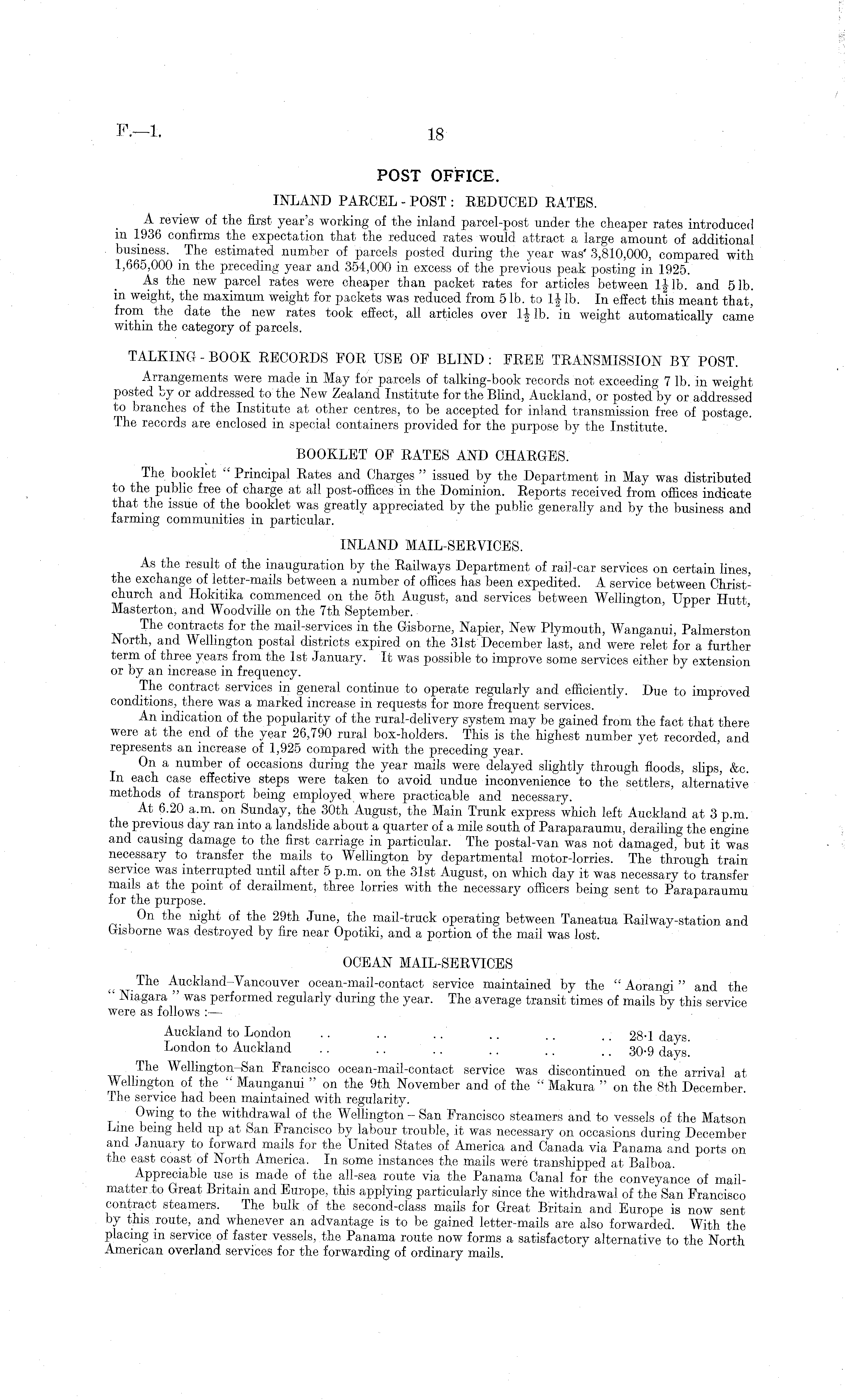 POST OFFICE. INLAND PARCEL - POST : REDUCED RATES. A review of the first year's working of the inland parcel-post under the cheaper rates introduced in 1936 confirms the expectation that the reduced rates would attract a large amount of additional business. The estimated number of parcels posted during the year was' 3,810,000, compared with 1,665,000 in the preceding year and 354,000 in excess of the previous peak posting in 192-5. As the new parcel rates were cheaper than packet rates for articles between lb. and 51b. in weight, the maximum weight for packets was reduced from 5 lb. to 1| lb. In effect this meant that, from the date the new rates took effect, all articles over 1\ lb. In weight automatically came within the category of parcels. TALKING - BOOK RECORDS FOR USE OF BLIND : FREE TRANSMISSION BY POST. Arrangements were made in May for parcels of talking-book records not exceeding 7 lb. in weight posted by or addressed to the New Zealand Institute for the Blind, Auckland, or posted by or addressed to branches of the Institute at other centres, to be accepted for inland transmission free of postage. The records are enclosed in special containers provided for the purpose by the Institute. BOOKLET OF RATES AND CHARGES. The booklet " Principal Rates and Charges " issued by the Department in May was distributed to the public free of charge at all post-offices in the Dominion. Reports received from offices indicate that the issue of the booklet was greatly appreciated by the public generally and by the business and farming communities in particular. INLAND MAIL-SERVICES. As the result of the inauguration by the Railways Department of rail-car services on certain lines, the exchange of letter-mails between a number of offices has been expedited. A service between Christchurch and Hokitika commenced on the sth August, and services between Wellington, Upper Hutt Masterton, and Woodville on the 7th September. The contracts for the mail-services in the Gisborne, Napier, New Plymouth, Wanganui, Palmerston North, and Wellington postal districts expired on the 31st December last, and were relet for a further term of three years from the Ist January. It was possible to improve some services either by extension or by an increase in frequency. The contract services in general continue to operate regularly and efficiently. Due to improved conditions, there was a marked increase in requests for more frequent services. An indication of the popularity of the rural-delivery system may be gained from the fact that there were at the end of the year 26,790 rural box-holders. This is the highest number yet recorded, and represents an increase of 1,925 compared with the preceding year. On a number of occasions during the year mails were delayed slightly through floods, slips, &c. In each case effective steps were taken to avoid undue inconvenience to the settlers, alternative methods of transport being employed where practicable and necessary. At 6.20 a.m. on Sunday, the 30th August, the Main Trunk express which left Auckland at 3 p.m. the previous day ran into a landslide about a quarter of a mile south of Paraparaumu, derailing the engine and causing damage to the first carriage in particular. The postal-van was not damaged, but it was necessary to transfer the mails to Wellington by departmental motor-lorries. The through train service was interrupted until after 5 p.m. on the 31st August, on which day it was necessary to transfer mails at the point of derailment, three lorries with the necessary officers being sent to Paraparaumu for the purpose. On the night of the 29th June, the mail-truck operating between Taneatua Railway-station and Gisborne was destroyed by fire near Opotiki, and a portion of the mail was lost. OCEAN MAIL-SERVICES The Auckland-Vancouver ocean-mail-contact service maintained by the " Aorangi " and the " Niagara " was performed regularly during the year. The average transit times of mails by this service were as follows :— Auckland to London . . . . .. .. .. ~ 28-1 days London to Auckland . . . . . . .. .. _ 39-9 days The Wellington-San Francisco ocean-mail-contact service was discontinued on the arrival at Wellington of the " Maunganui " on the 9th November and of the " Makura " on the Bth December. The service had been maintained with regularity. Owing to the withdrawal of the Wellington - San Francisco steamers and to vessels of the Matson Line being held up at San Francisco by labour trouble, it was necessary on occasions during December and January to forward mails for the United States of America and Canada via Panama and ports on the east coast of North America. In some instances the mails were transhipped at Balboa. Appreciable use is made of the all-sea route via the Panama Canal for the conveyance of mailmatter to Great Britain and Europe, this applying particularly since the withdrawal of the San Francisco contract steamers. The bulk of the second-class mails for Great Britain and Europe is now sent by this route, and whenever an advantage is to be gained letter-mails are also forwarded. With the placing in service of faster vessels, the Panama route now forms a satisfactory alternative to the North American overland services for the forwarding of ordinary mails.