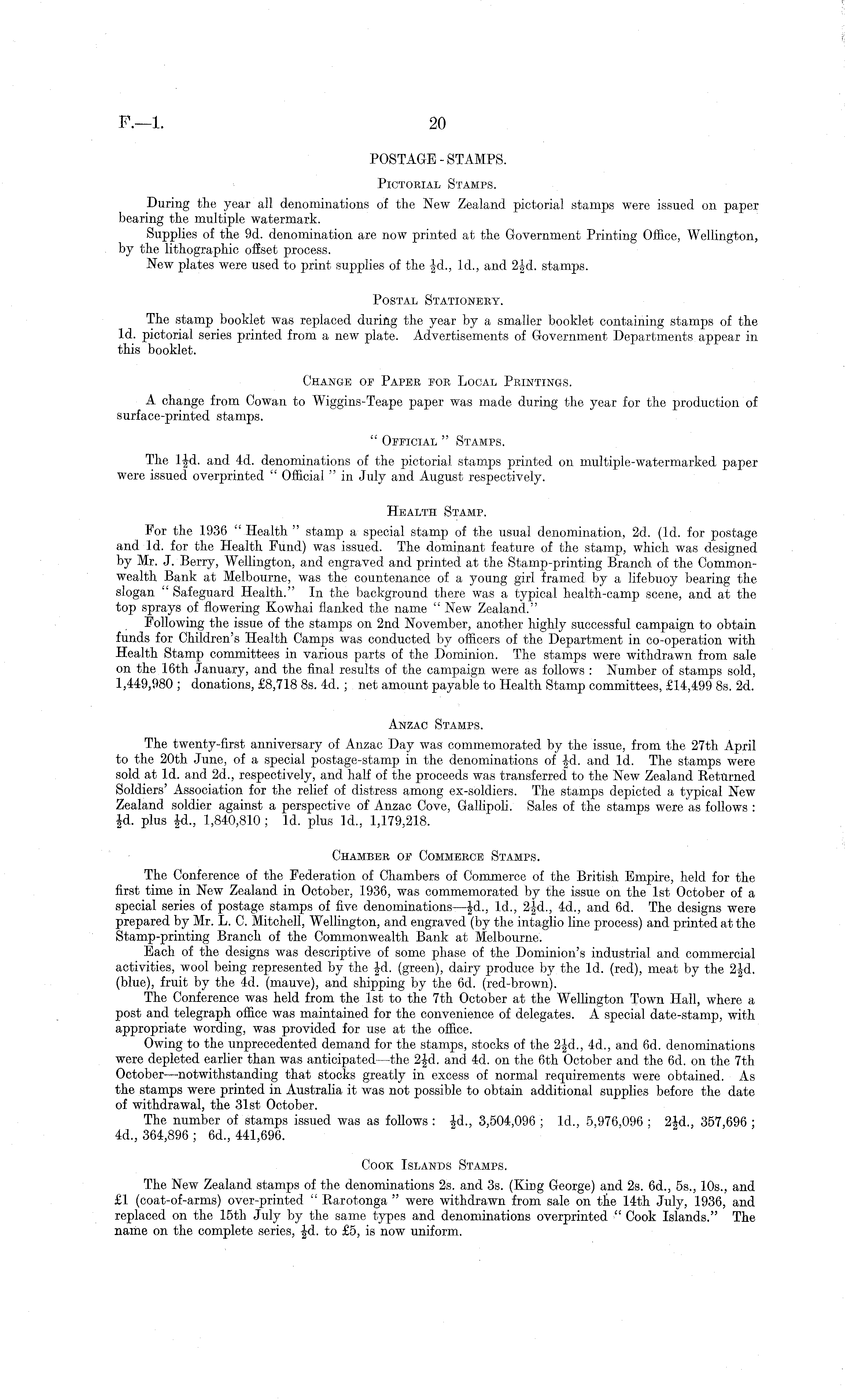 POSTAGE-STAMPS. Pictorial Stamps. During the year all denominations of the New Zealand pictorial stamps were issued on paper bearing the multiple watermark. Supplies of the 9d. denomination are now printed at the Government Printing Office, Wellington, by the lithographic offset process. New plates were used to print supplies of the |d., Id., and 2§d. stamps. Postal Stationery. The stamp booklet was replaced during the year by a smaller booklet containing stamps of the Id. pictorial series printed from a new plate. Advertisements of Government Departments appear in this booklet. Change of Paper for Local Printings. A change from Cowan to Wiggins-Teape paper was made during the year for the production of surface-printed stamps. " Official " Stamps. The l|d. and 4d. denominations of the pictorial stamps printed on multiple-watermarked paper were issued overprinted " Official " in July and August respectively. Health Stamp. For the 1936 " Health " stamp a special stamp of the usual denomination, 2d. (Id. for postage and Id. for the Health Fund) was issued. The dominant feature of the stamp, which was designed by Mr. J. Berry, Wellington, and engraved and printed at the Stamp-printing Branch of the Commonwealth Bank at Melbourne, was the countenance of a young girl framed by a lifebuoy bearing the slogan " Safeguard Health." In the background there was a typical health-camp scene, and at the top sprays of flowering Kowhai flanked the name " New Zealand." Following the issue of the stamps on 2nd November, another highly successful campaign to obtain funds for Children's Health Camps was conducted by officers of the Department in co-operation with Health Stamp committees in various parts of the Dominion. The stamps were withdrawn from sale on the 16th January, and the final results of the campaign were as follows : Number of stamps sold, 1,449,980 ; donations, £8,718 Bs. 4d. ; net amount payable to Health Stamp committees, £14,499 Bs. 2d. Anzac Stamps. The twenty-first anniversary of Anzac Day was commemorated by the issue, from the 27th April to the 20th June, of a special postage-stamp in the denominations of |-d. and Id. The stamps were sold at Id. and 2d., respectively, and half of the proceeds was transferred to the New Zealand Returned Soldiers' Association for the relief of distress among ex-soldiers. The stamps depicted a typical New Zealand soldier against a perspective of Anzac Cove, Gallipoli. Sales of the stamps were as follows : id. plus fd., 1,840,810; Id. plus Id., 1,179,218. Chamber of Commerce Stamps. The Conference of the Federation of Chambers of Commerce of the British Empire, held for the first time in New Zealand in October, 1936, was commemorated by the issue on the Ist October of a special series of postage stamps of five denominations —|d., Id., 4d., and 6d. The designs were prepared by Mr. L. C. Mitchell, Wellington, and engraved (by the intaglio line process) and printed at the Stamp-printing Branch of the Commonwealth Bank at Melbourne. Each of the designs was descriptive of some phase of the Dominion's industrial and commercial activities, wool being represented by the |-d. (green), dairy produce by the Id. (red), meat by the (blue), fruit by the 4d. (mauve), and shipping by the 6d. (red-brown). The Conference was held from the Ist to the 7th October at the Wellington Town Hall, where a post and telegraph office was maintained for the convenience of delegates. A special date-stamp, with appropriate wording, was provided for use at the office. Owing to the unprecedented demand for the stamps, stocks of the 2|d., 4d., and 6d. denominations were depleted earlier than was anticipated—the 2|d. and 4d. on the 6th October and the 6d. on the 7th October—notwithstanding that stocks greatly in excess of normal requirements were obtained. As the stamps were printed in Australia it was not possible to obtain additional supplies before the date of withdrawal, the 31st October. The number of stamps issued was as follows : |d., 3,504,096 ; Id., 5,976,096 ; 2fd., 357,696 ; 4d., 364,896 ; 6d., 441,696. Cook Islands Stamps. The New Zealand stamps of the denominations 2s. and 3s. (King George) and 2s. 6d., 55., 10s., and £1 (coat-of-arms) over-printed " Rarotonga " were withdrawn from sale on the 14th July, 1936, and replaced on the 15th July by the same types and denominations overprinted " Cook Islands." The name on the complete series, -Jd. to £5, is now uniform.