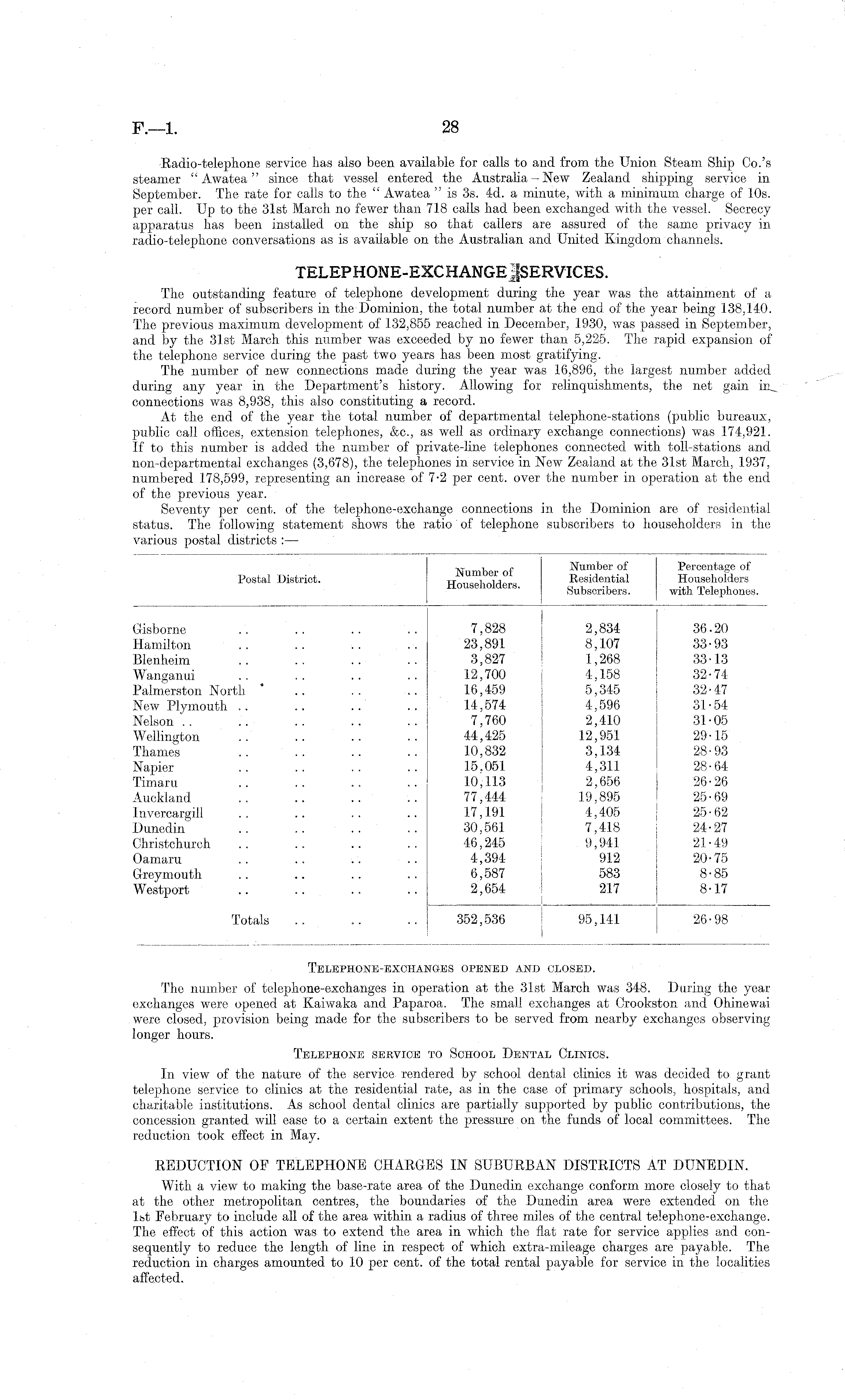 Telephone-exchanges opened and closed. The number of telephone-exchanges in operation at the 31st March was 348. During the year exchanges were opened at Kaiwaka and Paparoa. The small exchanges at Crookston and Ohinewai were closed, provision being made for the subscribers to be served from nearby exchanges observing longer hours. Telephone sebvice to School Dental Clinics. In view of the nature of the service, rendered by school dental clinics it was decided to grant telephone service to clinics at the residential rate, as in the case of primary schools, hospitals, and charitable institutions. As school dental clinics are partially supported by public contributions, the concession granted will ease to a certain extent the pressure on the funds of local committees. The reduction took effect in May. REDUCTION OF TELEPHONE CHARGES IN SUBURBAN DISTRICTS AT DUNEDIN. With a view to making the base-rate area of the Dunedin exchange conform more closely to that at the other metropolitan centres, the boundaries of the Dunedin area were extended on the Ist February to include all of the area within a radius of three miles of the central telephone-exchange. The effect of this action was to extend the area in which the flat rate for service applies and consequently to reduce the length of line in respect of which extra-mileage charges are payable. The reduction in charges amounted to 10 per cent, of the total rental payable for service in the localities affected.