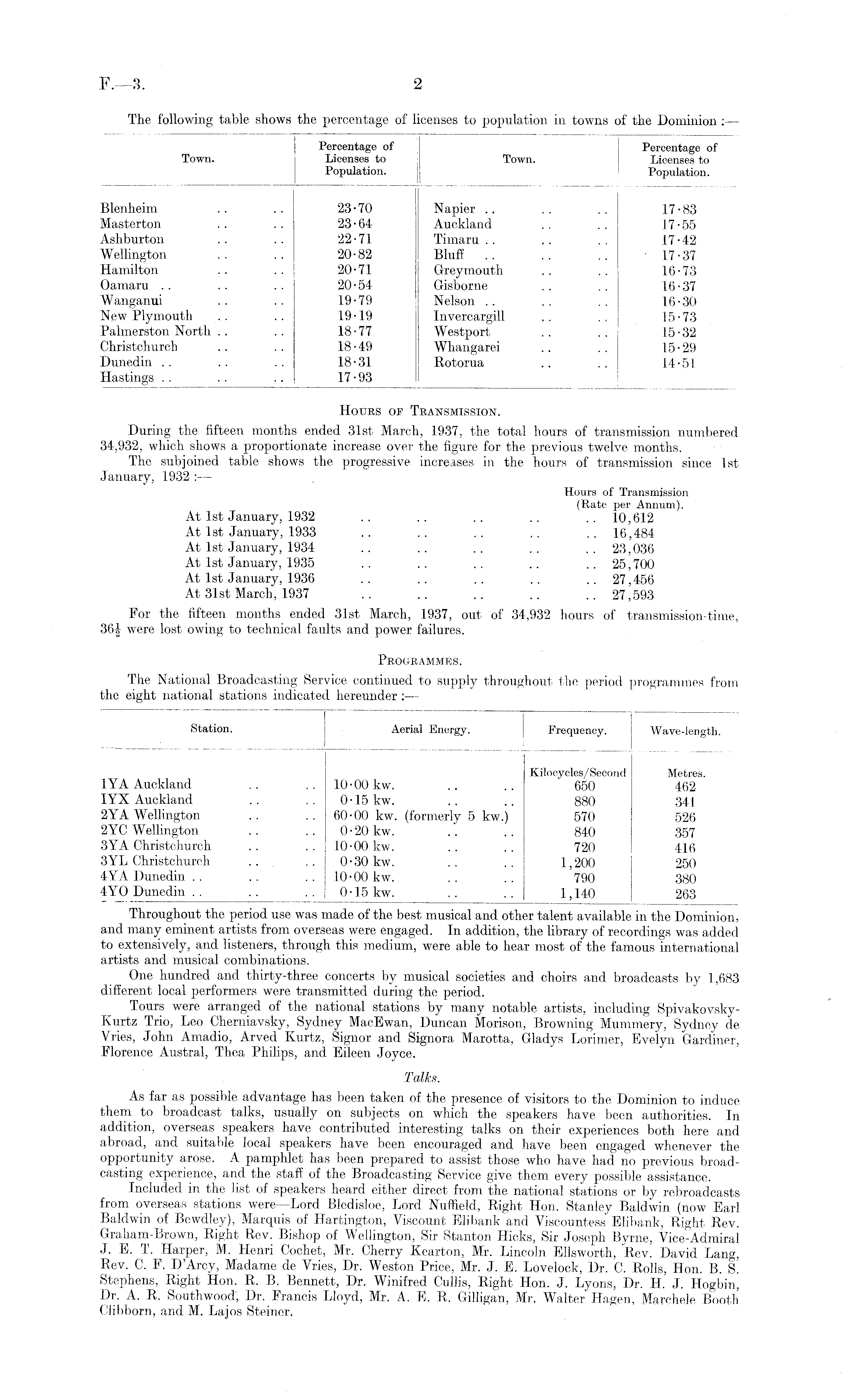 Throughout the period use was made of the best musical and other talent available in the Dominion, and many eminent artists from overseas were engaged. In addition, the library of recordings was added to extensively, and listeners, through this medium, were able to hear most of the famous international artists and musical combinations. One hundred and thirty-three concerts by musical societies and choirs and broadcasts by 1,683 different local performers were transmitted during the period. Tours were arranged of the national stations by many notable artists, including SpivakovskyKurtz Trio, Leo Cherniavsky, Sydney MacEwan, Duncan Morison, Browning Mummery, Sydney de Vries, John Amadio, Arved Kurtz, Signor and Signora Marotta, Gladys Lorimer, Evelyn Gardiner, Florence Austral, Thea Philips, and Eileen Joyce. Talks. As far as possible advantage has been taken of the presence of visitors to the Dominion to induce them to broadcast talks, usually on subjects on which the speakers have been authorities. In addition, overseas speakers have contributed interesting talks on their experiences both here and abroad, and suitable local speakers have been encouraged and have been engaged whenever the opportunity arose. A pamphlet has been prepared to assist those who have had no previous broadcasting experience, and the staff of the Broadcasting Service give them every possible assistance. Included in the list of speakers heard either direct from the national stations or by rebroadcasts from overseas stations were—Lord Bledisloe, Lord Nuffield, Right Hon. Stanley Baldwin (now Earl Baldwin of Bewdley), Marquis of Hartington, Viscount Elibank and Viscountess Elibank, Right Rev. Graham-Brown, Right Rev. Bishop of Wellington, Sir Stanton Hicks, Sir Joseph Byrne, Vice-Admiral J. E. T. Harper, M. Henri Cochet, Mr. Cherry Kearton, Mr. Lincoln Ellsworth, Rev. David Lang, Rev. C. F. DArcy, Madame de Vries, Dr. Weston Price, Mr. J. E. Lovelock, Dr. C. Rolls, Hon. B. S. Stephens, Right Hon. R. B. Bennett, Dr. Winifred Cullis, Right Hon. J. Lyons, Dr. H. J. Hogbin, Dr. A. R. Southwood; Dr. Francis Lloyd, Mr. A. E. R. Gilligan, Mr, Walter Hagen, Marchele Booth Clibborn, and M. Lajos Steiner.