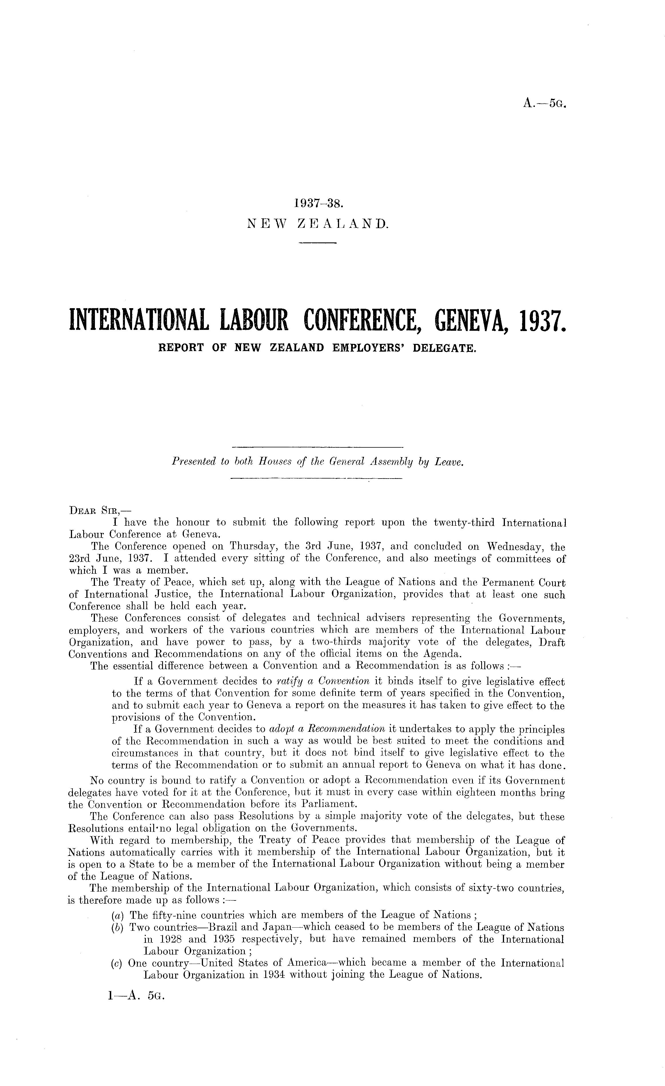 Dear Sir, — I have the honour to submit the following report upon the twenty-third International Labour Conference at Geneva. The Conference opened on Thursday, the 3rd June, 1937, and concluded on Wednesday, the 23rd June, 1937. I attended every sitting of the Conference, and also meetings of committees of which I was a member. The Treaty of Peace, which set up, along with the League of Nations and the Permanent Court of International Justice, the International Labour Organization, provides that at least one such Conference shall be held each year. These Conferences consist of delegates and technical advisers representing the Governments, employers, and workers of the various countries which are members of the International Labour Organization, and have power to pass, by a two-thirds majority vote of the delegates, Draft Conventions and Recommendations on any of the official items on the Agenda. The essential difference between a Convention and a Recommendation is as follows :— If a Government decides to ratify a Convention it binds itself to give legislative effect to the terms of that Convention for some definite term of years specified in the Convention, and to submit each year to Geneva a report on the measures it has taken to give effect to the provisions of the Convention. If a Government decides to adopt a Recommendation it undertakes to apply the principles of the Recommendation in such a way as would be best suited to meet the conditions and circumstances in that country, but it does not bind itself to give legislative effect to the terms of the Recommendation or to submit an annual report to Geneva on what it has done. No country is bound to ratify a Convention or adopt a Recommendation even if its Government delegates have voted for it at the Conference, but it must in every case within eighteen months bring the Convention or Recommendation before its Parliament. The Conference can also pass Resolutions by a simple majority vote of the delegates, but these Resolutions entail* no legal obligation on the Governments. With regard to membership, the Treaty of Peace provides that membership of the League of Nations automatically carries with it membership of the International Labour Organization, but it is open to a State to be a member of the International Labour Organization without being a member of the League of Nations. The membership of the International Labour Organization, which consists of sixty-two countries, is therefore made up as follows : — (a) The fifty-nine countries which are members of the League of Nations ; (b) Two countries —Brazil and Japan —which ceased to be members of the League of Nations in 1928 and 1935 respectively, but have remained members of the International Labour Organization ; (c) One country —United States of America —which became a member of the International Labour Organization in 1934 without joining the League of Nations.