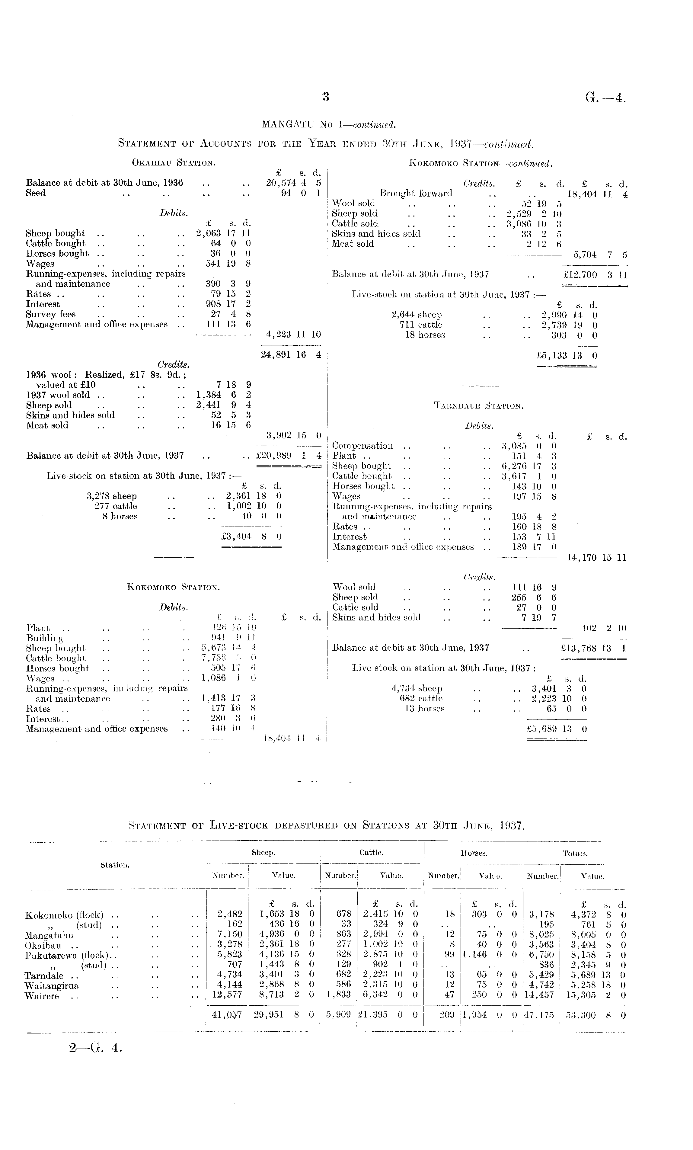 Statement of Live-stock depastured on Stations at 30th June, 1937.
