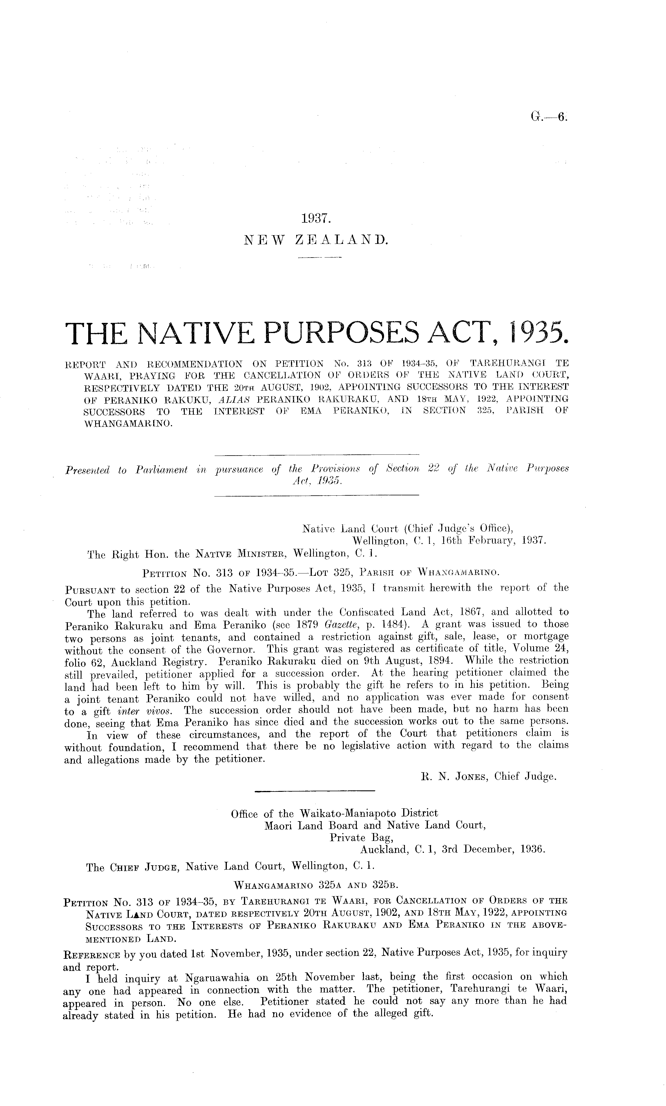 THE NATIVE PURPOSES ACT, 1935. REPORT AND RECOMMENDATION ON PETITION No. 313 OF 1934-35, OF TAREHURANGI TE WAARI, PRAYING FOR THE CANCELLATION OF ORDERS OF THE NATIVE LAND COURT, RESPECTIVELY DATED THE 20th AUGUST, 1902, APPOINTING SUCCESSORS TO THE INTEREST OF PERANIKO RAKUKU, ALIAS PERANIKO RAKURAKU, AND 18th MAY, 1922, APPOINTING SUCCESSORS TO THE INTEREST OF EMA PERANIKO, IN SECTION 325, PARISH OF WHANGAMARINO.