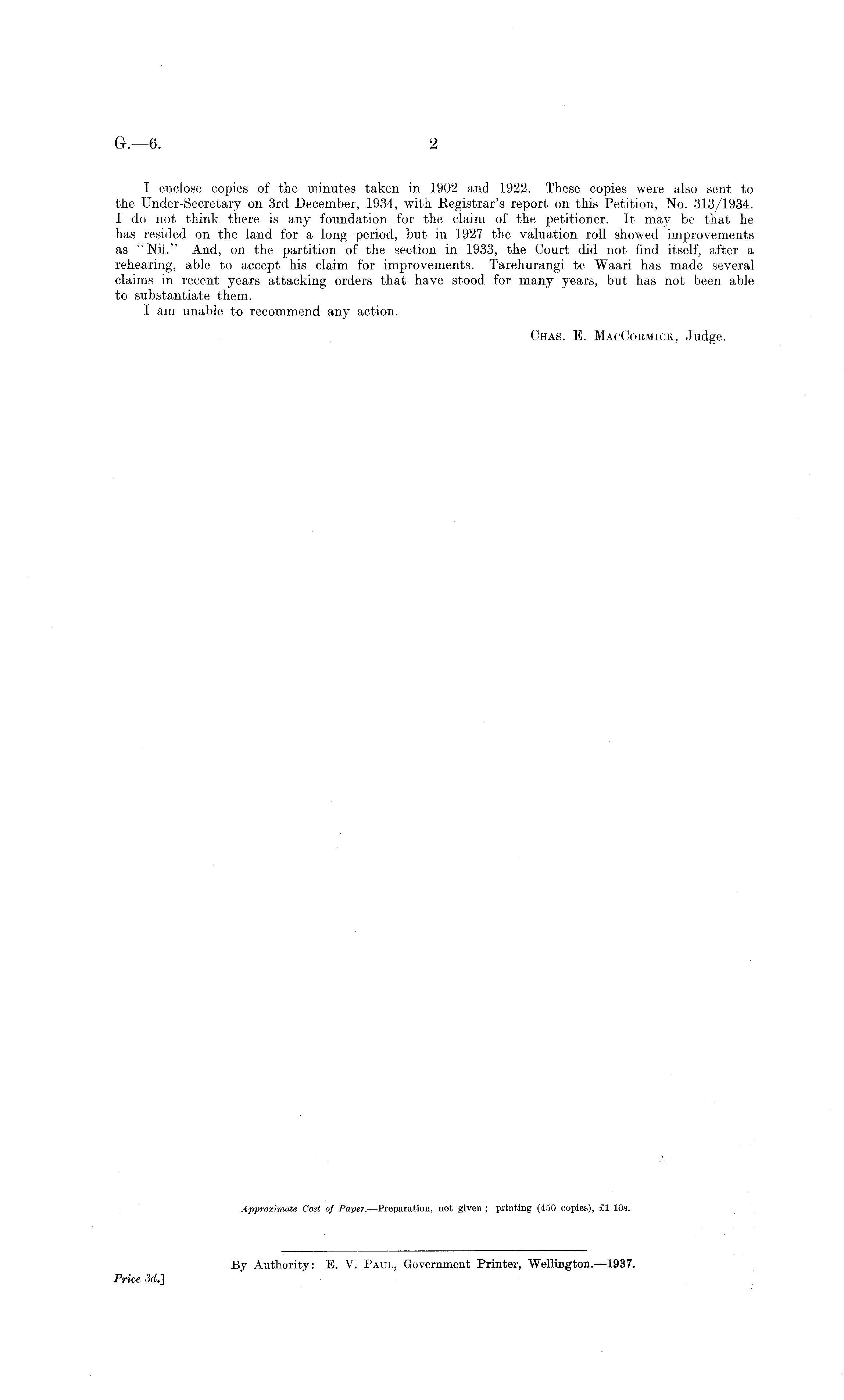 I enclose copies of the minutes taken in 1902 and 1922. These copies were also sent to the Under-Secretary on 3rd December, 1934, with Registrar's report on this Petition, No. 313/1934. I do not think there is any foundation for the claim of the petitioner. It may be that he has resided on the land for a long period, but in 1927 the valuation roll showed improvements as " Nil." And, on the partition of the section in 1933, the Court did not find itself, after a rehearing, able to accept his claim for improvements. Tarehurangi te Waari has made several claims in recent years attacking orders that have stood for many years, but has not been able to substantiate them. I am unable to recommend any action. Chas. E. MacCormick, Judge. t'' ' s■ ■ - ■'A ' ' ■ Approximate Cost of Paper.—Preparation, not given; printing (450 copies), £1 10s.