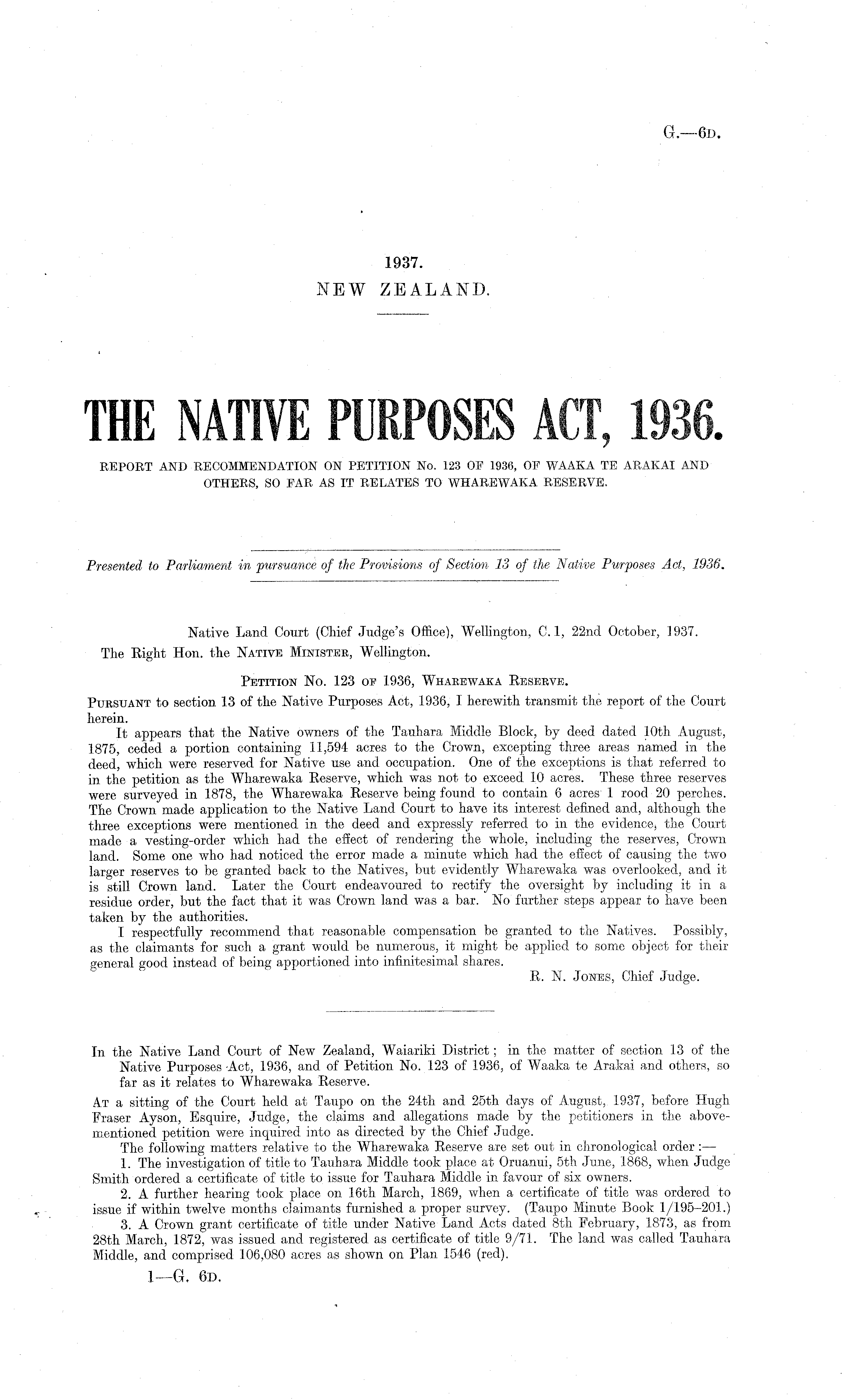 In the Native Land Court of New Zealand, Waiariki District; in the matter of section 13 of the Native Purposes Act, 1936, and of Petition No. 123 of 1936, of Waaka te Arakai. and others, so far as it relates to Wharewaka Reserve. At a sitting of the Court held at Taupo on the 24th and 25th days of August, 1937, before Hugh Fraser Ayson, Esquire, Judge, the claims and allegations made by the petitioners in the abovementioned petition were inquired into as directed by the Chief Judge. The following matters relative to the Wharewaka Reserve are set out in chronological order : — 1. The investigation of title to Tauhara Middle took place at Oruanui, sth June, 1868, when Judge Smith ordered a certificate of title to issue for Tauhara Middle in favour of six owners. 2. A further hearing took place on 16th March, 1869, when a certificate of title was ordered to issue if within twelve months claimants furnished a proper survey. (Taupo Minute Book 1/195-201.) 3. A Crown grant certificate of title under Native Land Acts dated Bth February, 1873, as from 28th March, 1872, was issued and registered as certificate of title 9/71. The land was called Tauhara Middle, and comprised 106,080 acres as shown on Plan 1546 (red). I—G,1 —G, 6D.