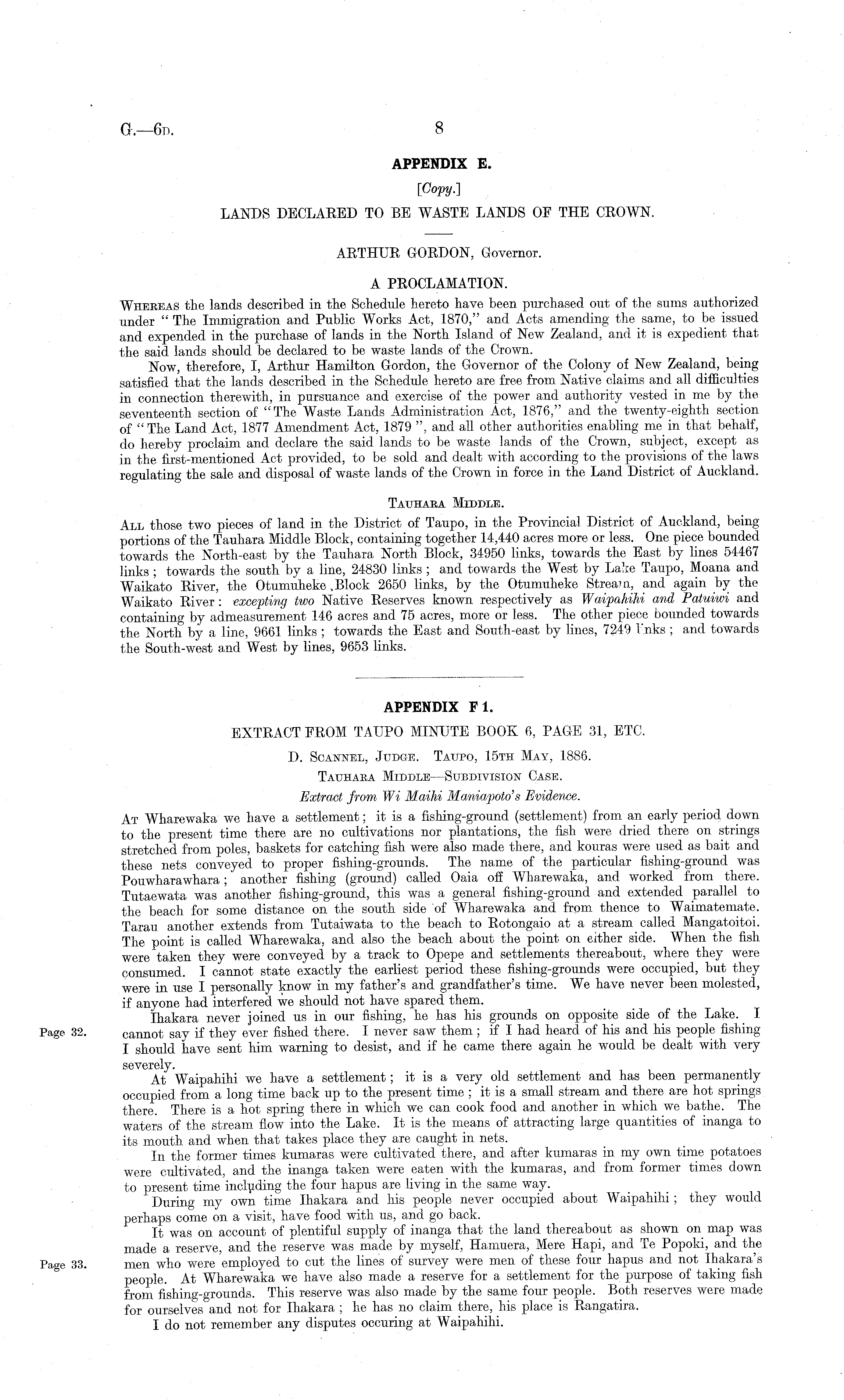 APPENDIX Fl. EXTRACT FROM TAUPO MINUTE BOOK 6, PAGE 31, ETC. D. Scannel, Judge. Taupo, 15th May, 1886. Tauhara Middle—Subdivision Case. Extract from Wi M.aihi Maniapoto's Evidence. At Wharewaka we have a settlement; it is a fishing-ground (settlement) from an early period down to the present time there are no cultivations nor plantations, the fish were dried there on strings stretched from poles, baskets for catching fish were also made there, and kouras were used as bait and these nets conveyed to proper fishing-grounds. The name of the particular fishing-ground was Pouwharawhara; another fishing (ground) called Oaia off Wharewaka, and worked from there. Tutaewata was another fishing-ground, this was a general fishing-ground and extended parallel to the beach for some distance on the south side of Wharewaka and from thence to Waimatemate. Tarau another extends from Tutaiwata to the beach to Rotongaio at a stream called Mangatoitoi. The point is called Wharewaka, and also the beach about the point on either side. When the fish were taken they were conveyed by a track to Opepe and settlements thereabout, where they were consumed. I cannot state exactly the earliest period these fishing-grounds were occupied, but they were in use I personally know in my father's and grandfather's time. We have never been molested, if anyone had interfered we should not have spared them. Ihakara never joined us in our fishing, he has his grounds on opposite side of the Lake. I cannot say if they ever fished there. I never saw them ; if I had heard of his and his people fishing I should have sent him warning to desist, and if he came there again he would be dealt with very severely. At Waipahihi we have a settlement; it is a very old settlement and has been permanently occupied from a long time back up to the present time ; it is a small stream and there are hot springs there. There is a hot spring there in which we can cook food and another in which we bathe. The waters of the stream flow into the Lake. It is the means of attracting large quantities of inanga to its mouth and when that takes place they are caught in nets. In the former times kumaras were cultivated there, and after kumaras in my own time potatoes were cultivated, and the inanga taken were eaten with the kumaras, and from former times down to present time including the four hapus are living in the same way. During my own time Ihakara and his people never occupied about Waipahihi; they would perhaps come on a visit, have food with us, and go back. It was on account of plentiful supply of inanga that the land thereabout as shown on map was made a reserve, and the reserve was made by myself, liamuera, Mere Hapi, and Te Popoki, and the men who were employed to cut the lines of survey were men of these four hapus and not Ihakara's people. At Wharewaka we have also made a reserve for a settlement for the purpose of taking fish from fishing-grounds. This reserve was also made by the same four people. Both reserves were made for ourselves and not for Ihakara ; he has no claim there, his place is Rangatira. I do not remember any disputes occuring at Waipahihi.
