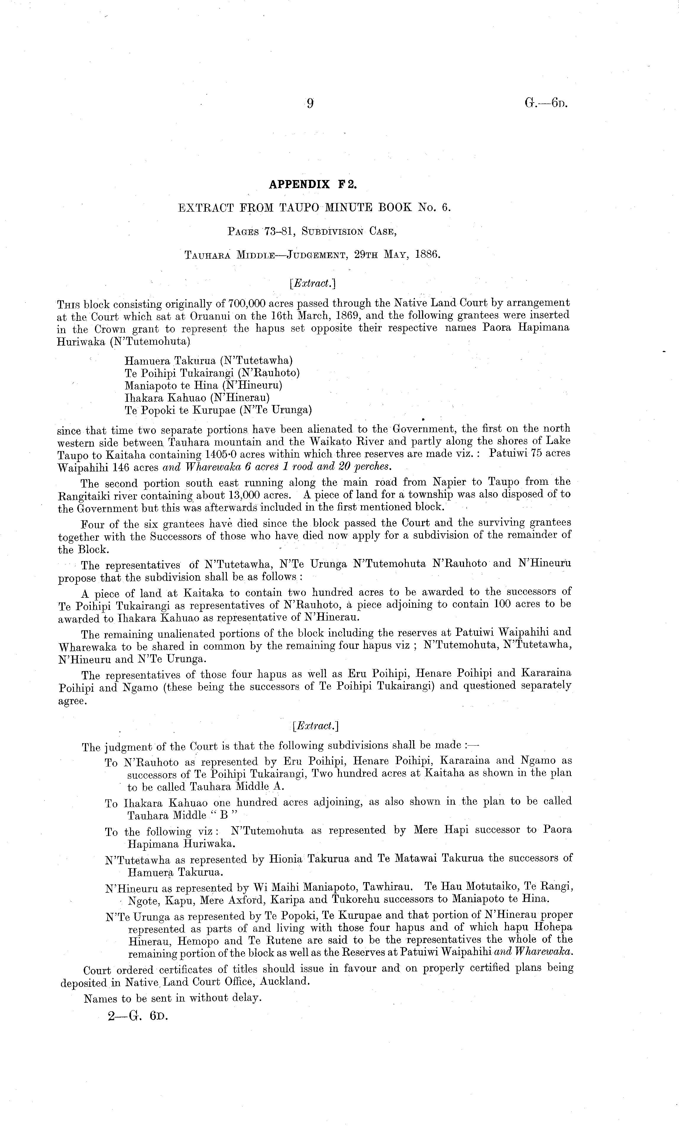 APPENDIX F2. EXTRACT FROM TAUPO MINUTE BOOK No. 6. Pages 73-81, Subdivision Case, Tauhaka Middle —Judgement, 29th May, 1886. [Extract.] This block consisting originally of 700,000 acres passed through the Native Land Court by arrangement at the Court which sat at Oruanui on the 16th March, 1869, and the following grantees were inserted in the Crown grant to represent the hapus set opposite their respective names Paora Hapimana Huriwaka (N'Tutemohuta) Hamuera Takurua (N'Tutetawha) Te Poihipi Tukairangi (N'Rauhoto) Maniapoto te Hina (N'Hineuru) Ihakara Kahuao (N'Hinerau) Te Popoki te Kurupae (N'Te Urunga) since that time two separate portions have been alienated to the Government, the first on the north western side between Tauhara mountain and the Waikato River and partly along the shores of Lake Taupo to Kaitaha containing 1405-0 acres within which three reserves are made viz. : Patuiwi 75 acres Waipahihi 146 acres and Wharewaka 6 acres 1 rood and 20 perches. The second portion south east running along the main road from Napier to Taupo from the Rangitaiki river containing about 13,000 acres. A piece of land for a township was also disposed of to the Government but this was afterwards included in the first mentioned block. Four of the six grantees have died since the block passed the Court and the surviving grantees together with the Successors of those who have died now apply for a subdivision of the remainder of the Block. The representatives of N'Tutetawha, N'Te Urunga N'Tutemohuta N'Rauhoto and N'Hineuru propose that the subdivision shall be as follows : A piece of land at Kaitaka to contain two hundred acres to be awarded to the successors of Te Poihipi Tukairangi as representatives of N'Rauhoto, a piece adjoining to contain 100 acres to be awarded to Ihakara Kahuao as representative of N'Hinerau. The remaining unalienated portions of the block including the reserves at Patuiwi Waipahihi and Wharewaka to be shared in common by the remaining four hapus viz ; N'Tutemohuta, N'Tutetawha, N'Hineuru and N'Te Urunga. The representatives of those four hapus as well as Eru Poihipi, Henare Poihipi and Kararaina Poihipi and Ngamo (these being the successors of Te Poihipi Tukairangi) and questioned separately agree. [Extract.] The judgment of the Court is that the following subdivisions shall be made : — To N'Rauhoto as represented by Eru Poihipi, Henare Poihipi, Kararaina and Ngamo as successors of Te Poihipi Tukairangi, Two hundred acres at Kaitaha as shown in the plan to be called Tauhara Middle A. To Ihakara Kahuao one hundred acres adjoining, as also shown in the plan to be called Tauhara Middle " B " To the following viz : N'Tutemohuta as represented by Mere Hapi successor to Paora Hapimana Huriwaka. N'Tutetawha as represented by Hionia Takurua and Te Matawai Takurua the successors of Hamuera Takurua. N'Hineuru as represented by Wi Maihi Maniapoto, Tawhirau. Te Hau Motutaiko, Te Rangi, Ngote, Kapu, Mere Axford, Karipa and Tukorehu successors to Maniapoto te Hina. N'Te Urunga as represented by Te Popoki, Te Kurupae and that portion of N'Hinerau proper represented as parts of and living with those four hapus and of which hapu Hohepa Hinerau, Heinopo and Te Rutene are said to be the representatives the whole of the remaining portion of the block as well as the Reserves at Patuiwi Waipahihi and Wharewaka. Court ordered certificates of titles should issue in favour and on properly certified plans being deposited in Native, Land Court Office, Auckland. Names to be sent in without delay. 2—Gr. 6D.