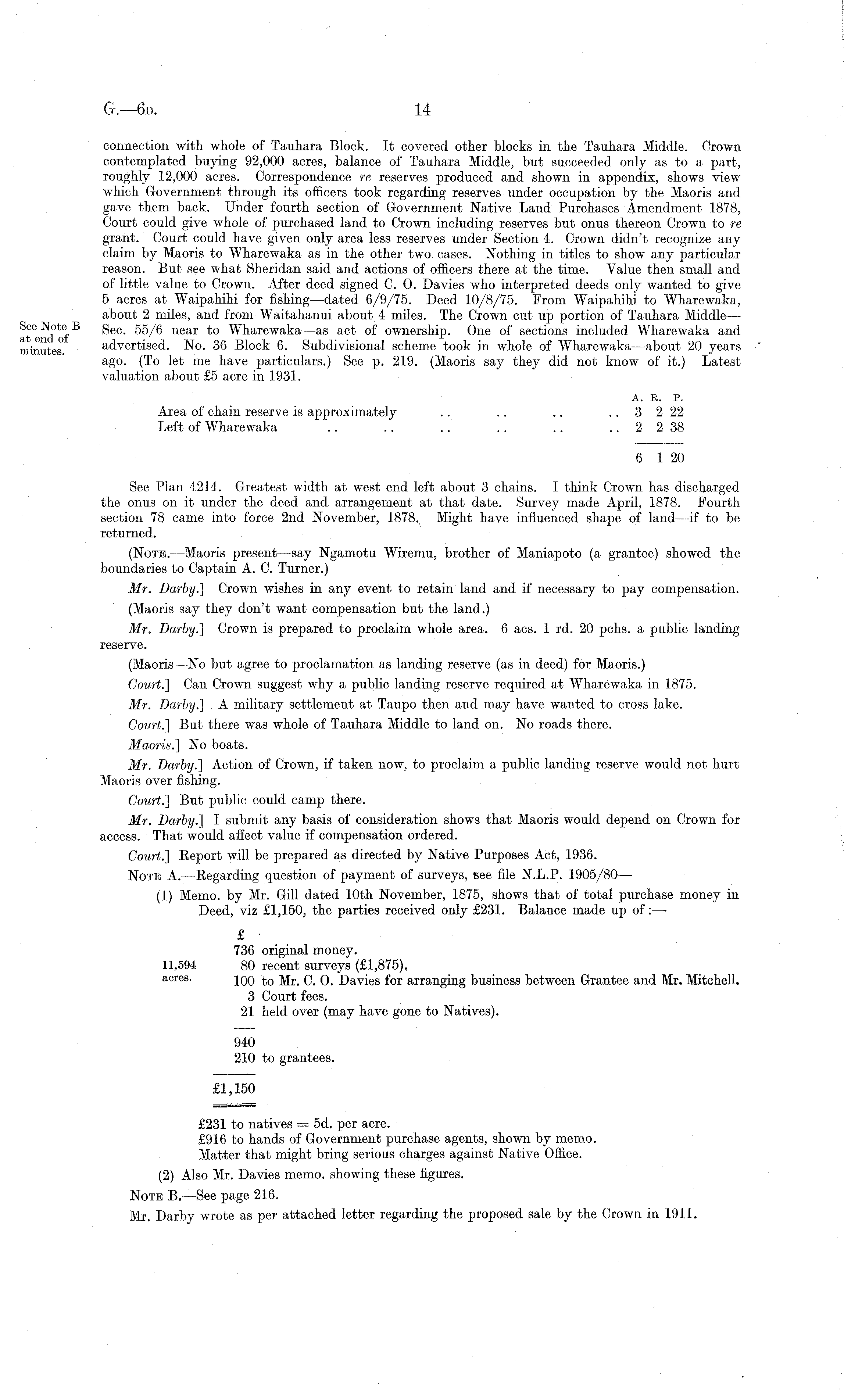 connection with whole of Tauhara Block. It covered other blocks in the Tauhara Middle. Grown contemplated buying 92,000 acres, balance of Tauhara Middle, but succeeded only as to a part, roughly 12,000 acres. Correspondence re reserves produced and shown in appendix, shows view which Government through its officers took regarding reserves under occupation by the Maoris and gave them back. Under fourth section of Government Native Land Purchases Amendment 1878, Court could give whole of purchased land to Crown including reserves but onus thereon Crown to re grant. Court could have given only area less reserves under Section 4. Crown didn't recognize any claim by Maoris to Wharewaka as in the other two cases. Nothing in titles to show any particular reason. But see what Sheridan said and actions of officers there at the time. Value then small and of little value to Crown. After deed signed C. O. Davies who interpreted deeds only wanted to give 5 acres at Waipahihi for fishing —dated 6/9/75. Deed 10/8/75. From Waipahihi to Wharewaka, about 2 miles, and from Waitahanui about 4 miles. The Crown cut up portion of Tauhara Middle — Sec. 55/6 near to Wharewaka—as act of ownership. One of sections included Wharewaka and advertised. No. 36 Block 6. Subdivisional scheme took in whole of Wharewaka —about 20 years ago. (To let me have particulars.) See p. 219. (Maoris say they did not know of it.) Latest valuation about £5 acre in 1931. A. e. p. Area of chain reserve is approximately . . .. .. 3 2 22 Left of Wharewaka .. .. .. .. .. .. 22 38 6 1 20 See Plan 4214. Greatest width at west end left about 3 chains. I think Crown has discharged the onus on it under the deed and arrangement at that date. Survey made April, 1878. Fourth section 78 came into force 2nd November, 1878. Might have influenced shape of land —if to be returned. (Note. —Maoris present—say Ngamotu Wiremu, brother of Maniapoto (a grantee) showed the boundaries to Captain A. C. Turner.) Mr. Darby.'] Crown wishes in any event to retain land and if necessary to pay compensation. (Maoris say they don't want compensation but the land.) Mr. Darby.] Crown is prepared to proclaim whole area. 6 acs. 1 rd. 20 pclis. a public landing reserve. (Maoris —No but agree to proclamation as landing reserve (as in deed) for Maoris.) Court.] Can Crown suggest why a public landing reserve required at Wharewaka in 1875. Mr. Darby.] A military settlement at Taupo then and may have wanted to cross lake. Court.] But there was whole of Tauhara Middle to land on. No roads there. Maoris.] No boats. Mr. Darby.] Action of Crown, if taken now, to proclaim a public landing reserve would not hurt Maoris over fishing. Court.] But public could camp there. Mr. Darby.] I submit any basis of consideration shows that Maoris would depend on Crown for access. That would aflect value if compensation ordered. Court.] Report will be prepared as directed by Native Purposes Act, 1936. Note A. —Regarding question of payment of surveys, see file N.L.P. 1905/80 — (1) Memo, by Mr. Gill dated 10th November, 1875, shows that of total purchase money in Deed, viz £1,150, the parties received only £231. Balance made up of:—- £ • 736 original money. 11,594 80 recent surveys (£1,875). acres. 100 to Mr. C. 0. Davies for arranging business between Grantee and Mr. Mitchell. 3 Court fees. 21 held over (may have gone to Natives). 940 210 to grantees. £1,150 £231 to natives = sd. per acre. £916 to hands of Government purchase agents, shown by memo. Matter that might bring serious charges against Native Office. (2) Also Mr. Davies memo, showing these figures. Note B. —See page 216. Mr. Darby wrote as per attached letter regarding the proposed sale by the Crown in 1911.
