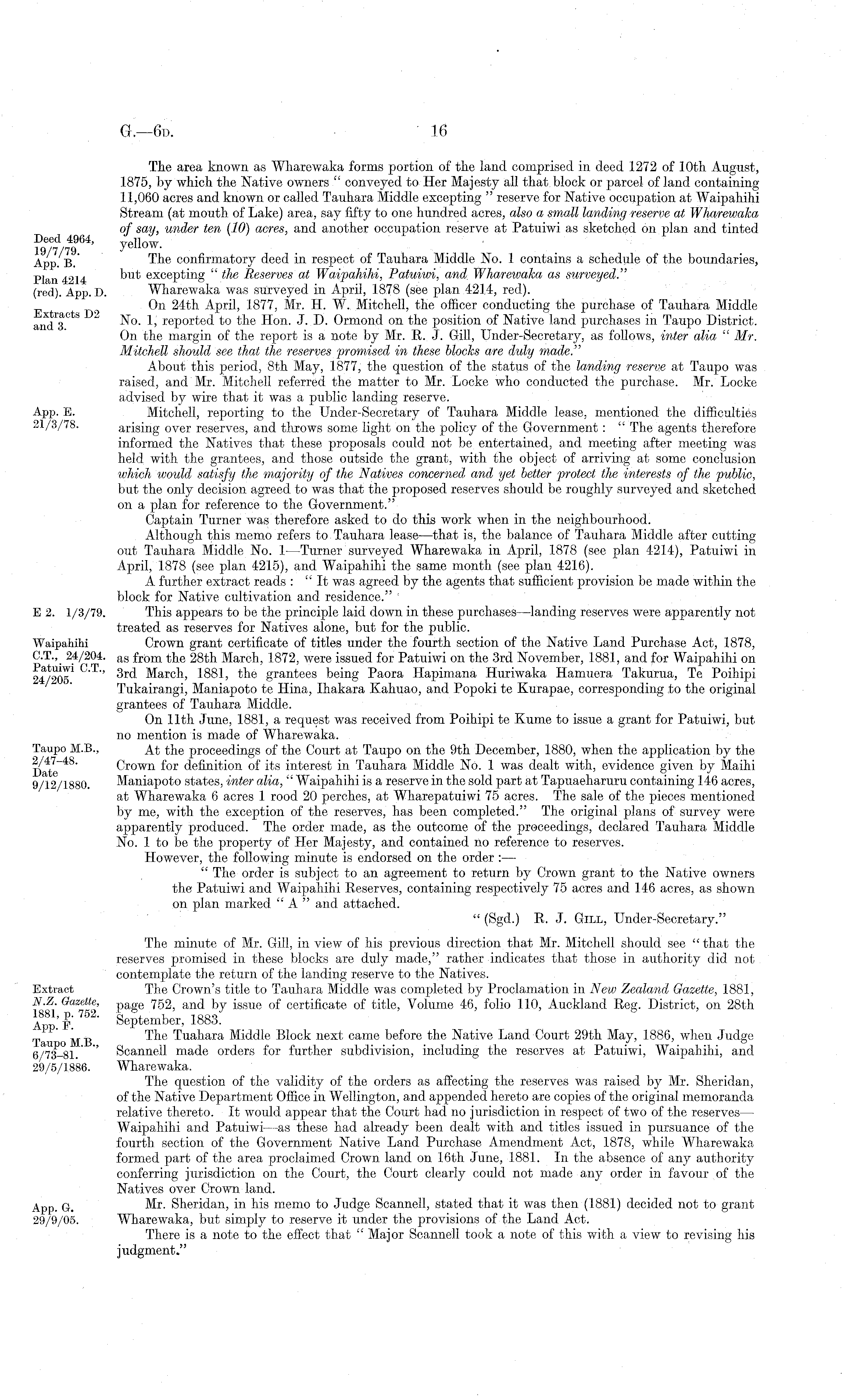 The area known as Wliarewaka forms portion of tlie land comprised in deed 1272 of 10th August, 1875, by which the Native owners " conveyed to Her Majesty all that block or parcel of land containing 11,060 acres and known or called Tauhara Middle excepting " reserve for Native occupation at Waipahihi Stream (at mouth of Lake) area, say fifty to one hundred acres, also a small landing reserve at Wharewaka of say, under ten (10) acres, and another occupation reserve at Patuiwi as sketched on plan and tinted yellow. The confirmatory deed in respect of Tauhara Middle No. 1 contains a schedule of the boundaries, but excepting " the Reserves at Waipahihi, Patuiwi, and Wharewaka as surveyed Wharewaka was surveyed in April, 1878 (see plan 4214, red). On 24th April, 1877, Mr. H. W. Mitchell, the officer conducting the purchase of Tauhara Middle No. 1, reported to the Hon. J. D. Ormond on the position of Native land purchases in Taupo District. On the margin of the report is a note by Mr. R. J. Gill, Under-Secretary, as follows, inter alia " Mr. Mitchell should see that the reserves promised in these blocks are duly made." About this period, Bth May, 1877, the question of the status of the landing reserve at Taupo was raised, and Mr. Mitchell referred the matter to Mr. Locke who conducted the purchase. Mr. Locke advised by wire that it was a public landing reserve. Mitchell, reporting to the Under-Secretary of Tauhara Middle lease, mentioned the difficulties arising over reserves, and throws some light on the policy of the Government : " The agents therefore informed the Natives, that these proposals could not be entertained, and meeting after meeting was held with the grantees, and those outside the grant, with the object of arriving at some conclusion which would satisfy the majority of the Natives concerned and yet better protect the interests of the public, but the only decision agreed to was that the proposed reserves should be roughly surveyed and sketched on a plan for reference to the Government." Captain Turner was therefore asked to do this work when in the neighbourhood. Although this memo refers to Tauhara lease —that is, the balance of Tauhara Middle after cutting out Tauhara Middle No. I—Turner1 —Turner surveyed Wharewaka in April, 1878 (see plan 4214), Patuiwi in April, 1878 (see plan 4215), and Waipahihi the same month (see plan 4216). A further extract reads : "It was agreed by the agents that sufficient provision be made within the block for Native cultivation and residence." This appears to be the principle laid down in these purchases —landing reserves were apparently not treated as reserves for Natives alone, but for the public. Crown grant certificate of titles under the fourth section of the Native Land Purchase Act, 1878, as from the 28th March, 1872, were issued for Patuiwi on the 3rd November, 1881, and for Waipahihi on 3rd March, 1881, the grantees being Paora Hapimana Huriwaka Hamuera Takurua, Te Poihipi Tukairangi, Maniapoto te Hina, Ihakara Kahuao, and Popoki te Kurapae, corresponding to the original grantees of Tauhara Middle. On 11th June, 1881, a request was received from Poihipi te Kume to issue a grant for Patuiwi, but no mention is made of Wharewaka. At the proceedings of the Court at Taupo on the 9th December, 1880, when the application by the Crown for definition of its interest in Tauhara Middle No. I was dealt with, evidence given by Maihi Maniapoto states, inter alia, " Waipahihi is a reserve in the sold part at Tapuaeharuru containing 146 acres, at Wharewaka 6 acres 1 rood 20 perches, at Wharepatuiwi 75 acres. The sale of the pieces mentioned by me, with the exception of the reserves, has been completed." The original plans of survey were apparently produced. The order made, as the outcome of the proceedings, declared Tauhara Middle No. 1 to be the property of Her Majesty, and contained no reference to reserves. However, the following minute is endorsed on the order : — " The order is subject to an agreement to return by Crown grant to the Native owners the Patuiwi and Waipahihi Reserves, containing respectively 75 acres and 146 acres, as shown on plan marked " A " and attached. " (Sgd.) R. J. Gill, Under-Secretary." The minute of Mr. Gill, in view of his previous direction that Mr. Mitchell should see " that the reserves promised in these blocks are duly made," rather indicates that those in authority did not contemplate the return of the landing reserve to the Natives. The Crown's title to Tauhara Middle was completed by Proclamation in New Zealand Gazette, 1881, page 752, and by issue of certificate of title, Volume 46, folio 110, Auckland Reg. District, on 28th September, 1883. The Tuahara Middle Block next came before the Native Land Court 29th May, 1886, when Judge Scannell made orders for further subdivision, including the reserves at Patuiwi, Waipahihi, and Wharewaka. The question of the validity of the orders as affecting the reserves was raised by Mr. Sheridan, of the Native Department Office in Wellington, and appended hereto are copies of the original memoranda relative thereto. It would appear that the Court had no jurisdiction in respect of two of the reserves — Waipahihi and Patuiwi—as these had already been dealt with and titles issued in pursuance of the fourth section of the Government Native Land Purchase Amendment Act, 1878, while Wharewaka formed part of the area proclaimed Crown land on 16th June, 1881. In the absence of any authority conferring jurisdiction on the Court, the Court clearly could not made any order in favour of the Natives over Crown land. Mr. Sheridan, in his memo to Judge Scannell, stated that it was then (1881) decided not to grant Wharewaka, but simply to reserve it under the provisions of the Land Act. There is a note to the effect that " Major Scannell took a note of this with a view to revising his judgment."