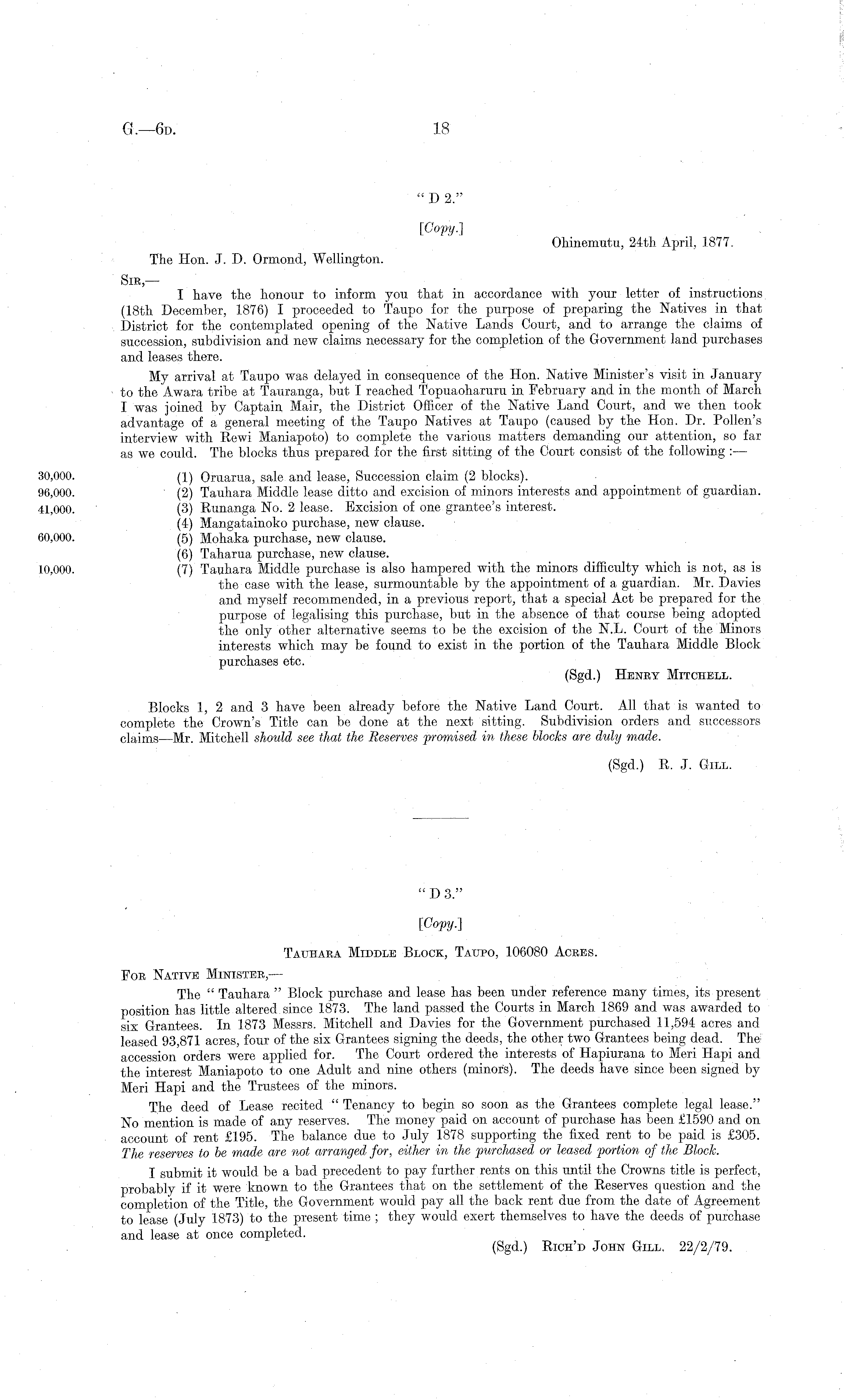 "D2." [Copy.] Ohinemutu, 24th April, 1877. The Hon. J. D. Ormond, Wellington. Sir, — I have the honour to inform you that in accordance with your letter of instructions (18th December, 1876) I proceeded to Taupo for the purpose of preparing the Natives in that District for the contemplated opening of the Native Lands Court, and to arrange the claims of succession, subdivision and new claims necessary for the completion of the Government land purchases and leases there. My arrival at Taupo was delayed in consequence of the Hon. Native Minister's visit in January to the Awara tribe at Tauranga, but I reached Topuaoharuru in February and in the month of March I was joined by Captain Mair, the District Officer of the Native Land Court, and we then took advantage of a general meeting of the Taupo Natives at Taupo (caused by the Hon. Dr. Follen's interview with Bewi Maniapoto) to complete the various matters demanding our attention, so far as we could. The blocks thus prepared for the first sitting of the Court consist of the following : — (1) Oruarua, sale and lease, Succession claim (2 blocks). (2) Tauhara Middle lease ditto and excision of minors interests and appointment of guardian. (3) Bunanga No. 2 lease. Excision of one grantee's interest. (4) Mangatainoko purchase, new clause. (5) Mohaka purchase, new clause. (6) Taharua purchase, new clause. (7) Tauhara Middle purchase is also hampered with the minors difficulty which is not, as is the case with the lease, surmountable by the appointment of a guardian. Mr. Davies and myself recommended, in a previous report, that a special Act be prepared for the purpose of legalising this purchase, but in the absence of that course being adopted the only other alternative seems to be the excision of the NX. Court of the Minors interests which may be found to exist in the portion of the Tauhara Middle Block purchases etc. (Sgd.) Henry Mitchell. Blocks 1, 2 and 3 have been already before the Native Land Court. All that is wanted to complete the Crown's Title can be done at the next sitting. Subdivision orders and successors claims —Mr. Mitchell should see that the Reserves promised in these blocks are duly made. (Sgd.) B. J. Gill.