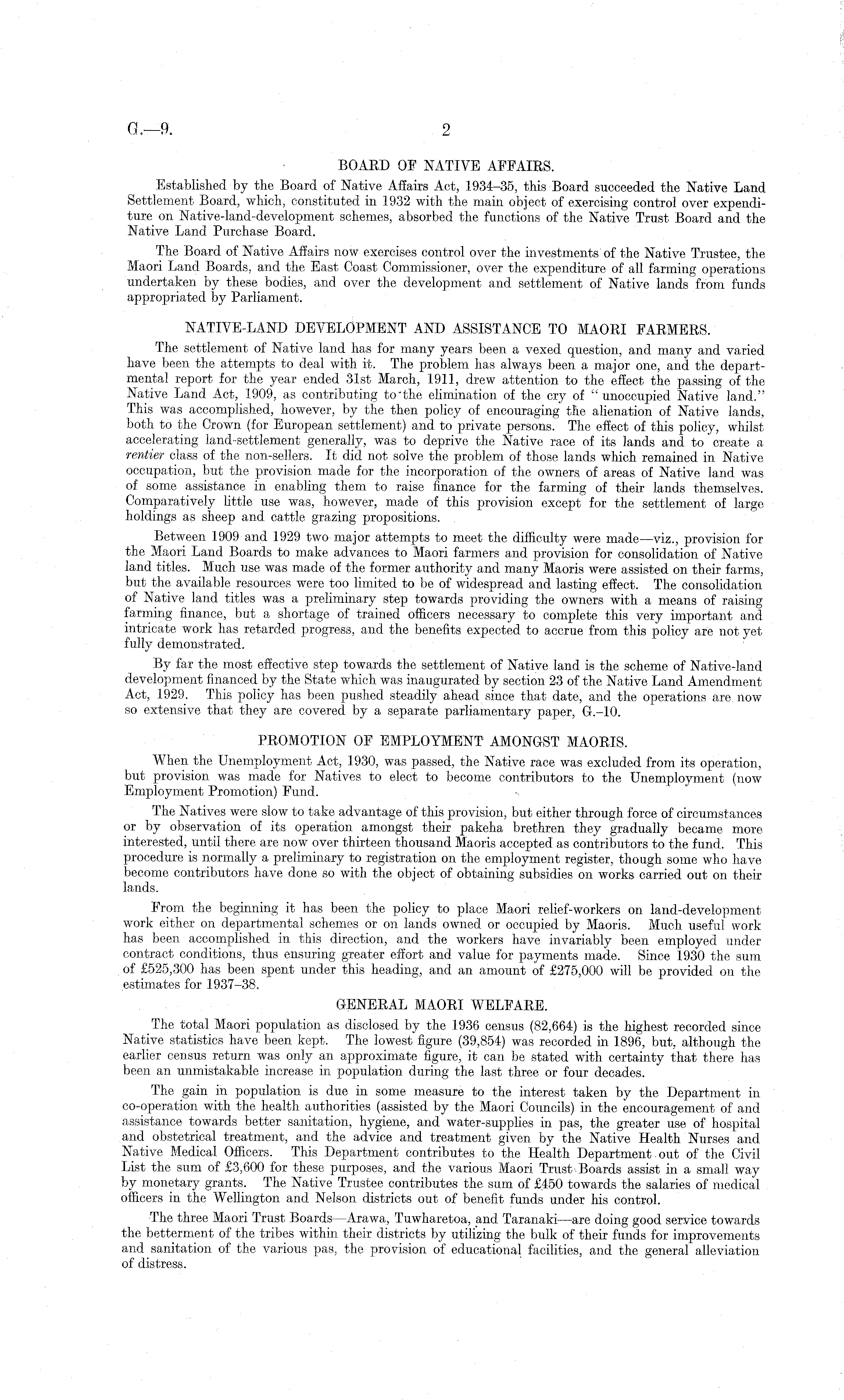BOARD OP NATIVE AFFAIRS. Established by the Board of Native Affairs Act, 1934-35, this Board succeeded the Native Land Settlement Board, which, constituted in 1932 with the main object of exercising control over expenditure on Native-land-development schemes, absorbed the functions of the Native Trust Board and the Native Land Purchase Board. The Board of Native Affairs now exercises control over the investments of the Native Trustee, the Maori Land Boards, and the East Coast Commissioner, over the expenditure of all farming operations undertaken by these bodies, and over the development and settlement of Native lands from funds appropriated by Parliament. NATIVE-LAND DEVELOPMENT AND ASSISTANCE TO MAORI FARMERS. The settlement of Native land has for many years been a vexed question, and many and varied have been the attempts to deal with it. The problem has always been a major one, and the departmental report for the year ended 31st March, 1911, drew attention to the effect the passing of the Native Land Act, 1909, as contributing to'the elimination of the cry of "unoccupied Native land." This was accomplished, however, by the then policy of encouraging the alienation of Native lands, both to the Crown (for European settlement) and to private persons. The effect of this policy, whilst accelerating land-settlement generally, was to deprive the Native race of its lands and to' create a rentier class of the non-sellers. It did not solve the problem of those lands which remained in Native occupation, but the provision made for the incorporation of the owners of areas of Native land was of some assistance in enabling them to raise finance for the farming of their lands themselves. Comparatively little use was, however, made of this provision except for the settlement of large holdings as sheep and cattle grazing propositions. Between 1909 and 1929 two major attempts to meet the difficulty were made —viz., provision for the Maori Land Boards to make advances to Maori farmers and provision for consolidation of Native land titles. Much use was made of the former authority and many Maoris were assisted on their farms, but the available resources were too limited to be of widespread and lasting effect. The consolidation of Native land titles was a preliminary step towards providing the owners with a means of raising farming finance, but a shortage of trained officers necessary to complete this very important and intricate work has retarded progress, and the benefits expected to accrue from this policy are not yet fully demonstrated. By far the most effective step towards the settlement of Native land is the scheme of Native-land development financed by the State which was inaugurated by section 23 of the Native Land Amendment Act, 1929. This policy has been pushed steadily ahead since that date, and the operations are now so extensive that they are covered by a separate parliamentary paper, G.-10. PROMOTION OF EMPLOYMENT AMONGST MAORIS. When the Unemployment Act, 1930, was passed, the Native race was excluded from its operation, but provision was made for Natives to elect to become contributors to the Unemployment (now Employment Promotion) Fund. The Natives were slow to take advantage of this provision, but either through force of circumstances or by observation of its operation amongst their pakeha brethren they gradually became more interested, until there are now over thirteen thousand Maoris accepted as contributors to the fund. This procedure is normally a preliminary to registration on the employment register, though some who have become contributors have done so with the object of obtaining subsidies on works carried out on their lands. From the beginning it has been the policy to place Maori relief-workers on land-development work either on departmental schemes or on lands owned or occupied by Maoris. Much useful work has been accomplished in this direction, and the workers have invariably been employed under contract conditions, thus ensuring greater effort and value for payments made. Since 1930 the sum of £525,300 has been spent under this heading, and an amount of £275,000 will be provided on the estimates for 1937-38. GENERAL MAORI WELFARE. The total Maori population as disclosed by the 1936 census (82,664) is the highest recorded since Native statistics have been kept. The lowest figure (39,854) was recorded in 1896, but, although the earlier census return was only an approximate figure, it can be stated with certainty that there has been an unmistakable increase in population during the last three or four decades. The gain in population is due in some measure to the interest taken by the Department in co-operation with the health authorities (assisted by the Maori Councils) in the encouragement of and assistance towards better sanitation, hygiene, and water-supplies in pas, the greater use of hospital and obstetrical treatment, and the advice and treatment given by the Native Health Nurses and Native Medical Officers. This Department contributes to the Health Department out of the Civil List the sum of £3,600 for these purposes, and the various Maori Trust. Boards assist in a small way by monetary grants. The Native Trustee contributes the sum of £450 towards the salaries of medical officers in the Wellington and Nelson districts out of benefit funds under his control. The three Maori Trust Boards —Arawa, Tuwharetoa, and Taranaki —are doing good service towards the betterment of the tribes within their districts by utilizing the bulk of their funds for improvements and sanitation of the various pas, the provision of educational facilities, and the general alleviation of distress.
