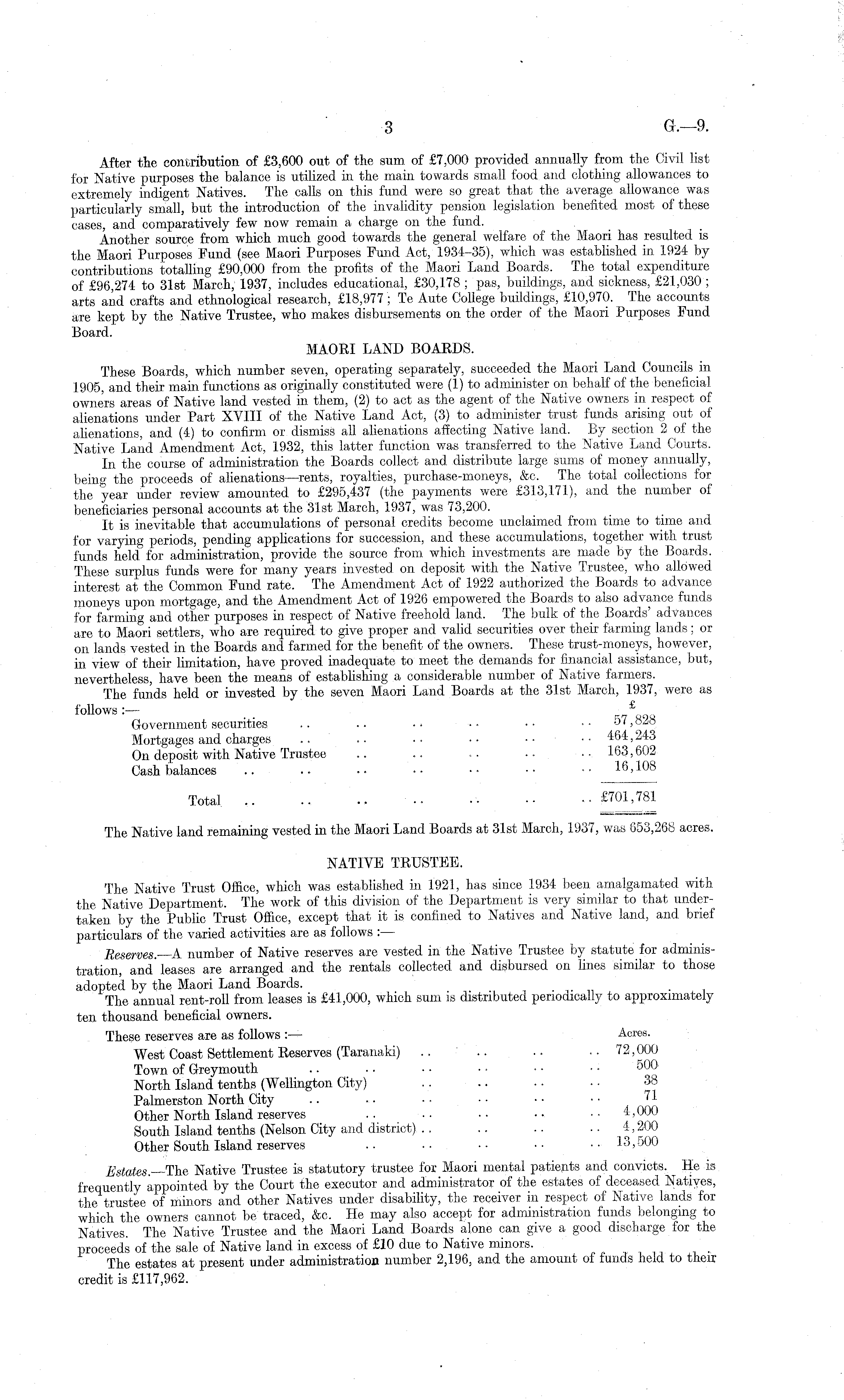 After the contribution of £3,600 out of the sum. of £7,000 provided annually from the Civil list for Native purposes the balance is utilized in the main towards small food and clothing allowances to extremely indigent Natives. The calls 011 this fund were so great that the average allowance was particularly small, but the introduction of the invalidity pension legislation benefited most of these cases, and comparatively few now remain a charge on the fund. Another source from which much good towards the general welfare of the Maori has resulted is the Maori Purposes Fund (see Maori Purposes Fund Act, 1934-35), which was established in 1924 by contributions totalling £90,000 from the profits of the Maori Land Boards. The total expenditure of £96,274 to 31st March, 1937, includes educational, £30,178 ; pas, buildings, and sickness, £21,030 ; arts and crafts and ethnological research, £18,977 ; Te Aute College buildings, £10,970. The accounts are kept by the Native Trustee, who makes disbursements on the order of the Maori Purposes Fund Board. MAORI LAND BOARDS. These Boards, which number seven, operating separately, succeeded the Maori Land Councils in 1905, and their main functions as originally constituted were (1) to administer 011 behalf of the beneficial owners areas of Native land vested in them, (2) to act as the agent of the Native owners in respect of alienations under Part XVIII of the Native Land Act, (3) to administer trust funds arising out of alienations, and (4) to confirm or dismiss all alienations affecting Native land. By section 2of the Native Land Amendment Act, 1932, this latter function was transferred to the Native Land Courts. In the course of administration the Boards collect and distribute large sums of money annually, being the proceeds of alienations —rents, royalties, purchase-moneys, &c. The total collections for the year under review amounted to £295,437 (the payments were £313,171), and the number of beneficiaries personal accounts at the 31st March, 1937, was 73,200. It is inevitable that accumulations of personal credits become unclaimed from time to time and for varying periods, pending applications for succession, and these accumulations, together with trust funds held for administration, provide the source from which investments are made by the Boards. These surplus funds were for many years invested 011 deposit with the Native Trustee, who allowed interest at the Common Fund rate. The Amendment Act of 1922 authorized the Boards to advance moneys upon mortgage, and the Amendment Act of 1926 empowered the Boards to also advance funds for farming and other purposes in respect of Native freehold land. The bulk of the Boards advances are to Maori settlers, who are required to give proper and valid securities over their farming lands; or on lands vested in the Boards and farmed for the benefit of the owners. These trust-moneys, however, in view of their limitation, have proved inadequate to meet the demands for financial assistance, but, nevertheless, have been the means of establishing a considerable number of Native farmers. The funds held or invested by the seven Maori Land Boards at the 31st March, 1937, were as follows: — Government securities .. . ■ • • • • • • .. 57,828 Mortgages and charges .. .. • • • • • • • • 464, 243 On deposit with Native Trustee .. .. ■■ •• 163,602 Cash balances .. .. ■■ •• •• •• •• 16,108 Total £701,781 The Native land remaining vested in the Maori Land Boards at 31st March, 1937, was 653,268 acres. NATIVE TRUSTEE. The Native Trust Office, which was established in 1921, has since 1934 been amalgamated with the Native Department. The work of this division of the Department is very similar to that undertaken by the Public Trust Office, except that it is confined to Natives and Native land, and brief particulars of the varied activities are as follows : Reserves—A number of Native reserves are vested in the Native Trustee by statute for administration, and leases are arranged and the rentals collected and disbursed 011 lines similar to those adopted by the Maori Land Boards. ... . ... , The animal rent-roll from leases is £41,000, which sum is distributed periodically to approximately ten thousand beneficial owners. These reserves are as follows : — Acres. West Coast Settlement Reserves (Taranaki) .. .. •• •• 72,000 Town of Greymouth . - • • ■ • • • • • • - 500 North Island tenths (Wellington City) • • • • • • • • 38 Palmerston North City .. • • • ■ • ■ • • • • Other North Island reserves .. •• •• •• 4 ,000 South Island tenths (Nelson City and district) .. .. .. .. 4,200 Other South Island reserves .. • • • • • • .. 13,500 Estates. The Native Trustee is statutory trustee for Maori mental patients and convicts. He is frequently appointed by the Court the executor and administrator of the estates of deceased Natives, the trustee of minors and other Natives under disability, the receiver in respect of Native lands for which the owners cannot be traced, &c. He may also accept for administration funds belonging to Natives. The Native Trustee and the Maori Land Boards alone can give a good discharge for the proceeds of the sale of Native land in excess of £10 due to Native minors. The estates at present under administration number 2,196, and the amount of funds held to their credit is £117,962.