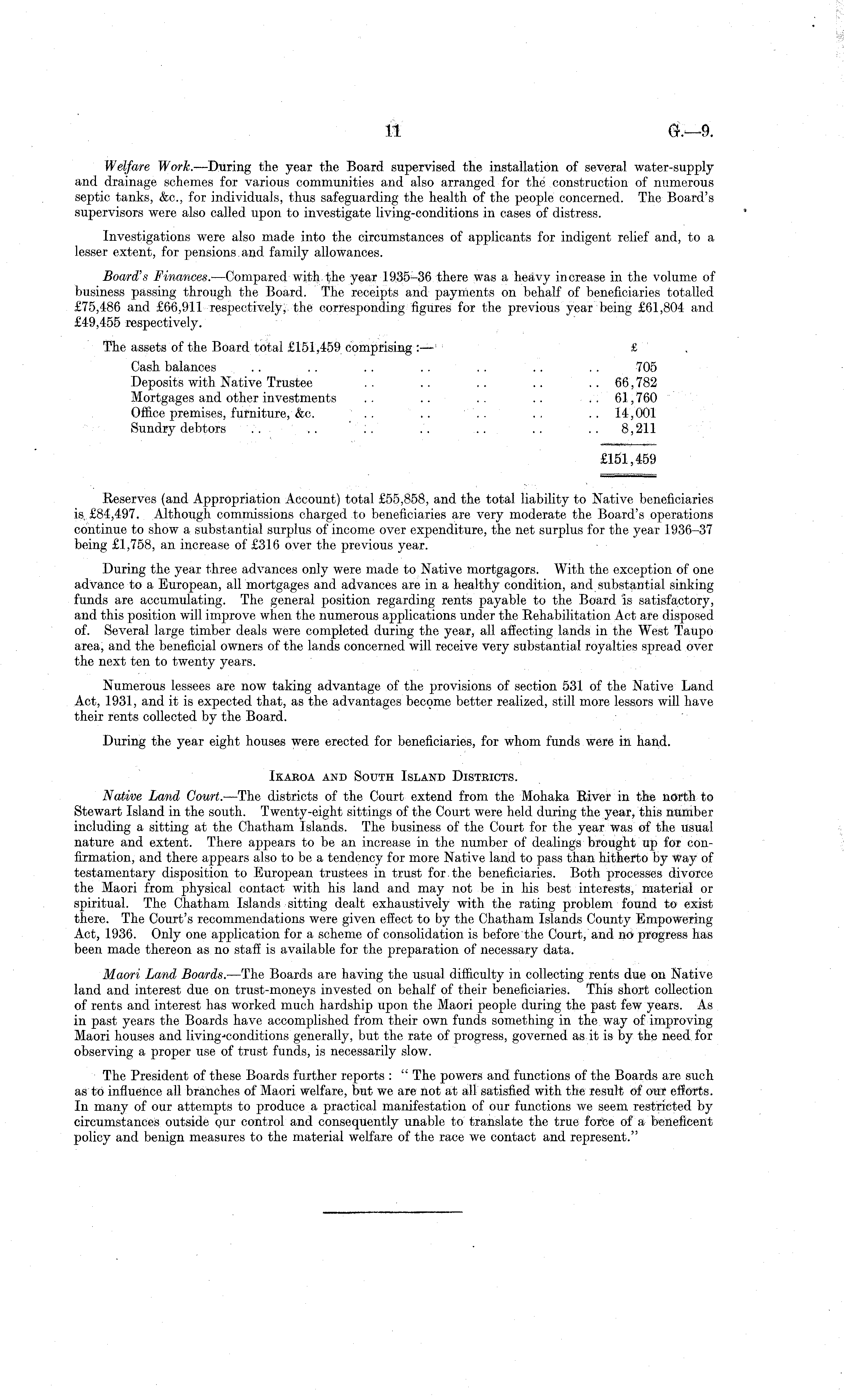 Welfare Work. —During the year the Board, supervised the installation of several water-supply and drainage schemes for various communities and also arranged for the construction of numerous septic tanks, &c., for individuals, thus safeguarding the health of the people concerned. The Board's supervisors were also called upon to investigate living-conditions in cases of distress. Investigations were also made into the circumstances of applicants for indigent relief and, to a lesser extent, for pensions and family allowances. Board's Finances.■— Compared with the year 1935-36 there was a heavy increase in the volume of business passing through the Board. The receipts and payments on behalf of beneficiaries totalled £75,486 and £66,911 respectively, the corresponding figures for the previous year being £61,804 and £49,455 respectively. The assets of the Board total £151,459 comprising : — £ Cash balances . . . . . . . . . . . . . . 705 Deposits with Native Trustee .. .. .. .. ..66,782 Mortgages and other investments . . .. . . . . .. 61,760 Office premises, furniture, &c. .. .. .. .. .. 14,001 Sundry debtors .. .. .. .. .. .. 8,211 £151,459 Reserves (and Appropriation Account) total £55,858, and the total liability to Native beneficiaries is £84,497. Although commissions charged to beneficiaries are very moderate the Board's operations continue to show a substantial surplus of income over expenditure, the net surplus for the year 1936-37 being £1,758, an increase of £316 over the previous year. During the year three advances only were made to Native mortgagors. With the exception of one advance to a European, all mortgages and advances are in a healthy condition, and substantial sinking funds are accumulating. The general position regarding rents payable to the Board is satisfactory, and this position will improve when the numerous applications under the Rehabilitation Act are disposed of. Several large timber deals were completed during the year, all affecting lands in the West Taupo area, and the beneficial owners of the lands concerned will receive very substantial royalties spread over the next ten to twenty years. Numerous lessees are now taking advantage of the provisions of section 531 of the Native Land Act, 1931, and it is expected that, as the advantages becpme better realized, still more lessors will have their rents collected by the Board. During the year eight houses were erected for beneficiaries, for whom funds were in hand. Ikaroa and South Island Districts. Native Land Court.—The districts of the Court extend from the Mohaka River in the north to Stewart Island in the south. Twenty-eight sittings of the Court were held during the year, this number including a sitting at the Chatham Islands. The business of the Court for the year was of the usual nature and extent. There appears to be an increase in the number of dealings brought up for confirmation, and there appears also to be a tendency for more Native land to pass than hitherto by way of testamentary disposition to European trustees in trust for the beneficiaries. Both processes divorce the Maori from physical contact with his land and may not be in his best interests, material or spiritual. The Chatham Islands sitting dealt exhaustively with the rating problem found to exist there. The Court's recommendations were given efiect to by the Chatham Islands County Empowering Act, 1936. Only one application for a scheme of consolidation is before the Court, and no progress has been made thereon as no staff is available for the preparation of necessary data. Maori Land Boards. —The Boards are having the usual difficulty in collecting rents due on Native land and interest due on trust-moneys invested on behalf of their beneficiaries. This short collection of rents and interest has worked much hardship upon the Maori people during the past few years. As in past years the Boards have accomplished from their own funds something in the way of improving Maori houses and living j conditions generally, but the rate of progress, governed as it is by the need for observing a proper use of trust funds, is necessarily slow. The President of these Boards further reports : " The powers and functions of the Boards are such as to influence all branches of Maori welfare, but we are not at all satisfied with the result of our efforts. In many of our attempts to produce a practical manifestation of our functions we seem restricted by circumstances outside our control and consequently unable to translate the true force of a beneficent policy and benign measures to the material welfare of the race we contact and represent."