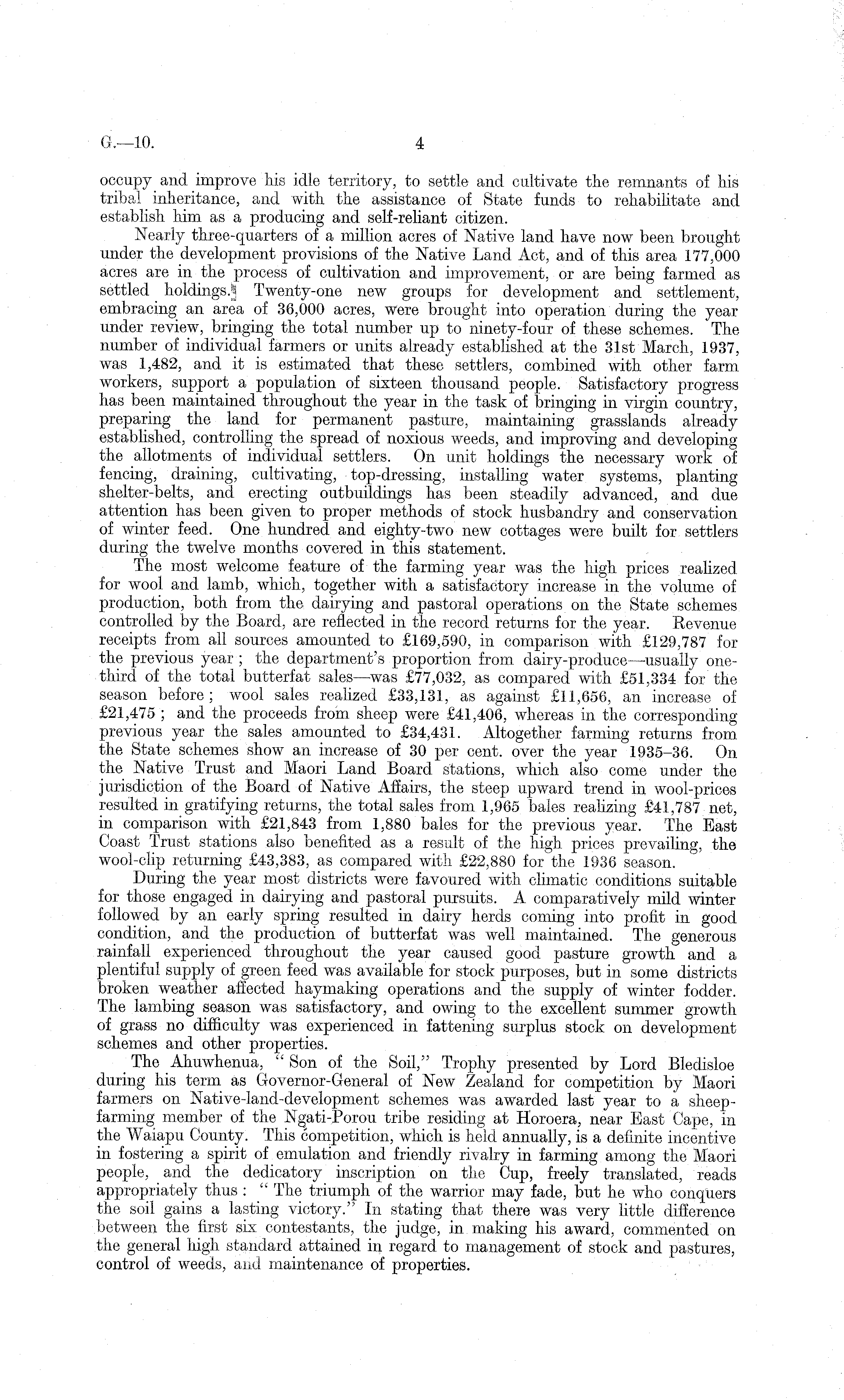 occupy and improve his idle territory, to settle and cultivate the remnants of his tribal inheritance, and with the assistance of State funds to rehabilitate and establish him as a producing and self-reliant citizen. Nearly three-quarters of a million acres of Native land have now been brought under the development provisions of the Native Land Act, and of this area 177,000 acres are in the process of cultivation and improvement, or are being farmed as settled holdings.§ Twenty-one new groups for development and settlement, embracing an area of 36,000 acres, were brought into operation during the year under review, bringing the total number up to ninety-four of these schemes. The number of individual farmers or units already established at the 31st March, 1937, was 1,482, and it is estimated that these settlers, combined with other farm workers, support a population of sixteen thousand people. Satisfactory progress has been maintained throughout the year in the task of bringing in virgin country, preparing the land for permanent pasture, maintaining grasslands already established, controlling the spread of noxious weeds, and improving and developing the allotments of individual settlers. On unit holdings the necessary work of fencing, draining, cultivating, top-dressing, installing water systems, planting shelter-belts, and erecting outbuildings has been steadily advanced, and due attention has been given to proper methods of stock husbandry and conservation of winter feed. One hundred and eighty-two new cottages were built for settlers during the twelve months covered in this statement. The most welcome feature of the farming year was the high prices realized for wool and lamb, which, together with a satisfactory increase in the volume of production, both from the dairying and pastoral operations on the State schemes controlled by the Board, are reflected in the record returns for the year. Revenue receipts from all sources amounted to £169,590, in comparison with £129,787 for the previous year ; the department's proportion from dairy-produce—usually onethird of the total butterfat sales—was £77,032, as compared with £51,334 for the season before; wool sales realized £33,131, as against £11,656, an increase of £21,475 ; and the proceeds from sheep were £41,406, whereas in the corresponding previous year the sales amounted to £34,431. Altogether farming returns from the State schemes show an increase of 30 per cent, over the year 1935-36. On the Native Trust and Maori Land Board stations, which also come under the jurisdiction of the Board of Native Affairs, the steep upward trend in wool-prices resulted in gratifying returns, the total sales from 1,965 bales realizing £41,787 net, in comparison with £21,843 from 1,880 bales for the previous year. The East Coast Trust stations also benefited as a result of the high prices prevailing, the wool-clip returning £43,383, as compared with £22,880 for the 1936 season. During the year most districts were favoured with climatic conditions suitable for those engaged in dairying and pastoral pursuits. A comparatively mild winter followed by an early spring resulted in dairy herds coming into profit in good condition, and the production of butterfat was well maintained. The generous rainfall experienced throughout the year caused good pasture growth and a plentiful supply of green feed was available for stock purposes, but in some districts broken weather affected haymaking operations and the supply of winter fodder. The lambing season was satisfactory, and owing to the excellent summer growth of grass no difficulty was experienced in fattening surplus stock on development schemes and other properties. The Ahuwhenua, " Son of the Soil," Trophy presented by Lord Bledisloe during his term as Governor-General of New Zealand for competition by Maori farmers on Native-land-development schemes was awarded last year to a sheepfarming member of the Ngati-Porou tribe residing at Horoera, near East Cape, in the Waiapu County. This competition, which is held annually, is a definite incentive in fostering a spirit of emulation and friendly rivalry in farming among the Maori people, and the dedicatory inscription on the Cup, freely translated, reads appropriately thus : " The triumph of the warrior may fade, but he who conquers the soil gains a lasting victory." In stating that there was very little difference between the first six contestants, the judge, in making his award, commented on the general high standard attained in regard to management of stock and pastures, control of weeds, and maintenance of properties.