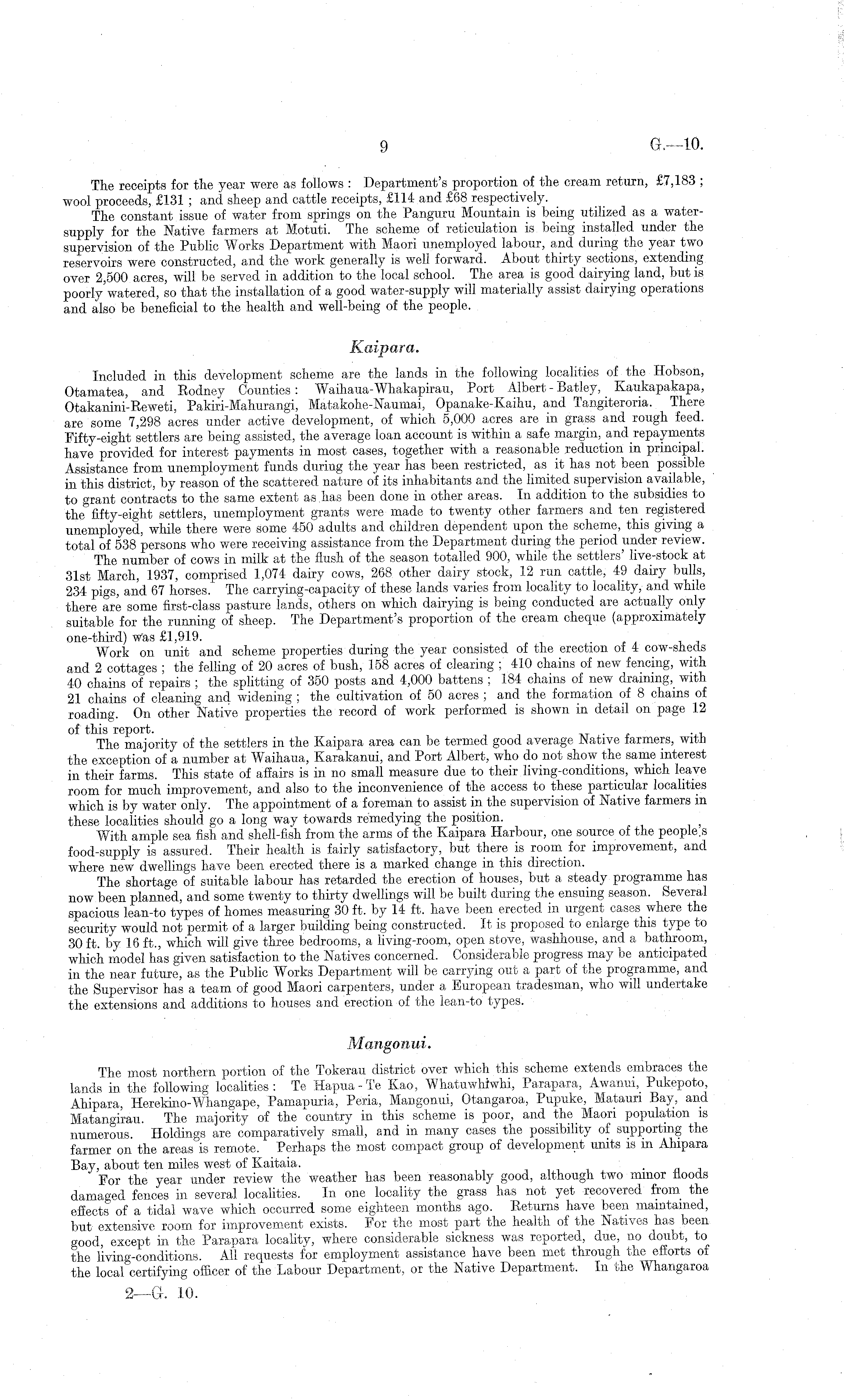 The receipts for the year were as follows : Department's proportion of the cream return, £7,183 ; wool proceeds, £131 ; and sheep and cattle receipts, £114 and £68 respectively. The constant issue of water from springs on the Panguru Mountain is being utilized as a watersupply for the Native farmers at Motuti. The scheme of reticulation is being installed under the supervision of the Public Works Department with Maori unemployed labour, and during the year two reservoirs were constructed, and the work generally is well forward. About thirty sections, extending over 2,500 acres, will be served in addition to the local school. The area is good dairying land, but is poorly watered, so that the installation of a good water-supply will materially assist dairying operations and also be beneficial to the health and well-being of the people. Kaipara. Included in this development scheme are the lands in the following localities Hobson, Otamatea, and Rodney Counties: Waihaua-Whakapirau, Port Albert - Batley, Ivaukapakapa, Otakanini-Reweti, Pakiri-Mahurangi, Matakohe-Naumai, Opanake-Kaihu, and Tangiteroria. There are some 7,298 acres under active development, of which 5,000 acres are in grass and rough feed. Fifty-eight settlers are being assisted, the average loan account is within a safe margin, and repayments have provided for interest payments in most cases, together with a reasonable reduction in principal. Assistance from unemployment funds during the year has been restricted, as it has not been possible in this district, by reason of the scattered nature of its inhabitants and the limited supervision available, to grant contracts to the same extent as has been done in other areas. In addition to the subsidies to fifty-eight settlers, unemployment grants were made to twenty other farmers and ten registered unemployed, while there were some 450 adults and children dependent upon the scheme, this giving a total of 538 persons who were receiving assistance from the Department during the period under review. The number of cows in milk at the flush of the season totalled 900, while the settlers' live-stock at 31st March, 1937, comprised 1,074 dairy cows, 268 other dairy stock, 12 run cattle, 49 dairy bulls, 234 pigs, and 67 horses. The carrying-capacity of these lands varies from locality to locality, and while there are some first-class pasture lands, others on which dairying is being conducted are actually only suitable for the running of sheep. The Department's proportion of the cream cheque (approximately one-third) was £1,919. Work on unit and scheme properties during the year consisted of the erection of 4 cow-sneds and 2 cottages ; the felling of 20 acres of bush, 158 acres of clearing ; 410 chains of new fencing, with 40 chains of repairs ; the splitting of 350 posts and 4,000 battens ; 184 chains of new with 21 chains of cleaning and widening ; the cultivation of 50 acres ; and the formation of 8 chains of roading. On other Native properties the record of work performed is shown in detail on page 12 of this report. . The majority of the settlers in the Kaipara area can be termed good average Native farmers, witii the exception of a number at Waihaua, Karakanui, and Port Albert, who do not show the same interest in their farms. This state of affairs is in no small measure due to their living-conditions, which leave room for much improvement, and also to the inconvenience of the access to these particular localities which is by water only. The appointment of a foreman to assist in the supervision of Native farmers in these localities should go a long way towards remedying the position. With ample sea fish and shell-fish from the arms of the Kaipara Harbour, one source of the people.s food-supply is assured. Their health is fairly satisfactory, but there is room for improvement, and where new dwellings have been erected there is a marked change in this direction. The shortage of suitable labour has retarded the erection of houses, but a steady programme has now been planned, and some twenty to thirty dwellings will be built during the ensuing season. Several spacious lean-to types of homes measuring 30 ft. by 14 ft. have been erected in urgent cases where the security would not permit of a larger building being constructed. It is proposed to enlarge this type to 30 ft. by 16 ft., which will give three bedrooms, a living-room, open stove, washhouse, and a bathroom, which model has given satisfaction to the Natives concerned. Considerable progress may be anticipated in the near future, as the Public Works Department will be carrying out a part of the programme, and the Supervisor has a team of good Maori carpenters, under a European tradesman, who will undertake the extensions and additions to houses and erection of the lean-to types. Mangonui. The most northern portion of the Tokerau district over which this scheme extends embraces the lands in the following localities: Te Hapua-Te Kao, Whatuwhiwhi, Parapara, Awanui, Pukepoto, Ahipara, Herekino-Whangape, Pamapuria, Peria, Mangonui, Otangaroa, Pupuke, Matauri Bay, and Matangirau. The majority of the country in this scheme is poor, and the Maori population is numerous. Holdings are comparatively small, and in many cases the possibility of supporting the farmer on the areas is remote. Perhaps the most compact group of development units is in Ahipara Bay, about ten miles west of Kaitaia. . For the year under review the weather has been reasonably good, although two minor floods damaged fences in several localities. In one locality the grass has not yet recovered from the effects of a tidal wave which occurred some eighteen months ago. Returns have been maintained, but extensive room for improvement exists. For the most part the health of the Natives has been good, except in the Parapara locality, where considerable sickness was reported, due, no doubt, to the living-conditions. All requests for employment assistance have been met through the