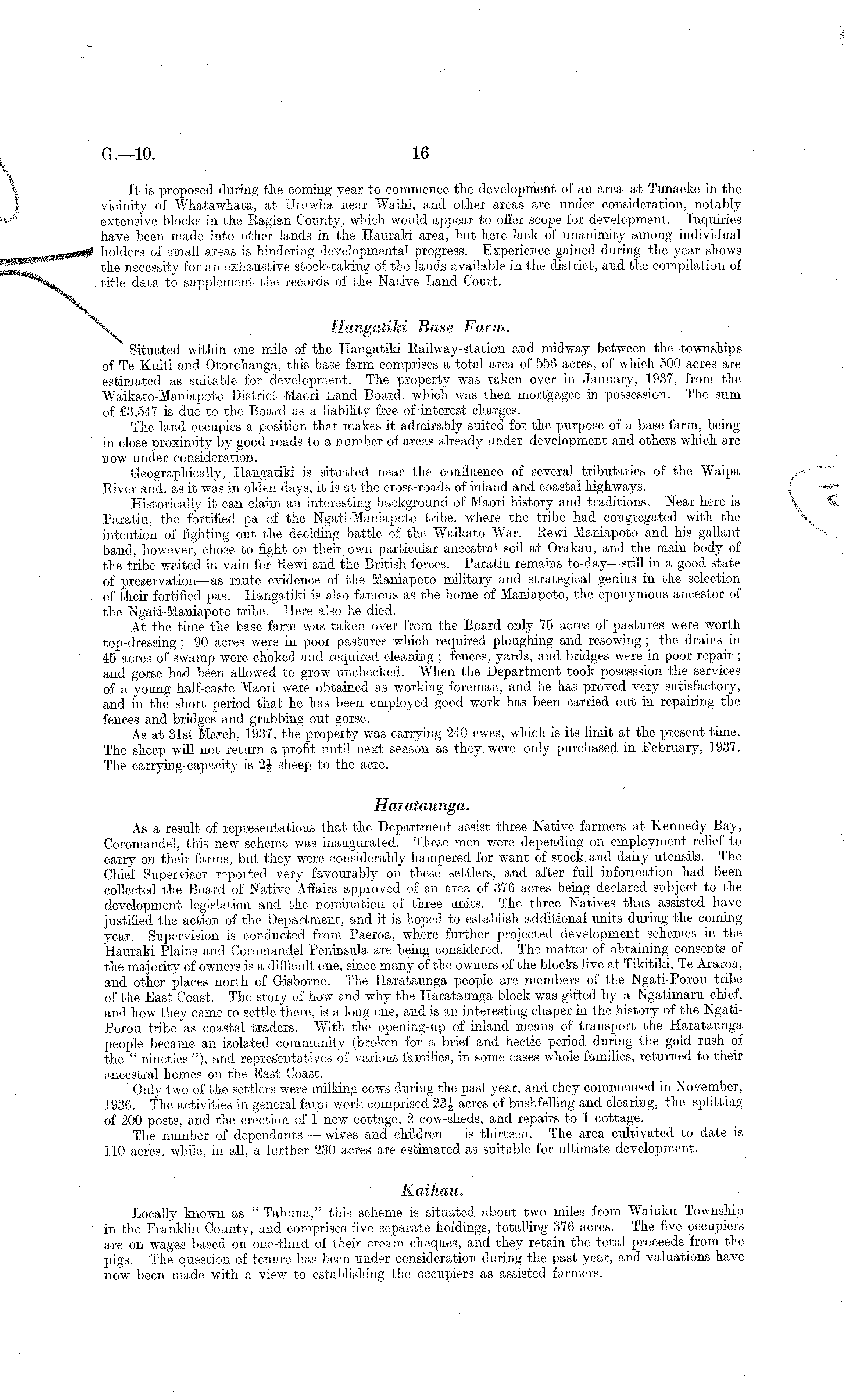 It is proposed during the coming year to commence the development of an area at Tunaeke in the vicinity of Whatawhata, at Uruwha near Waihi, and other areas are under consideration, notably extensive blocks in the Raglan County, which would appear to offer scope for development. Inquiries have been made into other lands in the Hauraki area, but here lack of unanimity among individual holders of small areas is hindering developmental progress. Experience gained during the year shows the necessity for an exhaustive stock-taking of the lands available in the district, and the compilation of title data to supplement the records of the Native Land Court. \ Hangatiki Base Farm. Situated within one mile of the Hangatiki Railway-station and midway between the townships of Te Kuiti and Otorohanga, this base farm comprises a total area of 556 acres, of which 500 acres are estimated as suitable for development. The property was taken over in January, 1937, from the Waikato-Maniapoto District Maori Land Board, which was then mortgagee in possession. The sum of £3,547 is due to the Board as a liability free of interest charges. The land occupies a position that makes it admirably suited for the purpose of a base farm, being in close proximity by good roads to a number of areas already under development and others which are now under consideration. Geographically, Hangatiki is situated near the confluence of several tributaries of the Waipa River and, as it was in olden days, it is at the cross-roads of inland and coastal highways. Historically it can claim an interesting background of Maori history and traditions. Near here is Paratiu, the fortified pa of the Mgati-Maniapoto tribe, where the tribe had congregated with the intention of fighting out the deciding battle of the Waikato War. Rewi Maniapoto and his gallant band, chose to fight on their own particular ancestral soil at Orakau, and the main body of the tribe waited in vain for Rewi and the British forces. Paratiu remains to-day —still in a good state of preservation —as mute evidence of the Maniapoto military and strategical genius in the selection of their fortified pas. Hangatiki is also famous as the home of Maniapoto, the eponymous ancestor of the Ngati-Maniapoto tribe. Here also he died. At the time the base farm was taken over from the Board only 75 acres of pastures were worth top-dressing ; 90 acres were in poor pastures which required ploughing and resowing ; the drains in 45 acres of swamp were choked and required cleaning ; fences, yards, and bridges were in poor repair ; and gorse had been allowed to grow unchecked. When the Department took posesssion the services of a young half-caste Maori were obtained as working foreman, and he has proved very satisfactory, and in the short period that he has been employed good work has been carried out in repairing the fences and bridges and grubbing out gorse. As at 31st March, 1937, the property was carrying 240 ewes, which is its limit at the present time. The sheep will not return a profit until next season as they were only purchased in February, 1937. The carrying-capacity is 2§ sheep to the acre. Harataunga. As a result of representations that the Department assist three Native farmers at Kennedy Bay, Coromandel, this new scheme was inaugurated. These men were depending on employment relief to carry on their farms, but they were considerably hampered for want of stock and dairy utensils. The Chief Supervisor reported very favourably on these settlers, and after full information had been collected the Board of Native Affairs approved of an area of 376 acres being declared subject to the development legislation and the nomination of three units. The three Natives thus assisted have justified the action of the Department, and it is hoped to establish additional units during the coming year. Supervision is conducted from Paeroa, where further projected development schemes in the Hauraki Plains and Coromandel Peninsula are being considered. The matter of obtaining consents of the majority of owners is a difficult one, since many of the owners of the blocks live at Tikitiki, Te Araroa, and other places north of Gisborne. The Harataunga people are members of the Ngati-Porou tribe of the East Coast. The story of how and why the Harataunga block was gifted by a Ngatimaru chief, and how they came to settle there, is a long one, and is an interesting chaper in the history of the NgatiPorou tribe as coastal traders. With the opening-up of inland means of transport the Harataunga people became an isolated community (broken for a brief and hectic period during the gold rush of the " nineties "), and representatives of various families, in some cases whole families, returned to their ancestral homes on the East Coast. Only two of the settlers were milking cows during the past year, and they commenced in November, 1936. The activities in general farm work comprised 23|- acres of bushfelling and clearing, the splitting of 200 posts, and the erection of 1 new cottage, 2 cow-sheds, and repairs to 1 cottage. The number of dependants — wives and children —is thirteen. The area cultivated to date is 110 acres, while, in all, a further 230 acres are estimated as suitable for ultimate development. Kaihau. Locally known as " Tahuna," this scheme is situated about two miles from Waiuku Township in the Franklin County, and comprises five separate holdings, totalling 376 acres. The five occupiers are on wages based on one-third of their cream, cheques, and they retain the total proceeds from the pigs. The question of tenure has been under consideration during the past year, and valuations have now been made with a view to establishing the occupiers as assisted farmers.