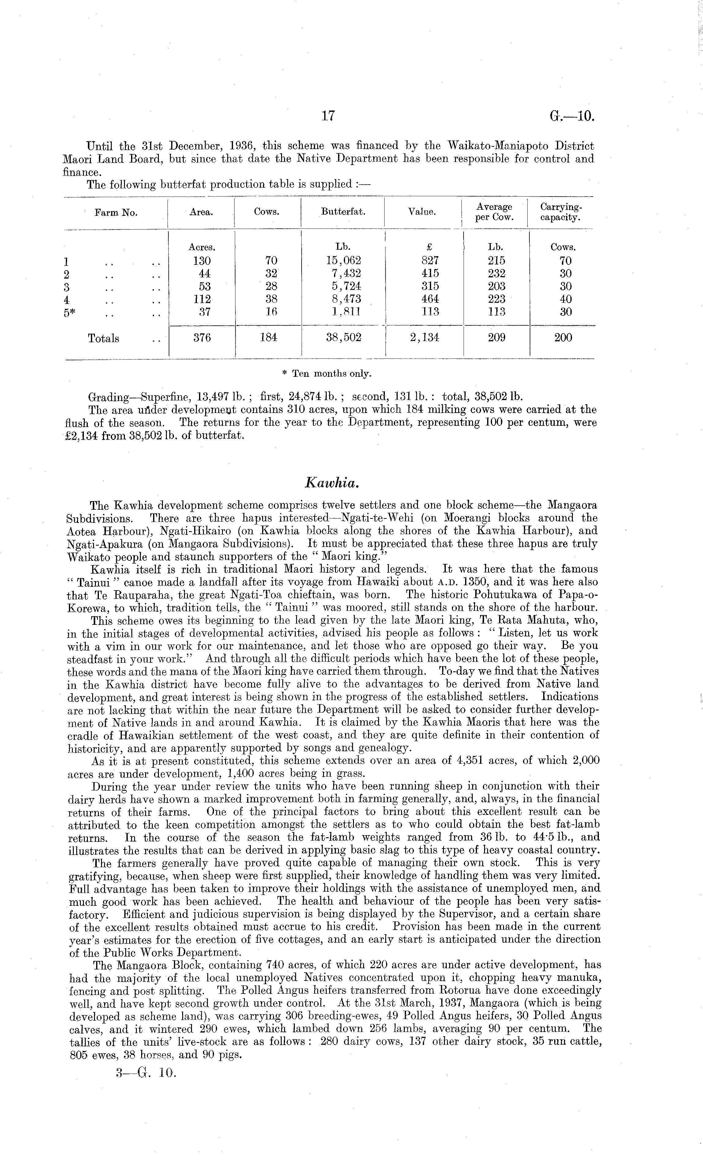 Until the 31st December, 1936, this scheme was financed by the Waikato-Maniapoto District Maori Land Board, but since that date the Native Department has been responsible for control and finance. The following butterfat production table is supplied : —