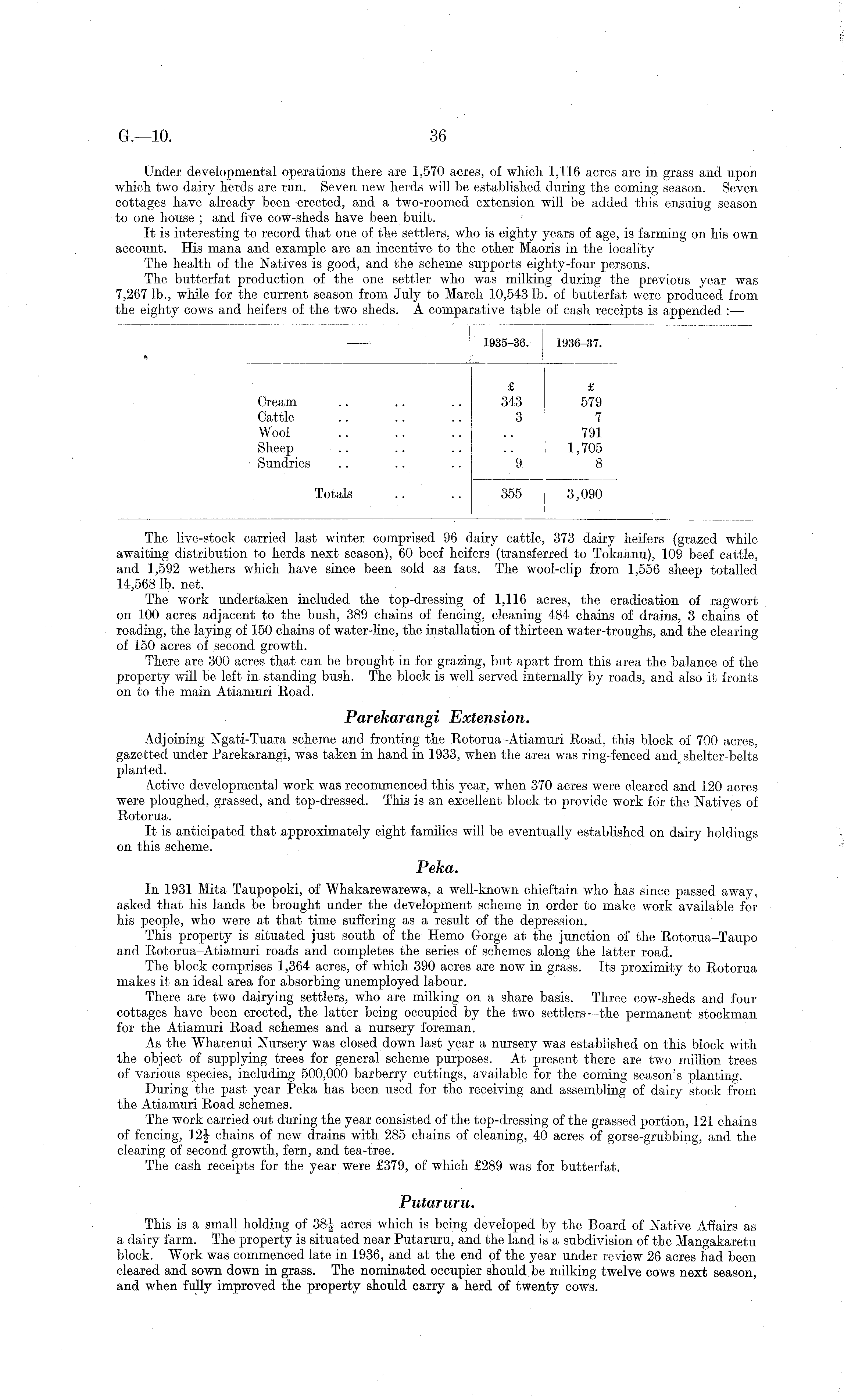 The live-stock carried last winter comprised 96 dairy cattle, 373 dairy heifers (grazed while awaiting distribution to herds next season), 60 beef heifers (transferred to Tokaanu), 109 beef cattle, and 1,592 wethers which have since been sold as fats. The wool-clip from 1,556 sheep totalled 14,568 lb. net. The work undertaken included the top-dressing of 1,116 acres, the eradication of ragwort on 100 acres adjacent to the bush, 389 chains of fencing, cleaning 484 chains of drains, 3 chains of roading, the laying of 150 chains of water-line, the installation of thirteen water-troughs, and the clearing of 150 acres of second growth. There are 300 acres that can be brought in for grazing, but apart from this area the balance of the property will be left in standing bush. The block is well served internally by roads, and also it fronts on to the main Atiamuri Road. Parekarangi Extension. Adjoining Ngati-Tuara scheme and fronting the Rotorua-Atiamuri Road, this block of 700 acres, gazetted under Parekarangi, was taken in hand in 1933, when the area was ring-fenced and shelter-belts planted. Active developmental work was recommenced this year, when 370 acres were cleared and 120 acres were ploughed, grassed, and top-dressed. This is an excellent block to provide work for the Natives of Rotorua. It is anticipated that approximately eight families will be eventually established on dairy holdings on this scheme. Peka. In 1931 Mita Taupopoki, of Whakarewarewa, a well-known chieftain who has since passed away, asked that his lands be brought under the development scheme in order to make work available for his people, who were at that time suffering as a result of the depression. This property is situated just south of the Hemo Gorge at the junction of the Rotorua-Taupo and Rotorua-Atiamuri roads and completes the series of schemes along the latter road. The block comprises 1,364 acres, of which 390 acres are now in grass. Its proximity to Rotorua makes it an ideal area for absorbing unemployed labour. There are two dairying settlers, who are milking on a share basis. Three cow-sheds and four cottages have been erected, the latter being occupied by the two settlers —the permanent stockman for the Atiamuri Road schemes and a nursery foreman. As the Wharenui Nursery was closed down last year a nursery was established on this block with the object of supplying trees for general scheme purposes. At present there are two million trees of various species, including 500,000 barberry cuttings, available for the coming season's planting. During the past year Peka has been used for the receiving and assembling of dairy stock from the Atiamuri Road schemes. The work carried out during the year consisted of the top-dressing of the grassed portion, 121 chains of fencing, 12i chains of new drains with 285 chains of cleaning, 40 acres of gorse-grubbing, and the clearing of second growth, fern, and tea-tree. The cash receipts for the year were £379, of which £289 was for butterfat. Putaruru. This is a small holding of 38-J acres which is being developed by the Board of Native Affairs as a dairy farm. The property is situated near Putaruru, and the land is a subdivision of the Mangakaretu block. Work was commenced late in 1936, and at the end of the year under review 26 acres had been cleared and sown down in grass. The nominated occupier should be milking twelve cows next season, and when fully improved the property should carry a herd of twenty cows.