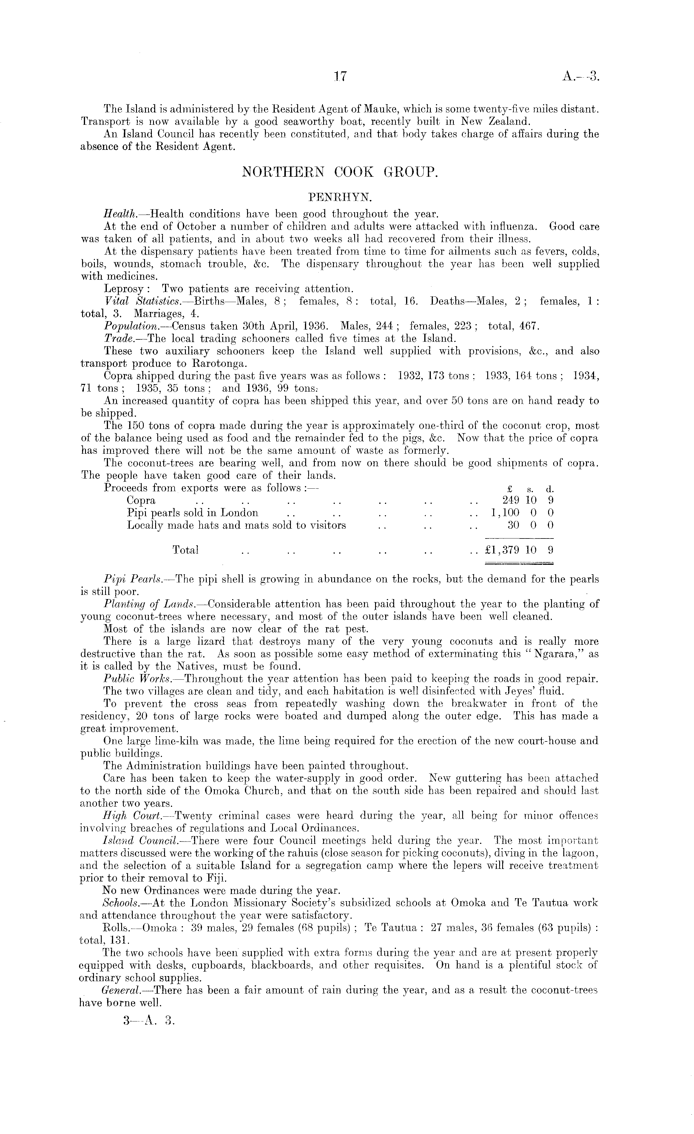 The Island is administered by the Resident Agent of Mauke, which is some twenty-five miles distant. Transport is now available by a good seaworthy boat, recently built in New Zealand. An Island Council has recently been constituted, and that body takes charge of affairs during the absence of the Resident Agent. NORTHERN COOK GROUP. PENRHYN. Health. —Health conditions have been good throughout the year. At the end of October a number of children and adults were attacked with influenza. Good care was taken of all patients, and in about two weeks all had recovered from their illness. At the dispensary patients have been treated from time to time for ailments such as fevers, colds, boils, wounds, stomach trouble, &c. The dispensary throughout the year has been well supplied with medicines. Leprosy : Two patients are receiving attention. Vital Statistics.—Births—Males, 8 ; females, 8 : total, 16. Deaths —Males, 2 ; females, 1 : total, 3. Marriages, 4. Population. —Census taken 30th April, 1936. Males, 244 ; females, 223 ; total, 467. Trade. —The local trading schooners called five times at the Island. These two auxiliary schooners keep the Island well supplied with provisions, &c., and also transport produce to Rarotonga. Copra shipped during the past five years was as follows : 1932, 173 tons ; 1933, 164 tons ; 1934, 71 tons ; 1935, 35 tons ; and 1936, 99 tons.An increased quantity of copra has been shipped this year, and over 50 tons are on hand ready to be shipped. The 150 tons of copra made during the year is approximately one-third of the coconut crop, most of the balance being used as food and the remainder fed to the pigs, &c. Now that the price of copra has improved there will not be the same amount of waste as formerly. The coconut-trees are bearing well, and from now on there should be good shipments of copra. The people have taken good care of their lands. Proceeds from exports were as follows : — £ 8 . a. Copra .. .. .. .. .. .. .. 249 10 9 Pipi pearls sold in London .. . . .. .. 1,100 0 0 Locally made hats and mats sold to visitors .. .. .. 30 0 0 Total .. .. .. .. .. .. £1,379 10 9 Pi-pi Pearls. —The pipi shell is growing in abundance on the rocks, but the demand for the pearls is still poor. Planting of Lands. —Considerable attention has been paid throughout the year to the planting of young coconut-trees where necessary, and most of the outer islands have been well cleaned. Most of the islands are now clear of the rat pest. There is a large lizard that destroys many of the very young coconuts and is really more destructive than the rat. As soon as possible some easy method of exterminating this " Ngarara," as it is called by the Natives, must be found. Public Works.—Throughout the year attention has been paid to keeping the roads in good repair. The two villages are clean and tidy, and each habitation is well disinfected with Jeyes' fluid. To prevent the cross seas from repeatedly washing down the breakwater in front of the residency, 20 tons of large rocks were boated and dumped along the outer edge. This has made a great improvement. One large lime-kiln was made, the lime being required for the erection of the new court-house and public buildings. The Administration buildings have been painted throughout. Care has been taken to keep the water-supply in good order. New guttering has been attached to the north side of the Omoka Church, and that on the south side has been repaired and should last another two years. High Court.—Twenty criminal cases were heard during the year, all being for minor offences involving breaches of regulations and Local Ordinances. Island Council. —There were four Council meetings held during the year. The most important matters discussed were the working of the rahuis (close season for picking coconuts), diving in the lagoon, and the selection of a suitable Island for a segregation camp where the lepers will receive treatment prior to their removal to Fiji. No new Ordinances were made during the year. Schools. —At the London Missionary Society's subsidized schools at Omoka and Te Tautua work and attendance throughout the year were satisfactory. Rolls.—Omoka : 39 males, 29 females (68 pupils) ; Te Tautua : 27 males, 36 females (63 pupils) : total, 131. The two schools have been supplied with extra forms during the year and are at present properly equipped with desks, cupboards, blackboards, and other requisites. On hand is a plentiful stock of ordinary school supplies. General. —There has been a fair amount of rain during the year, and as a result the coconut-trees have borne well.