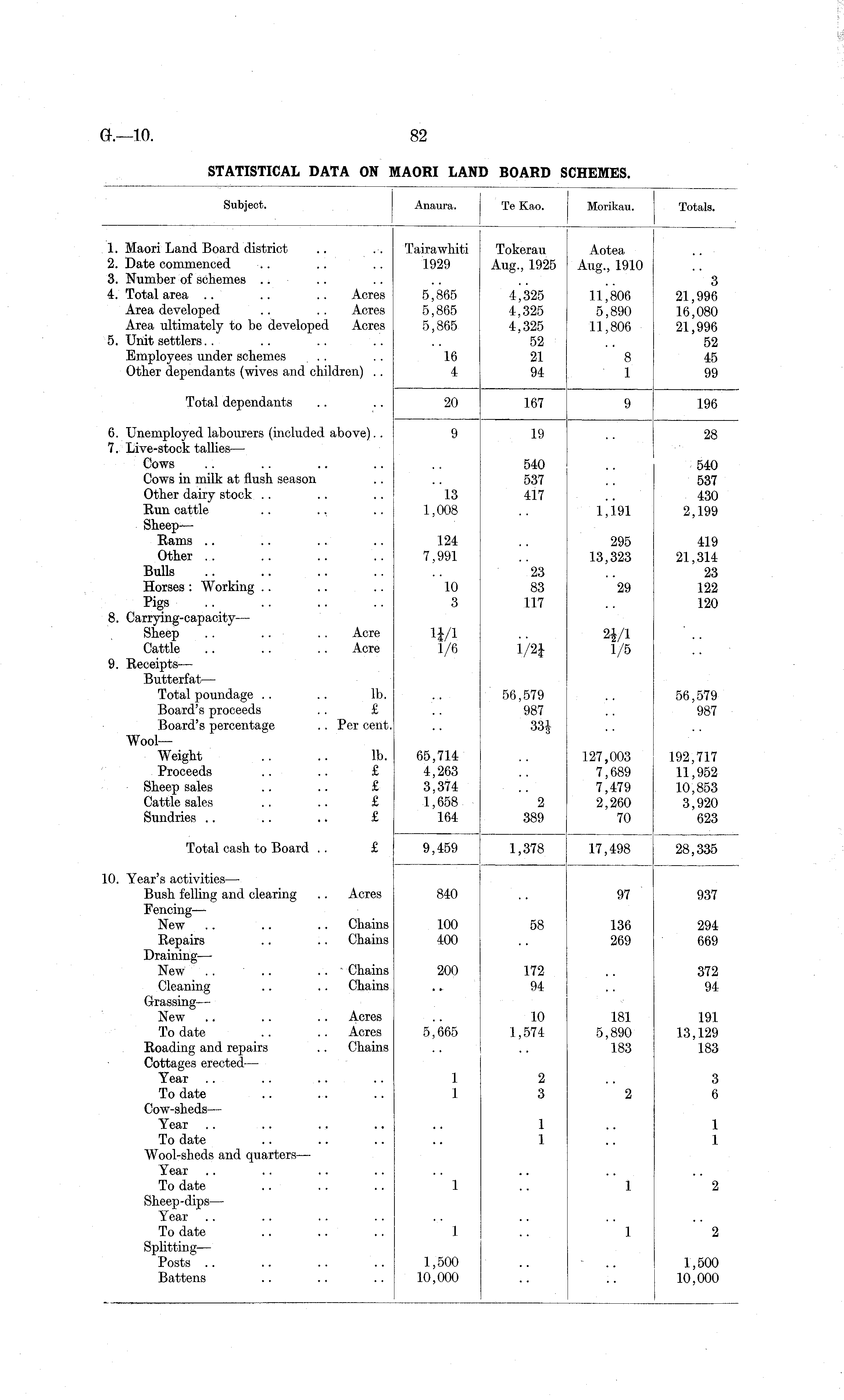 Subject. Anaura. Te Kao. Morikau. Totals. 1. Maori Land Board district .. .. Tairawhiti Tokerau Aotea 2. Date commenced .. .. .. 1929 Aug., 1925 Aug., 1910 3. Number of schemes .. .. .. .. .. .. 3 4. Total area .. .. .. Acres 5,865 4,325 11,806 21,996 Area developed .. .. Acres 5,865 4,325 5,890 16,080 Area ultimately to be developed Acres 5,865 4,325 11,806 21,996 5. Unit settlers.. .. .. .. .. 52 .. 52 Employees under schemes .. .. 16 21 8 45 Other dependants (wives and children) .. 4 94 1 99 Total dependants .. .. 20 167 9 196 6. Unemployed labourers (included above).. 9 19 .. 28 7. Live-stock tallies— Cows .. .. .. .. .. 540 .. 540 Cows in milk at flush season .. .. 537 .. 537 Other dairy stock .. .. .. 13 417 .. 430 Run cattle .. .. .. 1,008 .. 1,191 2,199 Sheep— Rams .. .. .. .. 124 .. 295 419 Other .. .. .. .. 7,991 .. 13,323 21,314 Bulls .. .. .. .. .. 23 .. 23 Horses: Working .. .. .. 10 83 29 122 Pigs .. .. .. .. 3 117 .. 120 8. Carrying-capacity — Sheep .. .. .. Acre 1J/1 .. 2-J-/1 Cattle .. .. .. Acre 1/6 1/2 J 1/5 9. Receipts — Butterfat — Total poundage .. .. lb. .. 56,579 .. 56,579 Board's proceeds .. £ .. 987 .. 987 Board's percentage .. Per cent. .. 33| WoolWeight .. .. lb. 65,714 .. 127,003 192,717 Proceeds .. .. £ 4,263 .. 7,689 11,952 Sheep sales .. .. £ 3,374 .. 7,479 10,853 Cattle sales .. .. £ 1,658 2 2,260 3,920 Sundries .. .. .. £ 164 389 70 623 Total cash to Board .. £ 9,459 1,378 17,498 28,335 10. Year's activities— Bush felling and clearing .. Acres 840 .. 97 937 Fencing— New .. .. .. Chains 100 58 136 294 Repairs .. .. Chains 400 .. 269 669 Draining— New .. .. .. Chains 200 172 .. 372 Cleaning .. . . Chains .. 94 . . 94 Grassing —• New .. .. .. Acres .. 10 181 191 To date .. .. Acres 5,665 1,574 5,890 13,129 Roading and repairs .. Chains .. .. 183 183 Cottages erected— Year .. .. .. .. 1 2 .. 3 To date ...... 1 3 2 6 Cow-sheds — Year .. .. .. .. .. 1 .. 1 To date .. .. .. .. 1 .. 1 Wool-sheds and quarters — Year To date .. . . .. 1 .. 1 2 Sheep-dips — Year To date .. .. . . 1 .. 1 2 Splitting— Posts .. .. .. .. 1,500 .. .. 1,500 Battens .. .. .. 10,000 .. .. 10,000