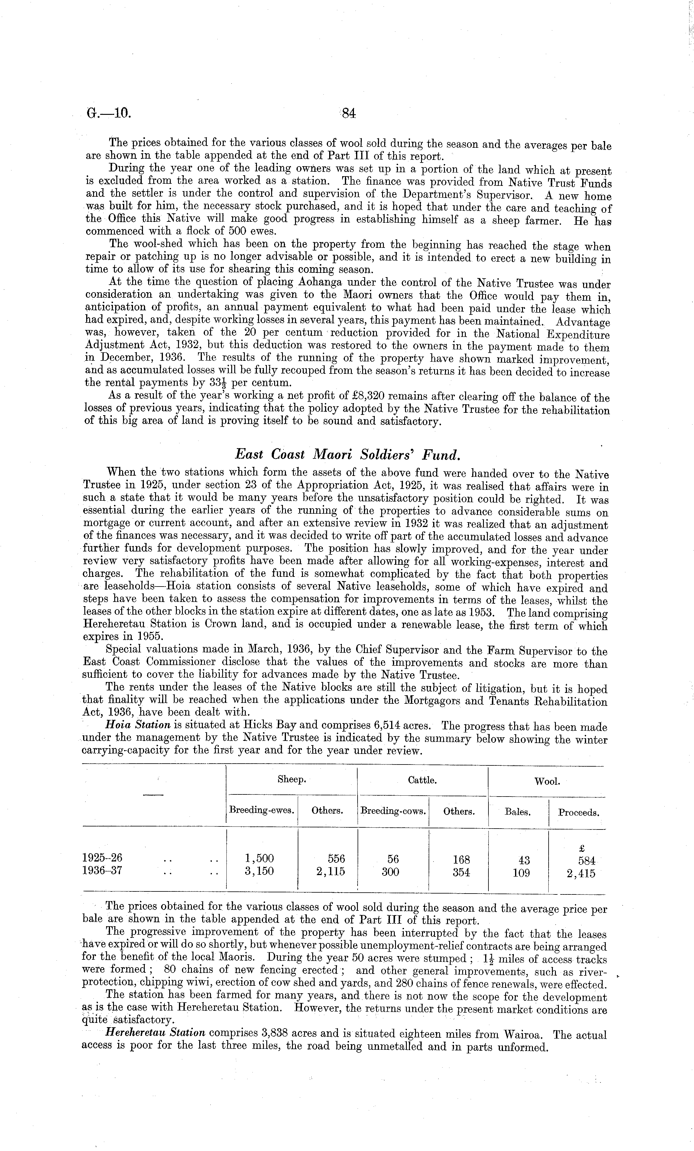 The prices obtained for the various classes of wool sold during the season and the averages per bale are shown in the table appended at the end of Part 111 of this report. During the year one of the leading owners was set up in a portion of the land which at present is excluded from the area worked as a station. The finance was provided from Native Trust Funds and the settler is under the control and supervision of the Department's Supervisor. A new home was built for him, the necessary stock purchased, and it is hoped that under the care and teaching of the Office this Native will make good progress in establishing himself as a sheep farmer. He has commenced with a flock of 500 ewes. The wool-shed which has been on the property from the beginning has reached the stage when repair or patching up is no longer advisable or possible, and it is intended to erect a new building in time to allow of its use for shearing this coming season. At the time the question of placing Aohanga under the control of the Native Trustee was under consideration an undertaking was given to the Maori owners that the Office would pay them in, anticipation of profits, an annual payment equivalent to what had been paid under the lease which had expired, and, despite working losses in several years, this payment has been maintained. Advantage was, however, taken of the 20 per centum reduction provided for in the National Expenditure Adjustment Act, 1932, but this deduction was restored to the owners in the payment made to them in December, 1936. The results of the running of the property have shown marked improvement, and as accumulated losses will be fully recouped from the season's returns it has been decided to increase the rental payments by 33| per centum. As a result of the year's working a net profit of £8,320 remains after clearing off the balance of the losses of previous years, indicating that the policy adopted by the Native Trustee for the rehabilitation of this big area of land is proving itself to be sound and satisfactory. East Coast Maori Soldiers' Fund. When the two stations which form the assets of the above fund were handed over to the Native Trustee in 1925, under section 23 of the Appropriation Act, 1925, it was realised that affairs were in such a state that it would be many years before the unsatisfactory position could be righted. It was essential during the earlier years of the running of the properties to advance considerable sums on mortgage or current account, and after an extensive review in 1932 it was realized that an adjustment of the finances was necessary, and it was decided to write off part of the accumulated losses and advance further funds for development purposes. The position has slowly improved, and for the year under review very satisfactory profits have been made after allowing for all working-expenses, interest and charges. The rehabilitation of the fund is somewhat complicated by the fact that both properties are leaseholds —Hoia station consists of several Native leaseholds, some of which have expired and steps have been taken to assess the compensation for improvements in terms of the leases, whilst the leases of the other blocks in the station expire at different dates, one as late as 1953. The land comprising Hereheretau Station is Crown land, and is occupied under a renewable lease, the first term of which expires in 1955. Special valuations made in March, 1936, by the Chief Supervisor and the Farm Supervisor to the East Coast Commissioner disclose that the values of the improvements and stocks are more than sufficient to cover the liability for advances made by the Native Trustee. The rents under the leases of the Native blocks are still the subject of litigation, but it is hoped that finality will be reached when the applications under the Mortgagors and Tenants Rehabilitation Act, 1936, have been dealt with. Hoia Station is situated at Hicks Bay and comprises 6,514 acres. The progress that has been made under the management by the Native Trustee is indicated by the summary below showing the winter carrying-capacity for the first year and for the year under review.