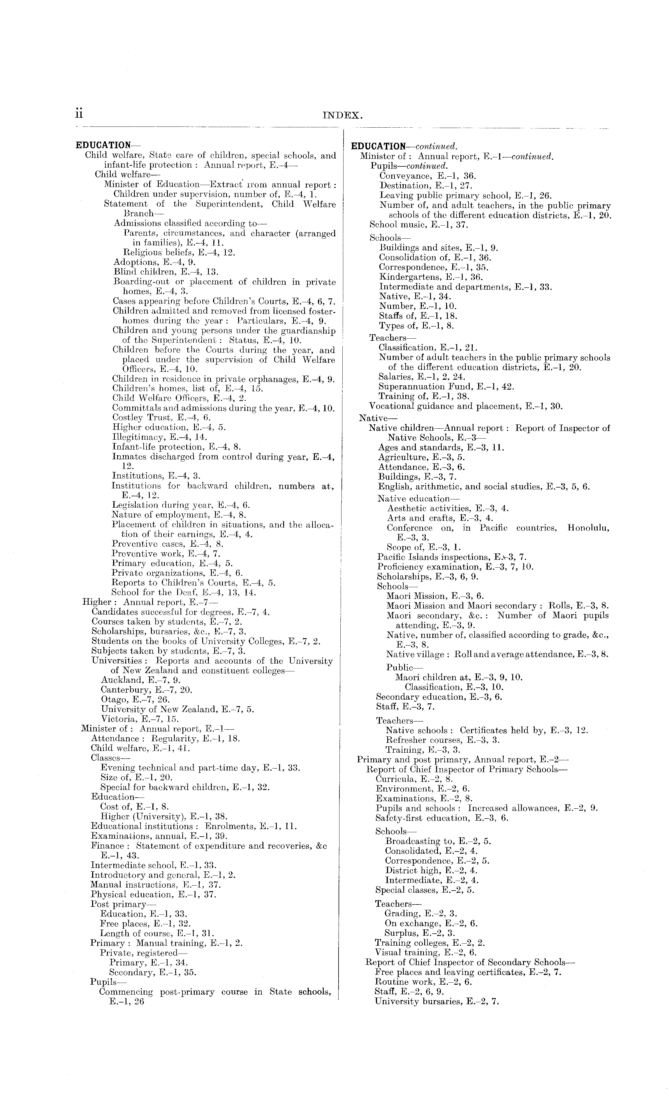 EDUCATION— Child welfare, State care of children, special schools, and infant-life protection : Annual report, E.-4— Child welfare— Minister of Education—Extract irom annual report: Children under supervision, number of, E.-4, 1. Statement of the Superintendent, Child Welfare Branch-— Admissions classified according to — Parents, circumstances, and character (arranged in families), E.-4, 11. Religious beliefs, E.-4, 12. Adoptions, E.-4, 9. Blind children, E.-4, 13. Boarding-out or placement of children in private homes, E.-4, 3. Cases appearing before Children's Courts, E.-4, 6, 7. Children admitted and removed from licensed fosterhomes during the year : Particulars, E.-4, 9. Children and young persons under the guardianship of the Superintendent: Status, E.-4, 10. Children before the Courts during the year, and placed under the supervision of Child Welfare Officers, E.-4, 10. Children in residence in private orphanages, E.-4, 9. Children's homes, list of, E.-4, 15. Child Welfare Officers, E.-4, 2. Committals and admissions during the year, E.-4,10. Costley Trust, E.-4, 6. Higher education, E.-4, 5. Illegitimacy, E.-4, 14. Infant-life protection, E.-4, 8. Inmates discharged from control during year, E.-4, 12. Institutions, E.-4, 3. Institutions for backward children, numbers at, E.-4, 12. Legislation during year, E.-4, 6. Nature of employment, E.-4, 8. Placement of children in situations, and the allocation of their earnings, E.-4, 4. Preventive cases, E.-4, 8. Preventive work, E.-4, 7. Primary education, E.-4, 5. Private organizations, E.-4, 6. Reports to Children's Courts, E.-4, 5. School for the Deaf, E.-4, 13, 14. Higher : Annual report, E.-7 — Candidates successful for degrees, E.-7, 4. Courses taken by students, E.-7, 2. Scholarships, bursaries, &c., E.-7, 3. Students on the books of University Colleges, E.-7, 2. Subjects taken by students, E.-7, 3. Universities : Reports and accounts of the University of New Zealand and constituent colleges— Auckland, E.-7, 9. Canterbury, E.-7, 20. Otago, E.-7, 26. University of New Zealand, E.-7, 5. Victoria, E.-7, 15. Minister of : Annual report, E.-l— Attendance : Regularity, E.-l, 18. Child welfare, E.-l, 41. Classes— Evening technical and part-time day, E.-l, 33. Size of, E.-l, 20. Special for backward children, E.-l, 32. Education— Cost of, E.-l, 8. Higher (University), E.-l, 38. Educational institutions : Enrolments, E.-l, 11. Examinations, annual, E.-l, 39. Finance : Statement of expenditure and recoveries, &c E.-l, 43. Intermediate school, E.-l, 33. Introductory and general, E.-l, 2. Manual instructions, E.-l, 37. Physical education, E.-l, 37. Post primaryEducation, E.-l, 33. Free places, E.-l, 32. Length of course, E.-l, 31. Primary : Manual training, E.-l, 2. Private, registered— Primary, E.-l, 34. Secondary, E.-l, 35. Pupils—Commencing post-primary course in State schools, E.-l, 26