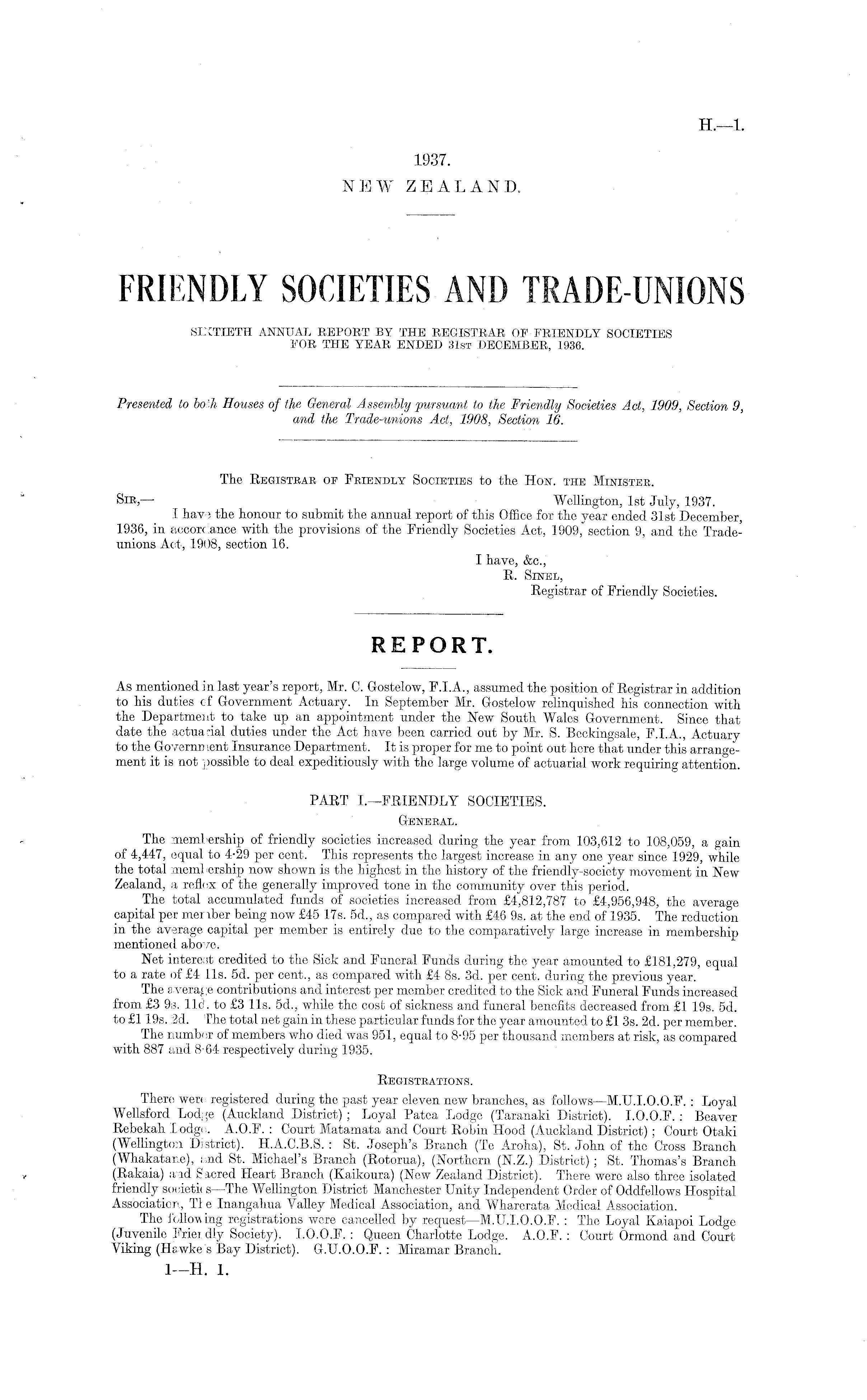 The Registrar of Friendly Societies to the Hon. the Minister. Sir,— Wellington, Ist July, 1937. I hav -i the honour to submit the annual report of this Office for the year ended 31st December, 1936, in accordance with the provisions of the Friendly Societies Act, 1909,"section 9, and the Tradeunions Act, 1908, section 16. I have, &c, R. Sinel, Registrar of Friendly Societies.