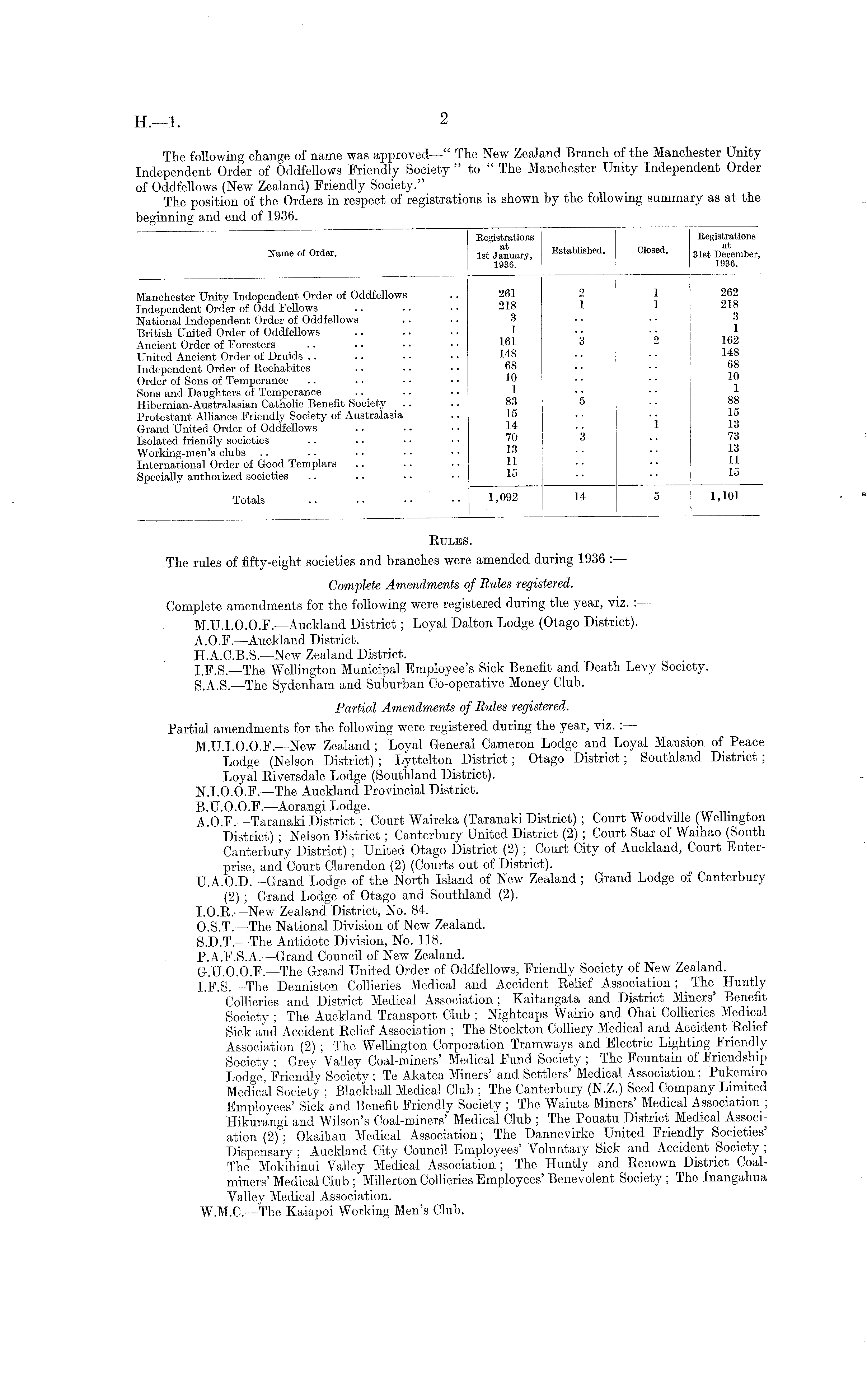 The following change of name was approved—" The New Zealand Branch of the Manchester Unity Independent Order of Oddfellows Friendly Society " to "The Manchester Unity Independent Order of Oddfellows (New Zealand) Friendly Society." The position of the Orders in respect of registrations is shown by the following summary as at the beginning and end of 1936.