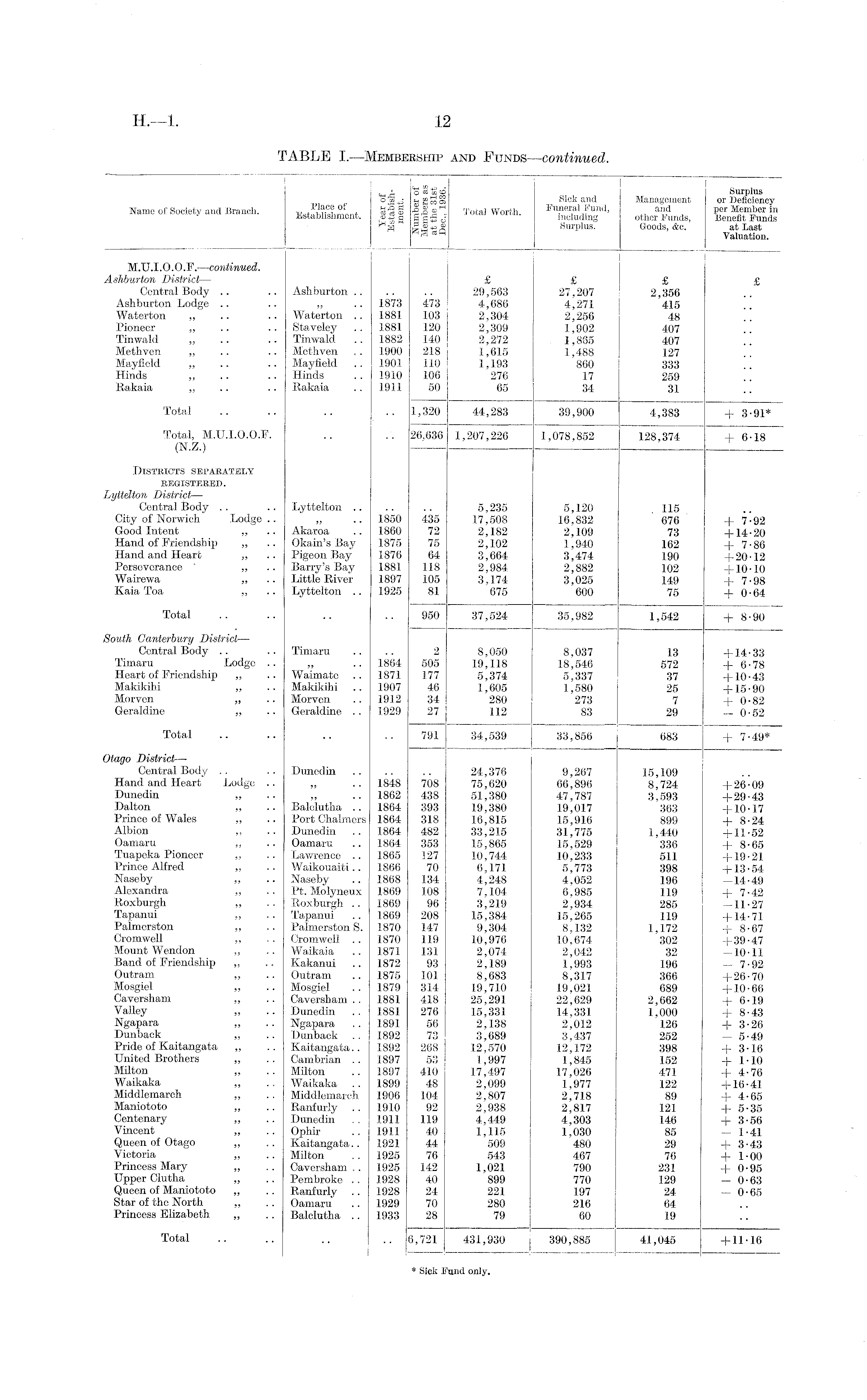 - _ . . L 15 a V* <o Surplus b r ā g £ g Sick and Management or Deficiency Name of Society and Branch. FutSshmmt S « S ' Total Worth. funeral Fund, and per Member in iiMamisliment. a>-g g S g S d including other -Funds, Benefit Funds H 5 iS *> ,8 Surplus. Goods, &c. at last R « aP Valuation. M.U.I.O.O.F.— continued. Ashburton District — £ £ £ £ Central Body .. .. Ashburton 29,563 27,207 2,356 Ashburton Lodge .. .. „ .. 1873 473 4,686 4,271 415 Waterton „ .. .. Waterton .. 1881 103 2,304 2,256 48 Pioneer „ .. .. Staveley .. 1881 120 2,309 1,902 407 .. Tinwald „ .. .. Tinwald .. 1882 140 2,272 1,865 407 Methven „ .. .. Methven .. 1900 218 1,615 1,488 127 Mayfield „ .. .. Mayfield .. 1901 110 1,193 860 333 Hinds „ .. .. Hinds .. 1910 106 276 17 259 Rakaia „ .. .. Rakaia .. 1911 50 65 34 31 Total .. .. .. .. 1,320 44,283 39,900 4,383 + 3-91* Total, M.U.I.O.O.F. .. .. 26,636 1,207,226 1,078,852 128,374 +6-18 (N.Z.) . Districts separately eegisteeed. Lyttelton District — Central Body .. .. Lyttelton 5,235 5,120 115 City of Norwich Lodge.. „ .. 1850 435 17,508 16,832 676 + 7-92 Good Intent „ .. Akaroa .. 1860 72 2,182 2,109 73 +14-20 Hand of Friendship „ .. Okain's Bay 1875 75 2,102 1,940 162 + 7-86 Hand and Heart „ .. Pigeon Bay 1876 64 3,664 3,474 190 +20-12 Perseverance ' „ Barry's Bay 1881 118 2,984 2,882 102 +10-10 Wairewa „ .. Little River 1897 105 3,174 3,025 149 + 7-98 Kaia Toa „ .. Lyttelton .. 1925 81 675 600 75 +0-64 Total .. .. .. .. 950 37,524 35,982 1,542 + 8-90 South Canterbury District — Central Body .. .. Timaru .. .. 2 8,050 8,037 13 +14-33 Timaru Lodge .. „ .. 1864 505 19,118 18,546 572 + 6-78 Heart of Friendship „ .. Waimate .. 1871 177 5,374 5,337 37 +10-43 Makikihi „ .. Makikihi .. 1907 46 1,605 1,580 25 +15-90 Morven „ .. Morven .. 1912 34 280 273 7 +0-82 Geraldine „ .. Geraldine .. 1929 27 112 83 29 - 0-52 Total .. .. .. .. 791 34,539 33,856 683 + 7-49* Otago District — Central Body .. .. Dunedin 24,376 9,267 15,109 Hand and Heart Lodge .. „ .. 1848 708 75,620 66,896 8,724 +26-09 Dunedin „ .. „ .. 1862 438 51,380 47,787 3,593 +29-43 Dalton „ .. Balclutha .. 1864 393 19,380 19,017 363 +10-17 Prince of Wales ,, .. Port Chalmers 1864 318 16,815 15,916 899 + 8-24 Albion „ .. Dunedin .. 1864 482 33,215 31,775 1,440 +11-52 Oamaru „ .. Oamaru .. 1864 353 15,865 15,529 336 + 8-65 Tuapeka Pioneer ,, .. Lawrence .. 1865 127 10,744 10,233 511 +19-21 Prince Alfred „ .. Waikouaiti.. 1866 70 6,171 5,773 398 +13-54 Naseby ,, .. Naseby .. 1868 134 4,248 4,052 196 —14-49 Alexandra „ .. Pt. Molyneux 1869 108 7,104 6,985 119 + 7-42 Roxburgh „ .. Roxburgh .. 1869 96 3,219 2,934 285 —11-27 Tapanui ,, .. Tapanui .. 1869 208 15,384 15,265 119 +14-71 Palmerston „ .. Palmerston S. 1870 147 9,304 8,132 1,172 + 8-67 Cromwell ,, .. Cromwell .. 1870 119 10,976 10,674 302 +39-47 Mount Wendon „ .. Waikaia .. 1871 131 2,074 2,042 32 —10-11 Band of Friendship „ .. Kakanui .. 1872 93 2,189 1,993 196 - 7-92 Outram „ .. Outram .. 1875 101 8,683 8,317 366 +26-70 Mosgiel „ .. Mosgiel .. 1879 314 19,710 19,021 689 +10-66 Caversham „ .. Caversham .. 1881 418 25,291 22,629 2,662 + 6-19 Valley „ .. Dunedin .. 1881 276 15,331 14,331 1,000 + 8-43 Ngapara „ .. Ngapara .. 1891 56 2,138 2,012 126 +3-26 Dunback „ .. Dunbaok .. 1892 73 3,689 3,437 252 — 5-49 Pride of Kaitangata „ .. Kaitangata.. 1892 268 12,570 12,172 398 +3-16 United Brothers „ .. Cambrian .. 1897 53 1,997 1,845 152 +1-10 Milton „ .. Milton .. 1897 410 17,497 17,026 471 + 4-76 Waikaka „ .. Waikaka .. 1899 48 2,099 1,977 122 +16-41 Middlemarch „ .. Middlemarch 1906 104 2,807 2,718 89 + 4-65 Maniototo „ .. Ranfurly .. 1910 92 2,938 2,817 121 + 5-35 Centenary „ .. Dunedin .. 1911 119 4,449 4,303 146 + 3-56 Vincent „ .. Ophir .. 1911 40 1,115 1,030 85 — 1-41 Queen of Otago „ .. Kaitangata.. 1921 44 509 480 29 +3-43 Victoria „ .. Milton .. 1925 76 543 467 76 +1-00 Princess Mary „ .. Caversham.. 1925 142 • 1,021 790 231 +0-95 Upper Clutha „ .. Pembroke .. 1928 40 899 770 129 — 0-63 Queen of Maniototo „ .. Ranfurly .. 1928 24 221 197 24 — 0-65 Star of the North „ .. Oamaru .. 1929 70 280 216 64 Princess Elizabeth „ .. Balclutha .. 1933 28 79 60 19 Total .. .. .. .. 6,721 431,930 390,885 41,045 +11-16 * Sick Fund only.