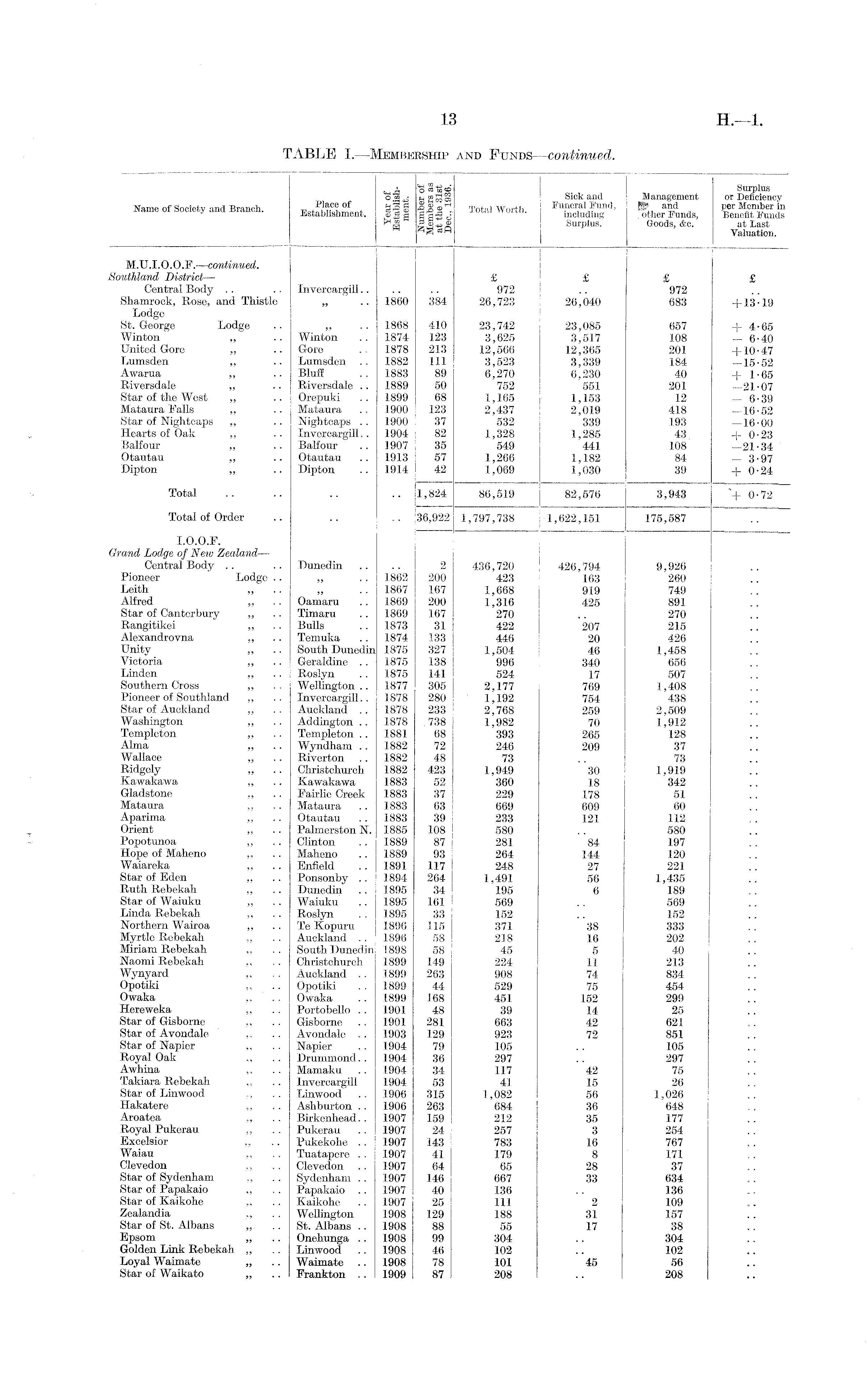 13 H. —L TABLE I.—Membership and Funds—continued. A o <s -£ d Surplus m »S§ Sick and Management or Deficiency Tīame of Swiptv and Branch Place of a o T . . W nrti, Funeral Fund, gg and per Member in bociely and Branch. Establishment. gig § all „• Total Worth - including other Funds, Benefit Funds a S 2 S Surplus. Goods, &c. at Last Valuation. M.U.I. O.O.F. —continued. Southland District— £ £ £ £ Central Body .. .. Invercargill.. .. .. 972 .. 972 Shamrock, Rose, and Thistle „ .. 1860 384 26,723 26,040 683 +13-19 Lodge St. George Lodge .. „ .. 1868 410 23,742 23,085 657 + 4-65 Winton „ .. Winton .. 1874 123 3,625 3,517 108 - 6-40 United Gore „ .. Gore .. 1878 213 12,566 12,365 201 +10-47 Lumsden „ .. Lumsden .. 1882 111 3,523 3,339 184 —15-52 Awarua „ .. Bluff .. 1883 89 6,270 6,230 40 + 1-65 Riversdale „ .. Riversdale .. 1889 50 752 551 201 —21-07 Star of the West „ .. Orepuki .. 1899 68 1,165 1,153 12 — 6-39 Mataura Falls „ .. Mataura .. 1900 123 2,437 2,019 418 —16-52 Star of Nightcaps „ .. Nightcaps .. 1900 37 532 339 193 -16-00 Hearts of Oak „ .. Invercargill.. 1904 82 1,328 1,285 43 + 0-23 Balfour „ .. Balfour .. 1907 35 549 441 108 -21-34 Otautau „ .. Otautau .. 1913 57 1,266 1,182 84 — 3-97 Dipton „ .. Dipton .. 1914 42 1,069 1,030 39 + 0-24 Total .. .. .. .. 1,824 86,519 82,576 3,943 '+ 0-72 Total of Order .. .. .. 36,922 1,797,738 1,622,151 175,587 I.O.O.F. Grand Lodge of New Zealand — Central Body .. .. Dunedin .. .. 2 436,720 426,794 9,926 Pioneer Lodge .. „ .. 1862 200 423 163 260 Leith „ .. „ .. 1867 167 1,668 919 749 Alfred „ .. Oamaru .. 1869 200 1,316 425 891 Star of Canterbury „ . . Timaru .. 1869 167 270 .. 270 Rangitikei „ .. Bulls .. 1873 31 422 207 215 Alexandrovna „ . . Temuka .. 1874 133 446 20 426 Unity „ .. South Dunedin 1875 327 1,504 46 1,458 Victoria „ .. Geraldine .. 1875 138 996 340 656 Linden „ .. Roslyn .. 1875 141 524 17 507 Southern Cross „ .. Wellington.. 1877 305 2,177 769 1,408 Pioneer of Southland „ .. Invercargill.. 1878 280 1,192 754 438 Star of Auckland „ .. Auckland .. 1878 233 2,768 259 2,509 Washington „ .. Addington .. 1878 738 1,982 70 1,912 Temploton „ . . Templeton .. 1881 68 393 265 128 Alma „ . . Wyndham .. 1882 72 246 209 37 Wallace „ . . Riverton .. 1882 48 73 .. 73 Ridgely „ .. Christchurch 1882 423 1,949 30 1,919 Kawakawa „ .. Kawakawa 1883 52 360 18 342 Gladstone „ .. Fairlie Creek 1883 37 229 178 51 Mataura „ . . Mataura .. 1883 63 669 609 60 Aparima ,, .. Otautau .. 1883 39 233 121 112 Orient „ .. Palmerston N. 1885 108 580 .. 580 Popotunoa „ .. Clinton . . 1889 87 281 84 197 Hope of Maheno „ .. Maheno .. 1889 93 264 144 120 Waiareka „ .. Enfield .. 1891 117 248 27 221 Star of Eden „ .. Ponsonby .. 1894 264 1,491 56 1,435 Ruth Rebekah ,, .. Dunedin .. 1895 34 195 6 189 Star of Waiuku „ .. Waiuku .. 1895 161 569 .. 569 Linda Rebekah ,, .. Roslyn . , 1895 33 152 .. 152 Northern Wairoa „ Te Kopuru 1896 115 371 38 333 Myrtle Rebekah „ .. Auckland . . 1896 58 218 16 202 Miriam Rebekah ,, .. South Dunedin 1898 58 45 5 40 Naomi Rebekah ,, . . Christchurch 1899 149 224 11 213 Wynyard . . Auckland .. 1899 263 908 74 834 Opotiki „ .. Opotiki .. 1899 44 529 75 454 Owaka „ .. Owaka . . 1899 168 451 152 299 Hereweka „ .. Portobello . . 1901 48 39 14 25 Star of Gisborne „ .. Gisborne . . 1901 281 663 42 621 Star of Avondale „ . . Avondale .. 1903 129 923 72 851 Star of Napier „ . . Napier . . 1904 79 105 .. 105 Royal Oak „ .. Drummond.. 1904 36 297 .. 297 Awhina ., .. Mamaku . . 1904 34 117 42 75 Takiara Rebekah ,, . . Invercargill 1904 53 41 15 26 Star of Linwood .. .. Linwood .. 1906 315 1,082 56 1,026 Hakatere ,, .. Ashburton .. 1906 263 684 36 648 Aroatea „ .. Birkenhead.. 1907 159 212 35 177 Royal Pukerau ,, . . Pukerau . . 1907 24 257 3 254 Excelsior „ .. Pukekohe .. 1907 143 783 16 767 Waiau . . Tuatapere .. 1907 41 179 8 171 Clevedon . . Clevedon .. 1907 64 65 28 37 Star of Sydenham ,, . . Sydenham .. 1907 146 667 33 634 Star of Papakaio ,, . . Papakaio . . 1907 40 136 .. 136 Star of Kaikohe „ .. Kaikohe .. 1907 25 111 2 109 Zealandia „ .. Wellington 1908 129 188 31 157 Star of St. Albans „ .. St. Albans .. 1908 88 55 17 38 Epsom „ .. Onehunga .. 1908 99 304 .. 304 Golden Link Rebekah „ .. Linwood .. 1908 46 102 .. 102 Loyal Waimate „ .. Waimate .. 1908 78 101 45 56 Star of Waikato „ .. Frankton .. 1909 87 208 .. 208