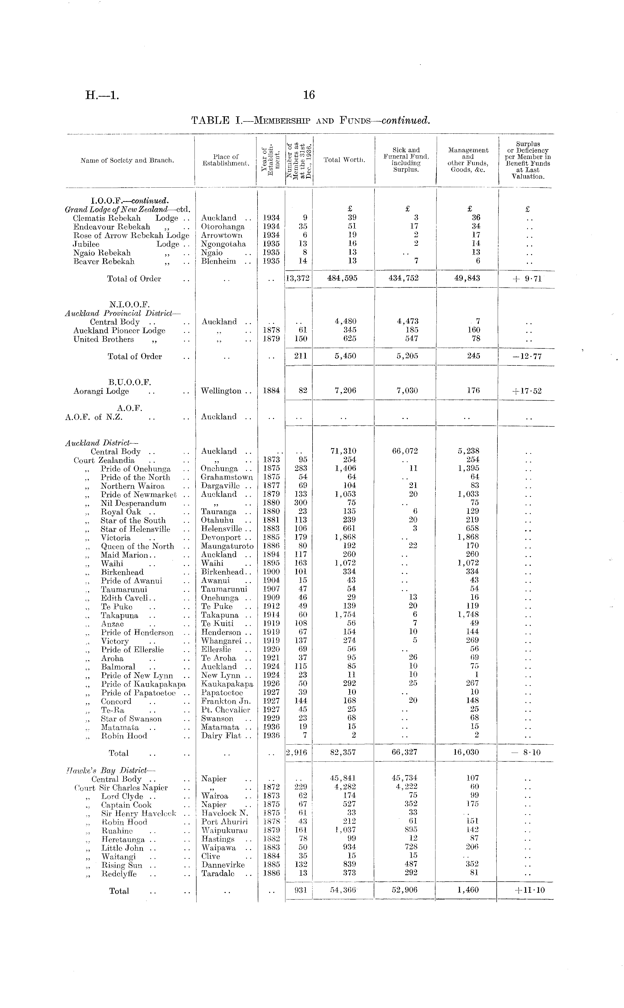 H.—1. 16 TABLE I.—Membership and Funds—continued. l fs S j Surplus "5 ■§ . ° „ rt m Sick and Management or Deficiency „ Place of ni§a sS"h w,i mnrti Funeral Fund, and per Member in Name of Society and Branch. Establishment. S S a % is : Total Worth. including other Funds, Benefit Funds P* p g 8 Surplus. Goods, &c. at Last Valuation. I.O.O.F. —continued. Grand Lodge of New Zealand—ctd. £ £ £ £ Clematis Rebekah Lodge .. Auckland .. 1934 9 39 3 36 Endeavour Rebekah ,, .. Otorohanga 1934 35 51 17 34 Rose of Arrow Rebekah Lodge Arrowtowri 1934 6 19 2 17 Jubilee Lodge .. Ngongotaha 1935 13 16 2 14 Ngaio Rebekah ,, .. Ngaio .. 1935 8 13 .. 13 Beaver Rebekah ,, .. Blenheim .. 1935 14 13 7 6 Total of Order .. .. .. 13,372 484,595 434,752 49,843 + 9-71 N.I.O.O.F. Auckland Provincial District— Central Body .. .. Auckland .. .. .. 4,480 4,473 7 Auckland Pioneer Lodge .. ,, .. 1878 61 345 185 160 United Brothers ,, .. ,, .. 1879 150 625 547 78 Total of Order .. .. .. 211 5,450 5,205 245 -12-77 B.U.O.O.F. Aorangi Lodge .. .. Wellington .. 1884 82 7,206 7,030 176 +17'52 A.O.F. A.O.F. of N.Z. .. .. Auckland .... Auckland District— Central Body .. .. Auckland .. .. .. 71,310 66,072 5,238 Court Zealandia . . .. ,, . • 1873 95 254 . . 254 „ Pride of Onehunga .. Onehunga .. 1875 283 1,406 11 1,395 ,, Pride of the North .. Grahamstown 1875 54 64 .. 64 „ Northern Wairoa .. Dargaville .. 1877 69 104 21 83 „ Pride of Newmarket .. Auckland .. 1879 133 1,053 20 1,033 „ Nil Desperandum .. „ .. 1880 300 75 .. 75 ,, Royal Oak .. .. Tauranga .. 1880 23 135 6 129 „ Star of the South .. Otahuhu .. 1881 113 239 20 219 „ Star of Helensville .. Helensville .. 1883 106 661 3 658 „ Victoria .. .. Devonport .. 1885 179 1,868 .. 1,868 „ Queen of the North .. Maungaturoto 1886 80 192 22 170 „ Maid Marion.. .. Auckland .. 1894 117 260 .. 260 „ Waihi .. .. Waihi .. 1895 163 1,072 .. 1,072 ,, Birkenhead .. Birkenhead.. 1900 101 334 .. 334 ,, Pride of Awanui . . Awanui .. 1904 15 43 .. 43 „ Taumarunui . . Taumarunui 1907 47 54 .. 54 ., Edith Cavell. . .. Onehunga .. 1909 46 29 13 16 „ Te Puke . . . . Te Puke . . .1912 49 139 20 119 „ Takapuna .. .. Takapuna .. 1914 60 1,754 6 1,748 ,. Anzac .. . . Te Kuiti .. 1919 108 56 7 49 ,, Pride of Henderson .. Henderson .. 1919 67 154 10 144 „ Victory .. . . Whangarei .. 1919 137 274 5 269 Pride of Ellerslie .. Ellerslie .. 1920 69 56 .. 56 „ Aroha .. .. Te Aroha .. 1921 37 95 26 69 „ Balmoral .. .. Auckland .. 1924 115 85 10 75 „ Pride of New Lynn .. New Lynn .. 1924 23 11 10 1 ,, Pride of Kaukapa.kapa Kaukapakapa 1926 50 292 25 267 „ Pride of Papatoetoe .. Papatoetoe 1927 39 10 .. 10 ,, Concord .. .. Frankton Jn. 1927 144 168 20 148 „ Te-Ra . . .. Pt. Chevalier 1927 45 25 .. 25 „ Star of Swanaon .. Swanson .. 1929 23 68 .. 68 ,, Matamata .. .. Matamata .. 1936 19 15 .. 15 ,, Robin Hood .. Dairy Flat . . 1936 7 2 .. 2 Total .. .. .. .. 2,916 82,357 66,327 16,030 - 8-10 Hawke's Bay District— Central Body .. .. Napier .. .. •• 45,841 45,734 107 Court Sir Charles Napier .. „ .. 1872 229 4,282 4,222 60 „ Lord Clyde .. .. Wairoa .. 1873 62 174 75 99 „ Captain Cook . . Napier .. 1875 67 527 352 175 „ Sir Henry Havelock .. Havelock N. 1875 61 33 33 „ Robin Hood .. Port Ahuriri 1878 43 212 61 151 „ Ruahine .. .. Waipukurau 1879 161 1,037 895 142 ,, Heretaunga .. .. Hastings . . 1882 78 99 12 87 „ Little John .. .. Waipawa .. 1883 50 934 728 206 „ Waitangi .. .. Clive . . 1884 35 15 15 „ Rising Sun .. .. Dannevirke 1885 132 839 487 352 „ Redclyffe .. .. Taradale . . 1886 13 373 292 81 Total .. .. .. •• 931 54,366 52,906 1,460 +1M0