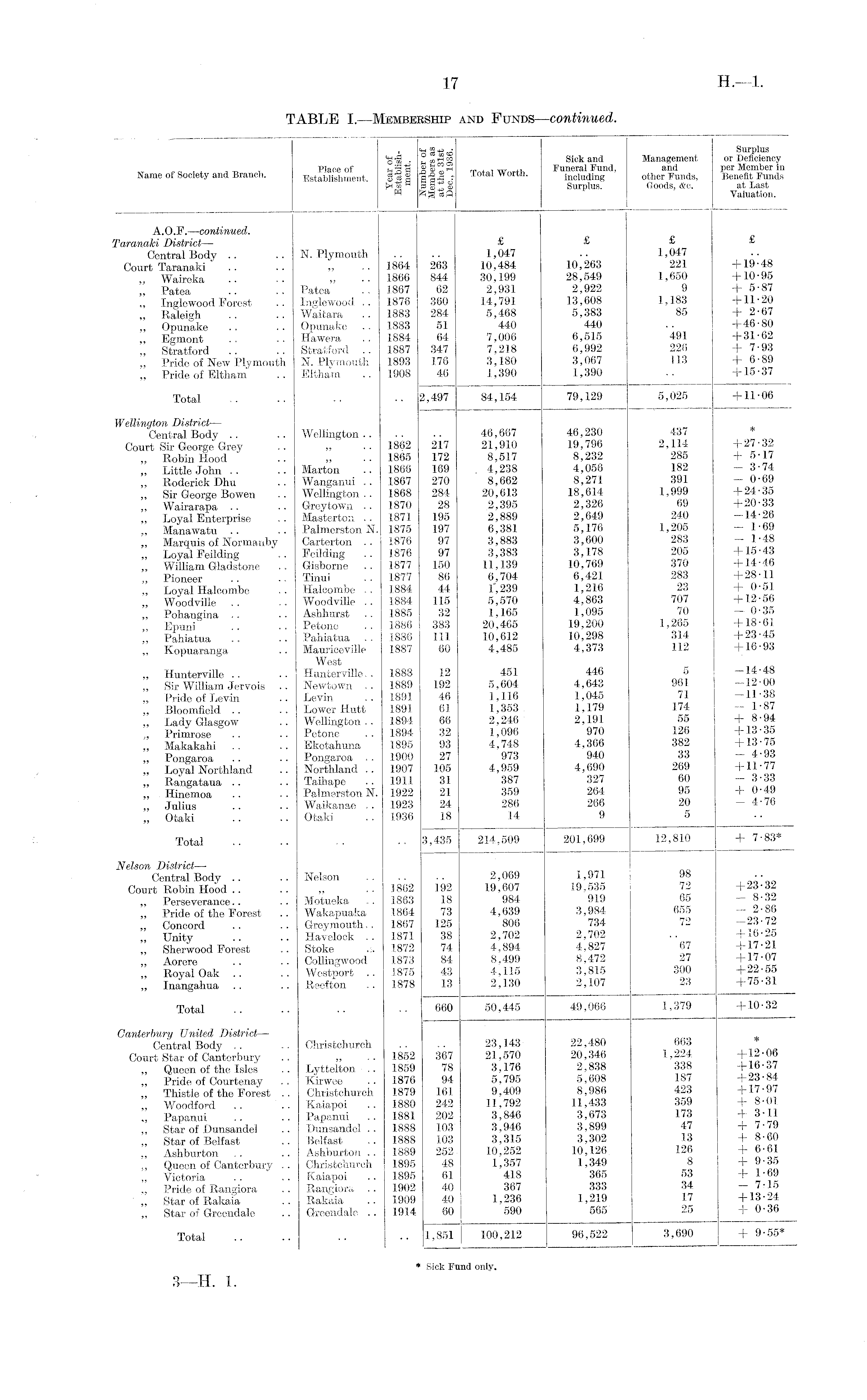 , <w 4J Surplus 'o • 2 1 ~< m Sick and Management or Deficiency Place of K-gci S»"S ™ f , w «u Funeral Fund, and per Member in Name of Society and Branch. Establishment § I'a.S - Total Worth. including other Funds, Benefit Funds S*~« H 3 g≤2 Surplus. Goods, &c. at Last H Valuation. A.O.F. — continued. Taranaki District — £ £ £ £■ Central Body .. .. N.Plymouth .. .. 1,047 .. 1,047 Court Taranaki .. .. „ .. 1864 263 10,484 10,263 221 +19-48 Waireka .. .. ,- •• 1866 844 30,199 28,549 1,650 +10-95 , Patea .. .. Patea .. 1867 62 2,931 2,922 9 +5-87 „ Inglewood Forest .. Inglewood . . 1876 360 14,791 13,608 1,183 +11-20 Raleiph . .. Waitara .. 1883 284 5,468 5,383 85 + 2-67 „ Opunake .. .. Opunake .. 1883 51 440 440 .. +46-80 „ Egmont .. .. Hawera .. 1884 64 7,006 6,515 491 +31-62 „ Stratford .. .. -Stratford .. 1887 347 7,218 6,992 228 + 7-93 „ Pride of New Plymouth N.Plymouth 1893 176 3,180 3,067 113 +6-89 „ Pride of Eltham .. Eltham .. 1908 46 1,390 1,390 .. +15-37 Total .. .. •• •■ 2,497 84,154 79,129 5,025 +11-06 Wellington District — Central Body .. .. Wellington 46,667 46,230 437 * Court Sir George Grey .. „ ■• 1862 217 21,910 19,796 2,114 +27-32 „ Robin Hood .. „ .. 1865 172 8,517 8,232 285 + 5-17 „ Little John .. .. Marton .. 186S 169 . 4,238 4,056 182 -3-74 Roderick Dhu .. Wanganui .. 1867 270 8,662 8,271 391 -0-69 „ Sir George Bowen .. Wellington.. 1868 284 20,613 18,614 1,999 +24-35 „ Wairarapa .. .. Greytown .. 1870 28 2,395 2,326 69 +20-33 Loyal Enterprise .. Mastertoa .. 1871 195 2,889 2,649 240 -14-26 „ Manawatu .. .. Palmerston N. 1875 197 6,381 5,176 1,205 -1-69 „ Marquis of Norman by Carterton .. 1876 97 3,883 3,600 283 -1-48 Loyal Feilding .. Feilding .. 1876 97 3,383 3,178 205 +15-43 , William Gladstone .. Gisborne .. 1877 150 11,139 10,769 370 +14-46 „ Pioneer .. .. Tinui .. 1877 86 6,704 6,421 283 +28-11 „ LoyalHaloom.be .. Halcombe .. 1884 44 1,239 1,216 23 + 0-51 Woodville .. .. Woodville .. 1884 115 5,570 4,863 707 +12-56 „ Pohangina .. .. Ashhurst .. 1885 32 1,165 1,095 70 -0-35 Epuni •• Petone .. 1886 383 20,465 19,200 1,265 +18-61 ' Pahiatua .. .. Pahiatua .. 1886 111 10,612 10,298 314 +23-45 „ Kopuaranga .. Maurioeville 1887 60 4,485 4,373 112 +16-93 West Hunterville .. .. Hunterville.. 1888 12 451 446 5 -14-48 „ Sir William Jervois .. Newtown .. 1889 192 5,604 4,643 961 -12-00 „ Pride of Levin .. Levin .. 1891 46 1,116 1,045 71 -11-38 Bloomfield .. .. Lower Hutt 1891 61 1,353 1,179 174 - 1-87 „ Lady Glasgow .. Wellington.. 1894 66 2,246 2,191 55 +8-94 Primrose .. .. Petone .. 1894 32 1,096 970 126 +13-35 , Makakahi .. .. Eketahuna 1895 93 4,748 4,366 382 +13-75 „ Pongaroa .. .. Pongaroa .. 1900 27 973 940 33 -4-93 „ Loyal Northland .. Northland .. 1907 105 4,959 4,690 269 +11-77 „ Rangataua .. .. Tailiape .. 1911 31 387 327 60 7^33 „ Hinemoa .. .. Palmerston N. 1922 21 359 264 95 +0-49 „ Julius .. .. Waikanae .. 1923 24 286 266 20 - 4-76 „ Otaki .. .. Otaki .. 1936 18 14 9 5 ■■ Total .. .. .. • • 3,435 214,509 201,699 12,810 + 7-83* Nelson District — Central Body .. .. Nelson 2,069 1,971 98 Court Robin Hood .. .. „ ., 1862 192 19,607 19,535 72 +23-32 „ Perseverance.. .. Motueka .. 1863 18 984 919 65 - 8-32 „ Pride of the Forest .. Wakapuaka 1864 73 4,639 3,984 655 -2-86 „ Concord .. .. Greymouth. . 1867 125 806 734 72 „ Unity .. .. Havelook .. 1871 38 2,702 2,702 .. +16-25 „ Sherwood Forest .. Stoke .». 1872 74 4,894 4,827 67 +17-21 Aorere .. .. Collingwood 1873 84 8,499 8,472 27 +17-07 „ Royal Oak .. .. Westport .. 1875 43 4,115 3,815 300 +22-55 „ Inangahua .. .. Reef ton .. 1878 13 2,130 2,107 23 +75-31 Total .. .. .. •• 660 50,445 49,066 1,379 +10-32 Canterbury United District — Central Body .. .. Christchurch .. .. 23,143 22,480 663 * Court Star of Canterbury .. „ .. 1852 367 21,570 20,346 1,224 +12-06 „ Queen of the Isles .. Lyttelton .. 1859 78 3,176 2,838 338 +16-37 „ Pride of Courtenay .. Kirwee .. 1876 94 5,795 5,608 187 +23-84 , Thistle of the Forest .. Christchurch 1879 161 9,409 8,986 423 +17-97 „ Woodford .. .. Kaiapoi .. 1880 242 11,792 11,433 359 +8-01 " Papanui .. .. Papanui .. 1881 202 3,846 3,673 173 + 3-11 Star of Dunsandel .. Dunsandel .. 1888 103' 3,946 3,899 47 +7-(9 „ Star of Belfast .. Belfast .. 1888 103 3,315 3,302 13 + 8-60 ., Ashburton .. .. Ashburton.. 1889 252 10,252 10,126 126 +6-61 „ Queen of Canterbury .. Christcliureh 1895 48 1,357 1,349 8 + 9-35 „ Victoria .. .. Kaiapoi .. 1895 61 418 365 53 +1-69 „ Pride of Rangiora .. Rangiora .. 1902 40 367 333 34 -7-15 • Star of RaTsaia .. Rakaia .. 1909 40 1,236 1,219 17 +13-24 „ Star of Greendale .. Greendale .. 1914 60 590 565 25 + 0-36 Total .. .. .. •• 1,851 100,212 96,522 3,690 + 9-55* • Sick Fund only.