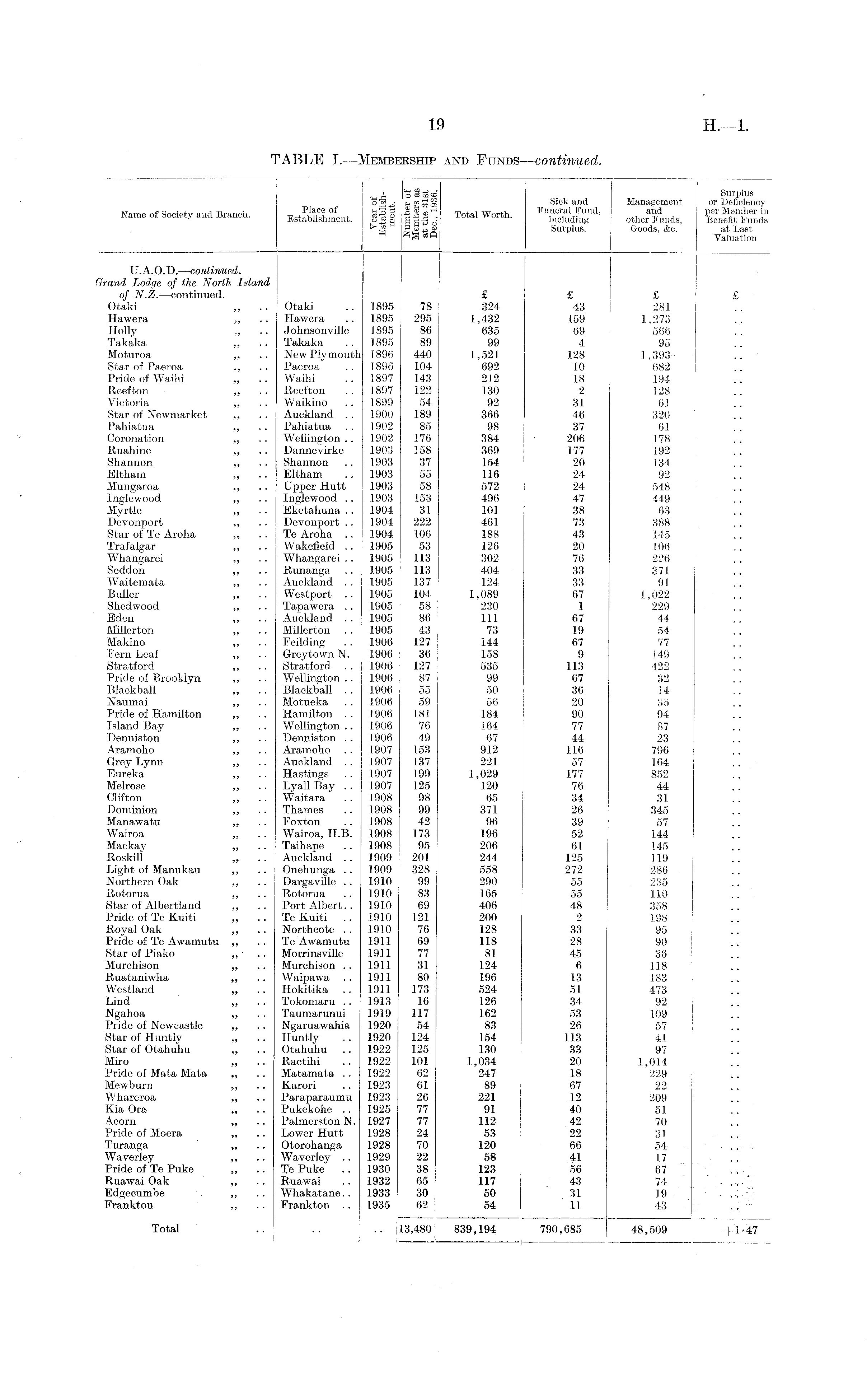 19 H.-L TABLE I.—Membership and Funds—continued. X O«o® Surplus o Sick and Management or Deficiency n f Sncietv arirf Rranch Place of 52 3 £ ā? ® " Total Worth Funeral Fund, and per Member in JName ot society and iirancn. Establishment. liS d including other Funds, Benefit Funds S iS a % Surplus, Goods, Ac. at Last m *0 Valuation U.A.O.D.—continued. Grand Lodge of the North Island of N.Z. —continued. £ £ £ £ Otaki „ .. Otaki .. 1895 78 324 43 281 Hawera „ .. Hawera .. 1895 295 1,432 159 1,273 Holly ,, .. Johnsonville 1895 86 635 69 566 Takaka ,, .. Takaka . . 1895 89 99 4 95 Moturoa „ .. New Plymouth 1896 440 1,521 128 1,393 Star of Paeroa ,, .. Paeroa .. 1896 104 692 10 682 Pride of Waihi „ .. Waihi .. 1897 143 212 18 194 Reefton ,, Reefton .. 1897 122 130 2 128 Victoria ,, .. Waikino .. 1899 54 92 31 61 Star of Newmarket ,, .. Auckland .. 1900 189 366 46 320 Pahiatua ,, .. Pahiatua .. 1902 85 98 37 61 Coronation „ .. Wellington.. 1902 176 384 206 178 Ruahine „ .. Dannevirke 1903 158 369 177 192 Shannon ,, .. Shannon .. 1903 37 154 20 134 Eltham „ .. Eltham .. 1903 55 116 24 92 Mungaroa „ .. Upper Hutt 1903 58 572 24 548 Inglewood „ .. Inglewood .. 1903 153 496 47 449 Myrtle „ .. Eketahuna .. 1904 31 101 38 63 Devonport „ .. Devonport .. 1904 222 461 73 388 Star of Te Aroha ,, .. Te Aroha .. 1904 106 188 43 145 Trafalgar „ .. Wakefield .. 1905 53 126 20 106 Whangarei ,, .. Whangarei .. 1905 113 302 76 226 Seddon „ .. Runanga .. 1905 113 404 33 371 Waitemata „ .. Auckland .. 1905 137 124 33 91 Buller „ .. Westport .. 1905 104- 1,089 67 1,022 Shedwood „ .. Tapawera .. 1905 58 230 1 229 Eden „ .. Auckland .. 1905 86 111 67 44 Millerton „ .. Millerton .. 1905 43 73 19 54 Makino „ .. Feilding . . 1906 127 144 67 77 Fern Leaf ,, .. Greytown N. 1906 36 158 9 149 Stratford ,, .. Stratford .. 1906 127 535 113 422 Pride of Brooklyn „ .. Wellington .. 1906 87 99 67 32 Blackball ,, .. Blackball . . 1906 55 50 36 14 Naumai „ .. Motueka . . 1906 59 56 20 36 Pride of Hamilton „ .. Hamilton . . 1906 181 184 90 94 Island Bay ,, .. Wellington .. 1906 76 164 77 87 Denniston „ .. Denniston .. 1906 49 67 44 23 Aramoho „ .. Aramoho .. 1907 153 912 116 796 Grey Lynn „ .. Auckland .. 1907 137 221 57 164 Eureka „ .. Hastings .. 1907 199 1,029 177 852 Melrose „ .. Lyall Bay .. 1907 125 120 76 44 Clifton ,, .. Waitara .. 1908 98 65 34 31 Dominion „ .. Thames .. 1908 99 371 26 345 Manawatu ,, .. Foxton .. 1908 42 96 39 57 Wairoa „ .. Wairoa, H.B. 1908 173 196 52 144 Mackay ,, .. Taihape .. 1908 95 206 61 145 Roskill „ .. Auckland .. 1909 201 244 125 119 Light of Manukau ,, .. Onehunga . . 1909 328 558 272 286 Northern Oak ,, .. Dargaville .. 1910 99 290 55 235 Rotorua ,, .. Rotorua .. 1910 83 165 55 110 Star of Albertland „ .. Port Albert.. 1910 69 406 48 358 Pride of Te Kuiti „ .. Te Kuiti .. 1910 121 200 2 198 Royal Oak ,, .. Northcote .. 1910 76 128 33 95 Pride of Te Awamutu „ .. Te Awamutu 1911 69 118 28 90 Star of Piako ,, ■ .. Morrinsville 1911 77 81 45 36 Murchison „ .. Murehison .. 1911 31 124 6 118 Ruataniwha ,, .. Waipawa .. 1911 80 196 13 183 Westland ,, .. Hokitika .. 1911 173 524 51 473 Lind „ .. Tokomaru .. 1913 16 126 34 92 Ngahoa ,, .. Taumarunui 1919 117 162 53 109 Pride of Newcastle „ .. Ngaruawahia 1920 54 83 26 57 Star of Huntly „ .. Huntly .. 1920 124 154 113 41 Star of Otahuhu ,, .. Otahuhu .. 1922 125 130 33 97 Miro ,, .. Raetihi .. 1922 101 1,034 20 1,014 Pride of Mata Mata ,, .. Matamata . . 1922 62 247 18 229 Mewburn ,, .. Karori .. 1923 61 89 67 22 Whareroa „ .. Paraparaumu 1923 26 221 12 209 Kia Ora ,, .. Pukekohe .. 1925 77 91 40 51 Acorn „ .. Palmerston N. 1927 77 112 42 70 Pride of Moera „ .. Lower Hutt 1928 24 53 22 31 Turanga ,, .. Otorohanga 1928 70 120 66 54 Waverley „ .. Waverley .. 1929 22 58 41 17 Pride of Te Puke „ .. Te Puke .. 1930 38 123 56 67 Ruawai Oak ,, .. Ruawai .. 1932 65 117 43 74 ■ . . - Edgecumbe „ Whakatane.. 1933 30 50 31 19 . .-I Frankton ,, .. Frankton .. 1935 62 54 11 43 Total .. .. .. 13,480 839,194 790,685 48,509 +1-47