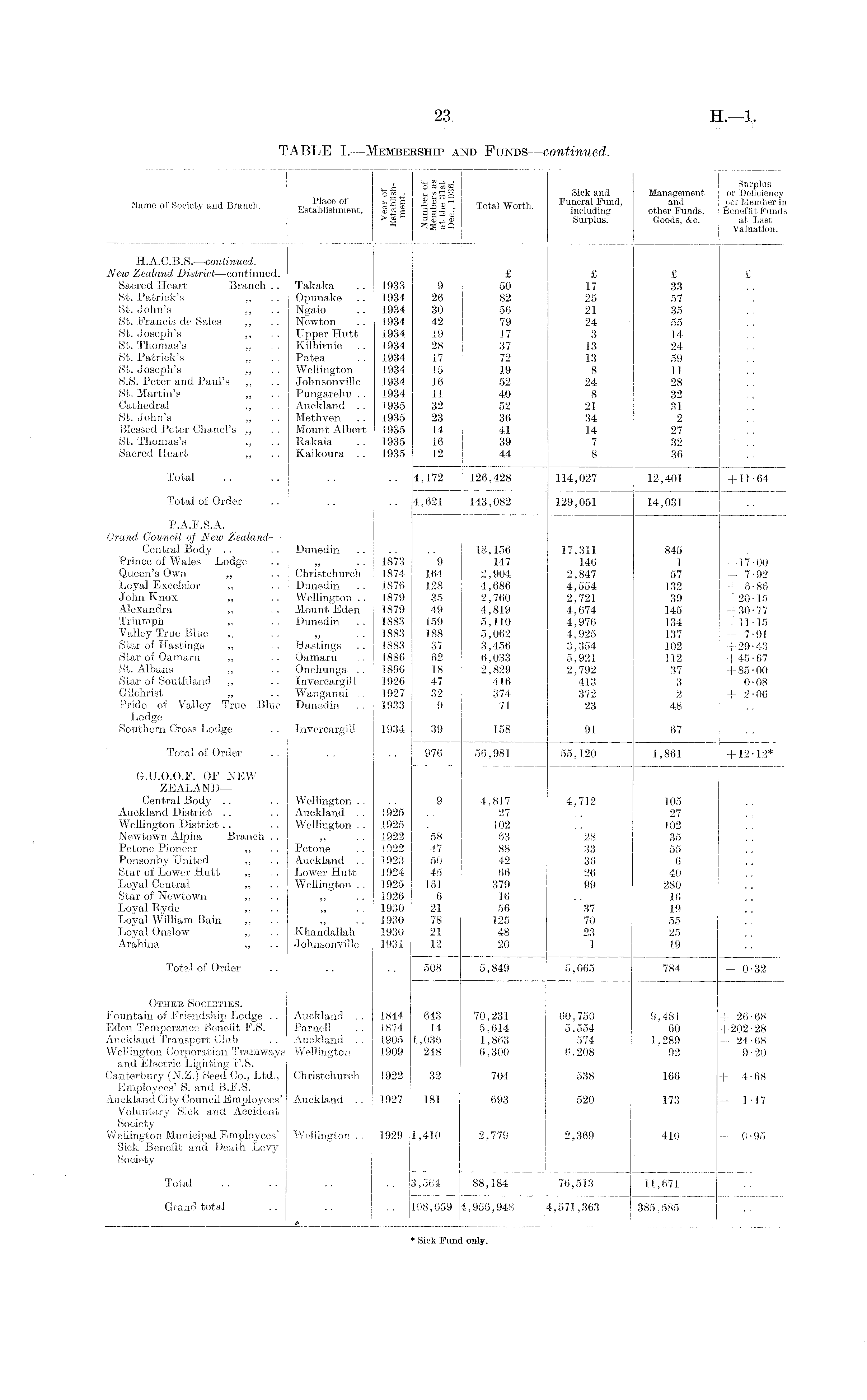 23 H.—1. TABLE I.—Membership and Funds—continued. ■ o esto<0 Surplus © s 43 £ co cj ®ick an< i Management or Deficiency Name of Society and Branch. + Si S I.Sgl Total Worth. Funeral Fund, and perMemberin * Establishment. S SgS 0 including other Funds, Benefttt Funds ā ~ Surplus. Goods, &c. at Last w Sg «Q Valuation. H.A.C.B.S. —continued. New Zealand District—continued. £ £ £ £ Sacred Heart Branch .. Takaka .. 1933 9 50 17 33 St. Patrick's ,, .. Opunake .. 1934 26 82 25 57 St. John's „ .. Ngaio .. 1934 30 56 21 35 St. Francis de Sales ,, .. Newton .. 1934 42 79 24 55 St. Joseph's Upper Hutt 1934 19 17 3 14 St. Thomas's ,, .. Kilbirnie .. 1934 28 37 13 24 St. Patrick's ,, .. Patea .. 1934 17 72 13 59 St. Joseph's ,, .. Wellington 1934 15 19 8 11 S.S. Peter and Paul's ,, .. Johnsonville 1934 16 52 24 28 St. Martin's „ .. Pungarehu .. 1934 11 40 8 32 Cathedral ,, .. Auckland .. 1935 32 52 21 31 St. John's „ .. Methven .. 1935 23 36 34 2 Blessed Peter Chanel's ,, . . Mount Albert 1935 14 41 14 27 St. Thomas's ,, .. Rakaia .. 1935 16 39 7 32 Sacred Heart ,, .. Kaikoura .. 1935 12 44 8 36 Total .. .. .. .. 4,172 126,428 114,027 12,401 +11-64 Total of Order .. .. .. 4,621 143,082 129,051 14,031 P.A.F.S.A. Grand Council of New Zealand — Central Body .. .. Dunedin .. .. .. 18,156 17,311 845 Prince of Wales Lodge .. „ .. 1873 9 147 146 1 —17-00 Queen's Own „ .. Christchurch 1874 164 2,904 2,847 57 — 7-92 Loyal Excelsior „ .. Dunedin •• 1876 128 4,686 4,554 132 + 6-86 John Knox „ .. Wellington.. 1879 35 2,760 2,721 39 +20-15 Alexandra „ .. Mount Eden 1879 49 4,819 4,674 145 +30-77 Triumph „ .. Dunedin .. 1883 159 5,110 4,976 134 +11-15 Valley True Blue „ .. „ .. 1883 188 5,062 4,925 137 + 7-91 Star of Hastings „ .. Hastings .. 1883 37 3,456 3,354 102 +29-43 Star of Oamaru „ .. Oamaru .. 1886 62 6,033 5,921 112 +45-67 St. Albans „ . . Onehunga . . 1896 18 2,829 2,792 37 +85-00 Star of Southland „ .. Invercargill 1926 47 416 413 3 — 0-08 Gilchrist „ .. Wanganui . . 1927 32 374 372 2 + 2.-06 Pride of Valley True Blue Dunedin . . 1933 9 71 23 48 Lodge Southern Cross Lodge .. Invercargill 1934 39 158 91 67 Total of Order .. .. .. 976 56,981 55,120 1,861 +12-12* G.U.O.O.F. OE NEW ZEALAND— Central Body .. .. Wellington.. .. 9 4,817 4,712 105 Auckland District .. . . Auckland .. 1925 .. 27 ' . 27 Wellington District .. . . Wellington . 1925 .. 102 . . 102 Newtown Alpha Branch .. „ . . 1922 58 63 28 35 Petone Pioneer „ .. Petone .. 1922 47 88 33 55 Ponsonby United „ .. Auckland . , 1923 50 42 36 6 Star of Lower Hutt „ .. Lower Hutt 1924 45 66 26 40 Loyal Central „ . . Wellington .. 1925 161 379 99 280 Star of Newtown „ „ .. 1926 6 16 .. 16 Loyal Ryde „ „ .. 1930 21 56 37 19 Loyal William Bain „ „ .. 1930 78 125 70 55 Loyal Onslow „ .. Khandallah 1930 21 48 23 25 Arahina „ .. Johnsonville 1931 12 20 1 19 Total of Order . . .. . . 508 5,849 5,065 784 - 0-32 Othek Societies. Fountain of Friendship Lodge .. Auckland .. 1844 643 70,231 60,750 9,481 + 26-68 Eden Temperance Benefit F.S. Parnell .. 1874 14 5,614 5,554 60 +202-28 Auckland Transport Club .. Auckland .. 1905 1,036 1,863 574 1,289 — 24-68 Wellington Corporation Tramways Wellington 1909 248 6,300 6,208 92 + 9-20 and Electric Lighting F.S. Canterbury (N.Z.) Seed Co., Ltd., Christchurch 1922 32 704 538 166 + 4-68 Employees' S. and B.F.S. Auckland City Council Employees' Auckland .. 1927 181 693 520 173 — 1-17 Voluntary Sick and Accident Society Wellington Municipal Employees' Wellington .. 1929 1,410 2,779 2,369 410 — 0-95 Sick Benefit and Death Levy Society Total .. .. .. .. 3,564 88,184 76,513 11,671 Grand total .. .. .. 108,059 4,956,948 4,571,363 385,585 » ■ ■ * Sick Fund only.