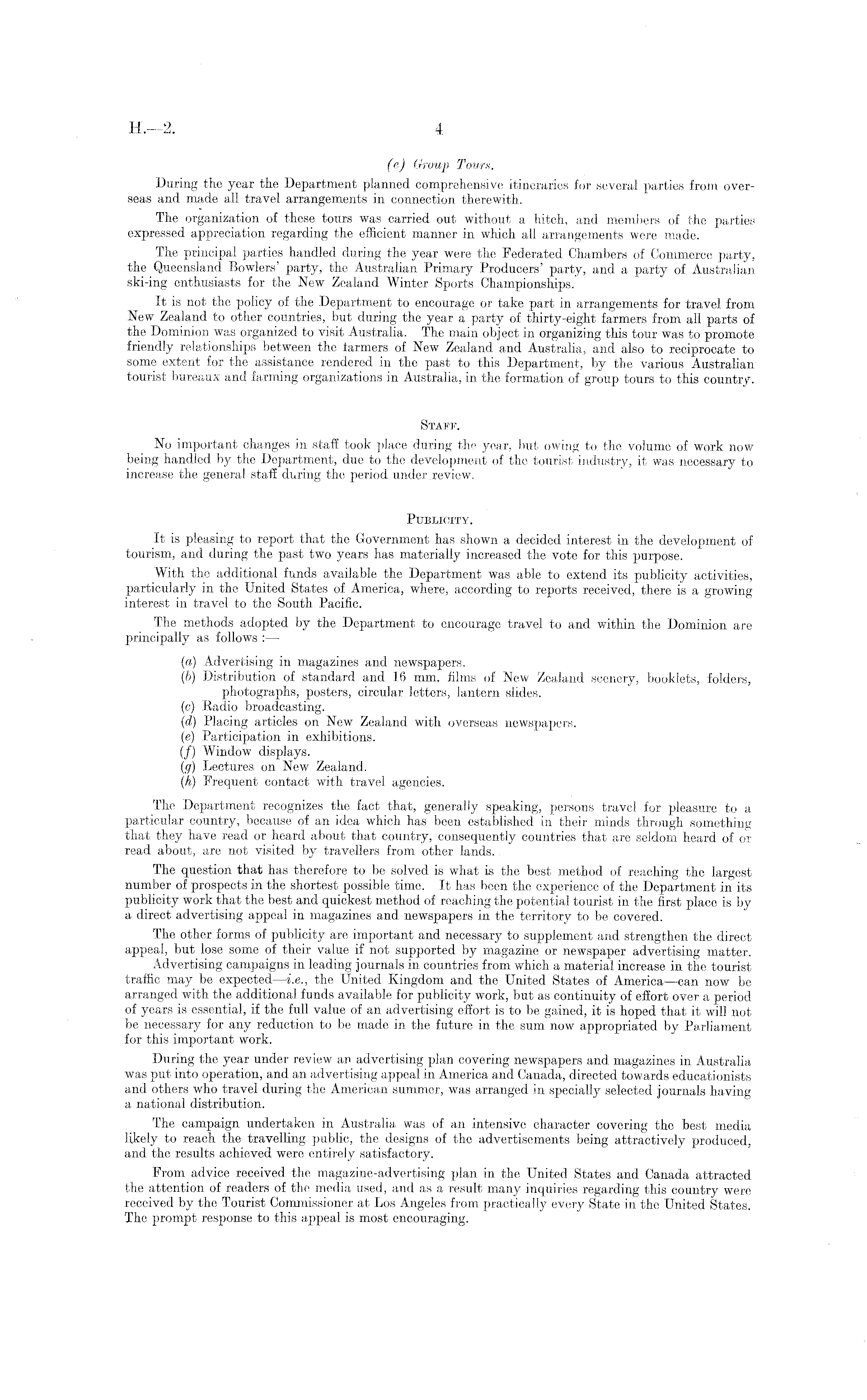 (e) Group Tours. During the year the Department planned comprehensive itineraries for several parties from overseas and made all travel arrangements in connection therewith. The organization of these tours was carried out without a hitch, and members of the parties expressed appreciation regarding the efficient manner in which all arrangements were made. The principal parties handled during the year were the Federated Chambers of Commerce party, the Queensland Bowlers' party, the Australian Primary Producers' party, and a party of Australian ski-ing enthusiasts for the New Zealand Winter Sports Championships. It is not the policy of the Department to encourage or take part in arrangements for travel from New Zealand to other countries, but during the year a party of thirty-eight farmers from all parts of the Dominion was organized to visit Australia. The main object in organizing this tour was to promote friendly relationships between the farmers of New Zealand and Australia, and also to reciprocate to some extent for the assistance rendered in the past to this Department, by the various Australian tourist bureaux and farming organizations in Australia, in the formation of group tours to this country. Staff. No important changes in staff took place during the year, but owing to the volume of work now being handled by the Department, due to the development of the tourist industry, it was necessary to increase the general staff during the period under review. Publicity. It is pleasing to report that the Government has shown a decided interest in the development of tourism, and during the past two years has materially increased the vote for this purpose. With the additional funds available the Department was able to extend its publicity activities, particularly in the United States of America, where, according to reports received, there is a growing interest in travel to the South Pacific. The methods adopted by the Department to encourage travel to and within the Dominion are principally as follows : — (a) Advertising in magazines and newspapers. (b) Distribution of standard and 16 mm. films of New Zealand scenery, booklets, folders, photographs, posters, circular letters, lantern slides. (c) Radio broadcasting. (d) Placing articles on New Zealand with overseas newspapers. (e) Participation in exhibitions. (/) Window displays. (g) Lectures on New Zealand. (h) Frequent contact with travel agencies. The Department recognizes the fact that, generally speaking, persons travel for pleasure to a particular country, because of an idea which has been established in their minds through something that they have read or heard about that country, consequently countries that are seldom heard of or read about, are not visited by travellers from other lands.. The question that has therefore to be solved is what is the best method of reaching the largest number of prospects in the shortest possible time. It has been the experience of the Department in its publicity work that the best and quickest method of reaching the potential tourist in the first place is by a direct advertising appeal in magazines and newspapers in the territory to be covered. The other forms of publicity are important and necessary to supplement and strengthen the direct appeal, but lose some of their value if not supported by magazine or newspaper advertising matter. Advertising campaigns in leading journals in countries from which a material increase in the tourist traffic may be expected —i.e., the United Kingdom and the United States of America—can now be arranged with the additional funds available for publicity work, but as continuity of effort over a period of years is essential, if the full value of an advertising effort is to be gained, it is hoped that it will not be necessary for any reduction to be made in the future in the sum now appropriated by Parliament for this important work. During the year under review an advertising plan covering newspapers and magazines in Australia was put into operation, and an advertising appeal in America and Canada, directed towards educationists and others who travel during the American summer, was arranged in specially selected journals having a national distribution. The campaign undertaken in Australia was of an intensive character covering the best media likely to reach the travelling public, the designs of the advertisements being attractively produced, and the results achieved were entirely satisfactory. From advice received the magazine-advertising plan in the United States and Canada attracted the attention of readers of the media used, and as a result many inquiries regarding this country were received by the Tourist Commissioner at Los Angeles from practically every State in the United States. The prompt resjionse to this appeal is most encouraging.