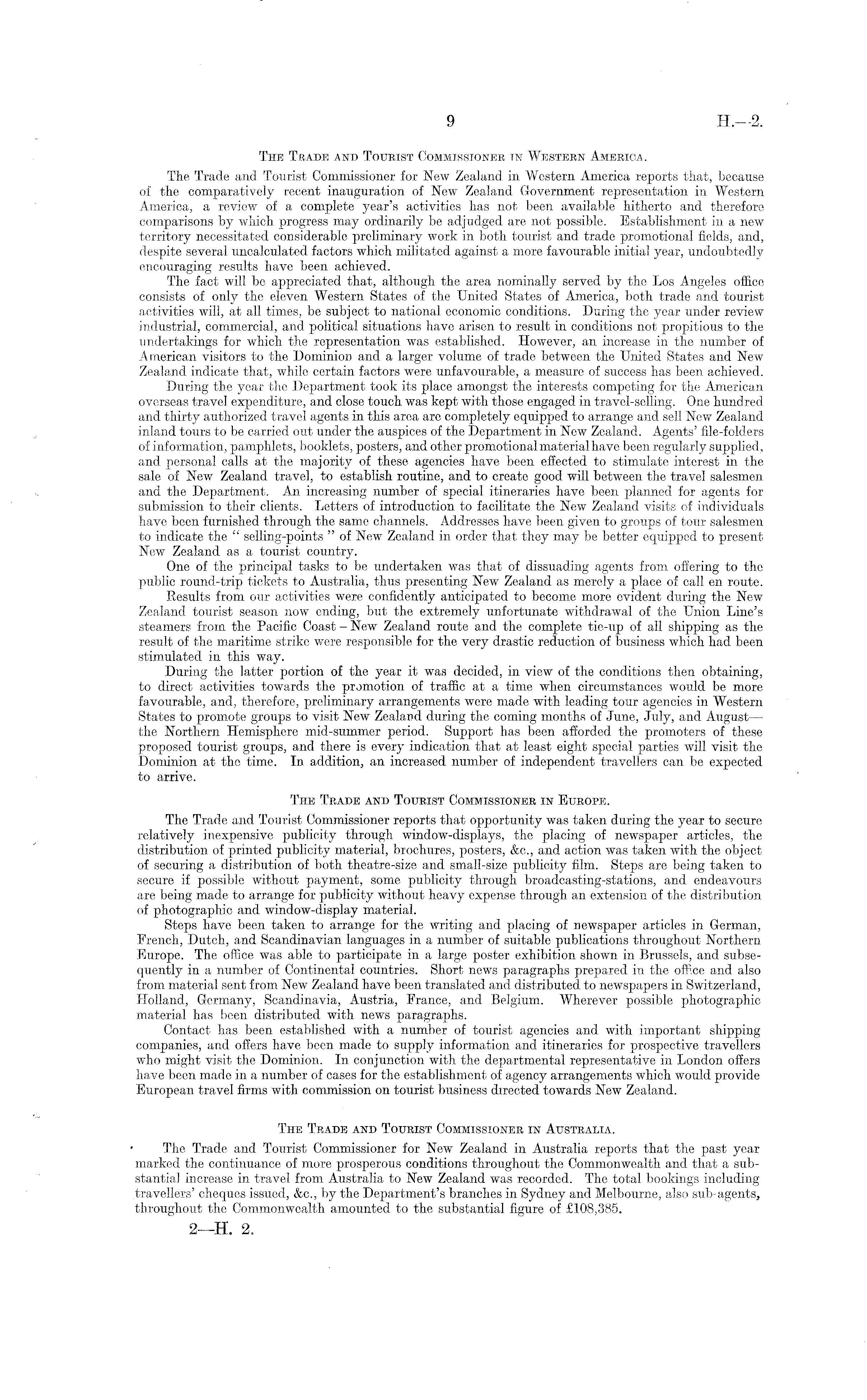 The Trade and Tourist Commissioner in Western America. The Trade and Tourist Commissioner for New Zealand in Western America reports that, because of the comparatively recent inauguration of New Zealand Government representation in Western America, a review of a complete year's activities has not been available hitherto and therefore comparisons by which progress may ordinarily be adjudged are not possible. Establishment in a new territory necessitated considerable preliminary work in both tourist and trade promotional fields, and, despite several uncalculated factors which militated against a more favourable initial year, undoubtedly encouraging results have been achieved. The fact will be appreciated that, although the area nominally served by the Los Angeles office consists of only the eleven Western States of the United States of America, both trade and tourist activities will, at all times, be subject to national economic conditions. During the year under review industrial, commercial, and political situations have arisen to result in conditions not propitious to the undertakings for which the representation was established. However, an increase in the number of American visitors to the Dominion and a larger volume of trade between the United States and New Zealand indicate that, while certain factors were unfavourable, a measure of success has been achieved. During the year the Department took its place amongst the interests competing for the American overseas travel expenditure, and close touch was kept with those engaged in travel-selling. One hundred and thirty authorized travel agents in this area are completely equipped to arrange and sell New Zealand inland tours to be carried out under the auspices of the Department in New Zealand. Agents' file-folders of information, pamphlets, booklets, posters, and other promotional material have been regularly supplied, and personal calls at the majority of these agencies have been effected to stimulate interest in the sale of New Zealand travel, to establish routine, and to create good will between the travel salesmen and the Department. An increasing number of special itineraries have been planned for agents for submission to their clients. Letters of introduction to facilitate the New Zealand visits of individuals have been furnished through the same channels. Addresses have been given to groups of tour salesmen to indicate the " selling-points " of New Zealand in order that they may be better equipped to present New Zealand as a tourist country. One of the principal tasks to be undertaken was that of dissuading agents from offering to the public round-trip tickets to Australia, thus presenting New Zealand as merely a place of call en route. Results from onr activities were confidently anticipated to become more evident during the New Zealand tourist season now ending, but the extremely unfortunate withdrawal of the Union Line's steamers from the Pacific Coast - New Zealand route and the complete tie-up of all shipping as the result of the maritime strike were responsible for the very drastic reduction of business which had been stimulated in this way. During the latter portion of the year it was decided, in view of the conditions then obtaining, to direct activities towards the promotion of traffic at a time when circumstances would be more favourable, and, therefore, preliminary arrangements were made with leading tour agencies in Western States to promote groups to visit New Zealand during the coming months of June, July, and August— the Northern Hemisphere mid-summer period. Support has been afforded the promoters of these proposed tourist groups, and there is every indication that at least eight special parties will visit the Dominion at the time. In addition, an increased number of independent travellers can be expected to arrive. The Trade and Tourist Commissioner in Europe. The Trade and Tourist Commissioner reports that opportunity was taken during the year to secure relatively inexpensive publicity through window-displays, the placing of newspaper articles, the distribution of printed publicity material, brochures, posters, &c., and action was taken with the object of securing a distribution of both theatre-size and small-size publicity film. Steps are being taken to secure if possible without payment, some publicity through broadcasting-stations, and endeavours are being made to arrange for publicity without heavy expense through an extension of the distribution of photographic and window-display material. Steps have been taken to arrange for the writing and placing of newspaper articles in German, French, Dutch, and Scandinavian languages in a number of suitable publications throughout Northern Europe. The office was able to participate in a large poster exhibition shown in Brussels, and subsequently in a number of Continental countries. Short news paragraphs prepared in the office and also from material sent from New Zealand have been translated and distributed to newspapers in Switzerland, Holland, Germany, Scandinavia, Austria, France, and Belgium. Wherever possible photographic material has been distributed with news paragraphs. Contact has been established with a number of tourist agencies and with important shipping companies, and offers have been made to supply information and itineraries for prospective travellers who might visit the Dominion. In conjunction with the departmental representative in London offers have been made in a number of cases for the establishment of agency arrangements which would provide European travel firms with commission on tourist business directed towards New Zealand. The Trade and Tourist Commissioner in Australia. The Trade and Tourist Commissioner for New Zealand in Australia reports that the past year marked the continuance of more prosperous conditions throughout the Commonwealth and that a substantial increase in travel from Australia to New Zealand was recorded. The total booki
