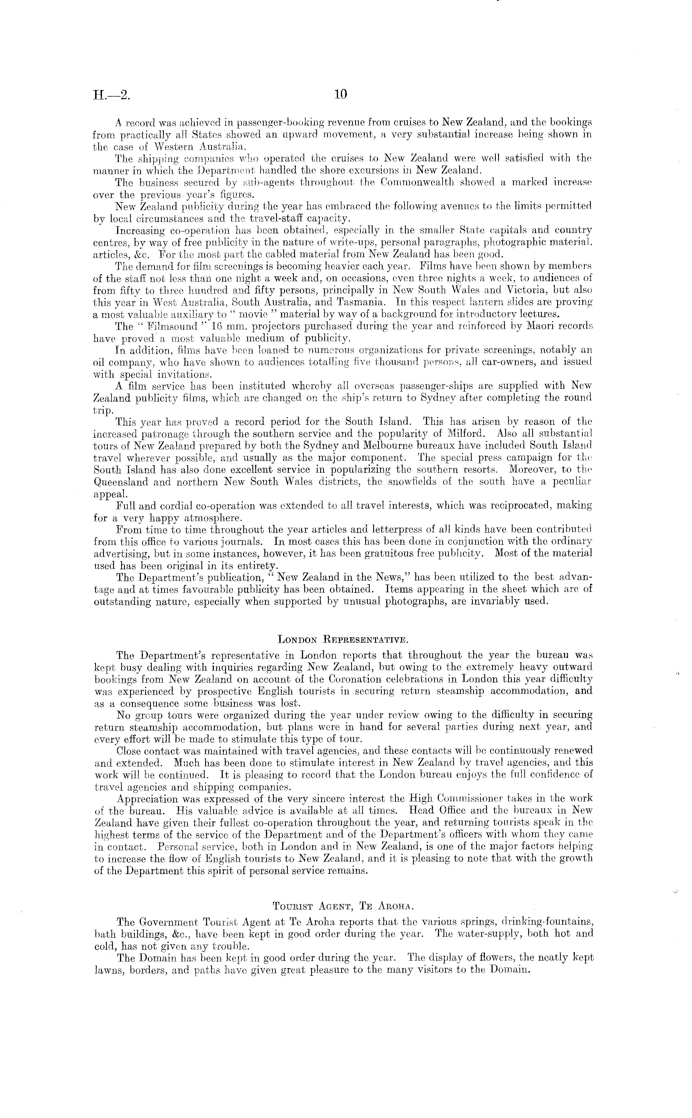 A record was achieved in passenger-booking revenue from cruises to New Zealand, and the bookings from practically all States showed an upward movement, a very substantial increase being shown in the case of Western Australia. The shipping companies who operated the cruises to New Zealand were well satisfied with the manner in which the Department handled the shore excursions in New Zealand. The business secured by sub-agents throughout the Commonwealth showed a marked increase over the previous year's figures. New Zealand publicity during the year has embraced the following avenues to the limits permitted by local circumstances and the travel-staff capacity. Increasing co-operation has been obtained, especially in the smaller State capitals and country centres, by way of free publicity in the nature of write-ups, personal paragraphs, photographic material, articles, &c. For the most part the cabled material from New Zealand has been good. The demand for film screenings is becoming heavier each year. Films have been shown by members of the staff not less than one night a week and, on occasions, even three nights a week, to audiences of from fifty to three hundred and fifty persons, principally in New South Wales and Victoria, but also this year in West Australia, South Australia, and Tasmania. In this respect lantern slides are proving a most valuable auxiliary to " movie " material by way of a background for introductory lectures. The " Filmsound 16 mm. projectors purchased during the year and reinforced by Maori records have proved a most valuable medium of publicity. In addition, films have been loaned to numerous organizations for private screenings, notably an oil company, who have shown to audiences totalling five thousand persons, all car-owners, and issued with special invitations. A film service has been instituted whereby all overseas passenger-ships are supplied with New Zealand publicity films, which are changed on the ship's return to Sydney after completing the round trip. This year has proved a record period for the South Island. This has arisen by reason of the increased patronage through the southern service and the popularity of Milford. Also all substantial tours of New Zealand prepared by both the Sydney and Melbourne bureaux have included South Island travel wherever possible, and usually as the major component. The special press campaign for the South Island has also done excellent service in popularizing the southern resorts. Moreover, to the Queensland and northern New South Wales districts, the snowfields of the south have a peculiar appeal. Full and cordial co-operation was extended to all travel interests, which was reciprocated, making for a very happy atmosphere. From time to time throughout the year articles and letterpress of all kinds have been contributed from this oflice to various journals. In most cases this has been done in conjunction with the ordinary advertising, but in some instances, however, it has been gratuitous free publicity. Most of the material used has been original in its entirety. The Department's publication, " New Zealand in the News," has been utilized to the best advantage and at times favourable publicity has been obtained. Items appearing in the sheet which are of outstanding nature, especially when supported by unusual photographs, are invariably used. London Representative. The Department's representative in London reports that throughout the year the bureau was kept busy dealing with inquiries regarding New Zealand, but owing to the extremely heavy outward bookings from New Zealand on account of the Coronation celebrations in London this year difficulty was experienced by prospective English tourists in securing return steamship accommodation, and as a consequence some business was lost. No group tours were organized during the year under review owing to the difficulty in securing return steamship accommodation, but plans were in hand for several parties during next year, and every effort will be made to stimulate this type of tour. Close contact was maintained with travel agencies, and these contacts will be continuously renewed and extended. Much has been done to stimulate interest in New Zealand by travel agencies, and this work will be continued. It is pleasing to record that the London bureau enjoys the full confidence of travel agencies and shipping companies. Appreciation was expressed of the very sincere interest the High Commissioner takes in the work of the bureau. His valuable advice is available at all times. Head Office and the bureaux in New Zealand have given their fullest co-operation throughout the year, and returning tourists speak in the highest terms of the service of the Department and of the Department's officers with whom they came in contact. Personal service, both in London and in New Zealand, is one of the major factors helping to increase the flow of English tourists to New Zealand, and it is pleasing to note that with the growth of the Department this spirit of personal service remains. Tourist Agent, Te Aroha. The Government Tourist Agent at Te Aroha reports that the various springs, drinking-fountains, bath buildings, &c., have been kept in good order during the year. The water-supply, both hot and cold, has not given any trouble. The Domain has been kept in good order during the year. The display of flowers, the neatly kept lawns, borders, and paths have given great pleasure to the many visitors to the Domain.