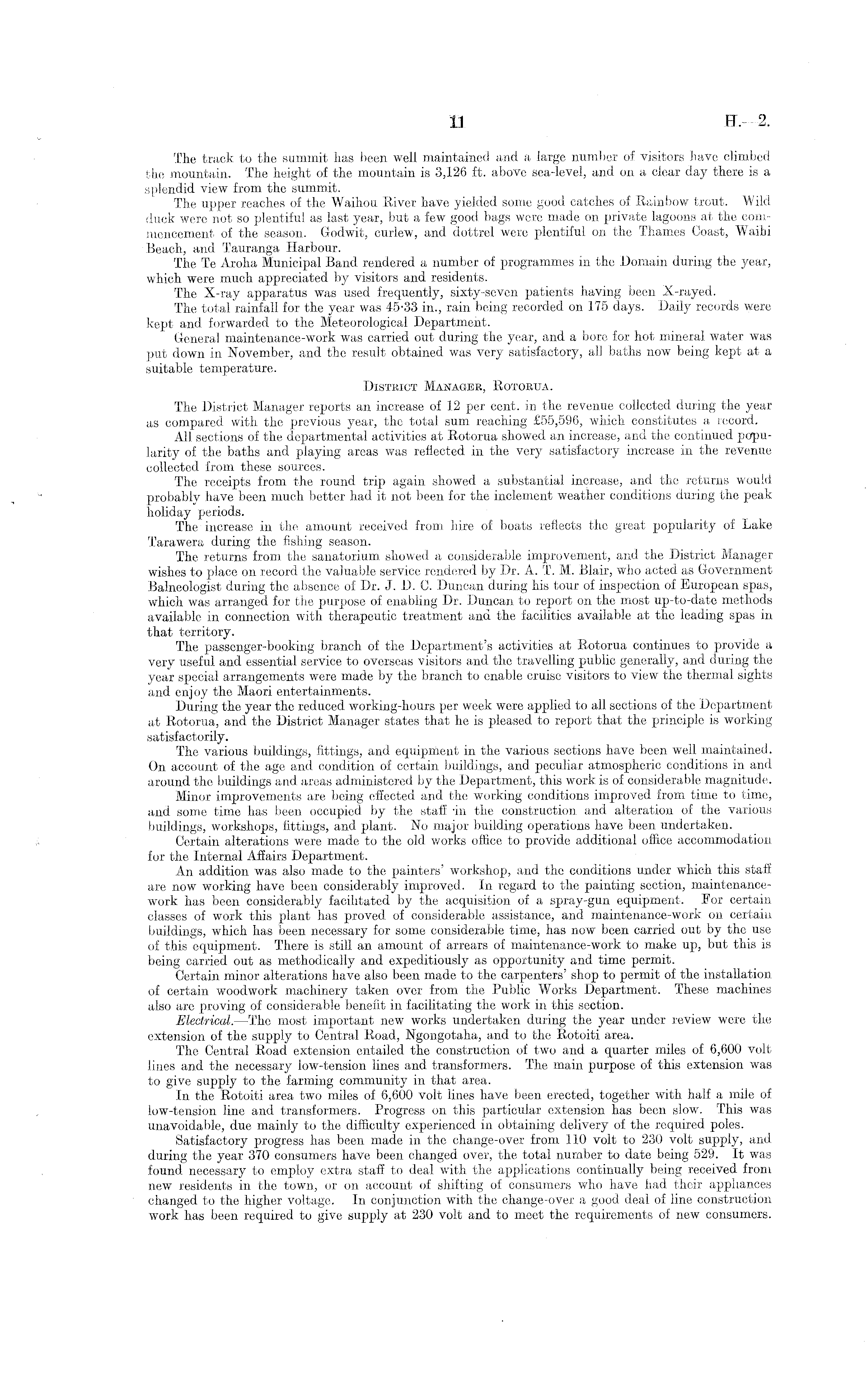 The track to the summit has been well maintained and a large number of visitors have climbed the mountain. The height of the mountain is 3,126 ft. above sea-level, and on a clear clay there is a splendid view from the summit. The upper reaches of the Waihou River have yielded some good catches of Rainbow trout. Wild duck were not so plentiful as last year, but a few good bags were made on private lagoons at the commencement of the season. Godwit, curlew, and dottrel were plentiful on the Thames Coast, Waihi Beach, and Tauranga Harbour. The Te Aroha Municipal Band rendered a number of programmes in the Domain during the year, which were much appreciated by visitors and residents. The X-ray apparatus was used frequently, sixty-seven patients having been X-rayed. The total rainfall for the year was 45-33 in., rain being recorded on 175 days. Daily records were kept and forwarded to the Meteorological Department. General maintenance-work was carried out during the year, and a bore for hot mineral water was put down in November, and the result obtained was very satisfactory, all baths now being kept at a suitable temperature. District Manager, Rotobua. The District Manager reports an increase of 12 per cent, in the revenue collected during the year as compared with the previous year, the total sum reaching £55,596, which constitutes a record. All sections of the departmental activities at Rotorua showed an increase, and the continued popularity of the baths and playing areas was reflected in the very satisfactory increase in the revenue collected from these sources. The receipts from the round trip again showed a substantial increase, and the returns would probably have been much better had it not been for the inclement weather conditions during the peak holiday periods. The increase in the amount received from hire of boats reflects the great popularity of Lake Tarawera during the fishing season. The returns from the sanatorium showed a considerable improvement, and the District Manager wishes to place on record the valuable service rendered by Dr. A. T. M. Blair, who acted as Government Balneologist during the absence of Dr. J. D. G. Duncan during his tour of inspection of European spas, which was arranged for the purpose of enabling Dr. Duncan to report on the most up-to-date methods available in connection with therapeutic treatment and the facilities available at the leading spas in that territory. The passenger-booking branch of the Department's activities at Rotorua continues to provide a very useful and essential service to overseas visitors and the travelling public generally, and during the year special arrangements were made by the branch to enable cruise visitors to view the thermal sights and enjoy the Maori entertainments. During the year the reduced working-hours per week were applied to all sections of the Department at Rotorua, and the District Manager states that he is pleased to report that the principle is working satisfactorily. The various buildings, fittings, and equipment in the various sections have been well maintained. On account of the age and condition of certain buildings, and peculiar atmospheric conditions in and around the buildings and areas administered by the Department, this work is of considerable magnitude. Minor improvements are being effected and the working conditions improved from time to time, and some time has been occupied by the staff -in the construction and alteration of the various buildings, workshops, fittings, and plant. No major building operations have been undertaken. Certain alterations were made to the old works office to provide additional office accommodation for the Internal Affairs Department. An addition was also made to the painters' workshop, and the conditions under which this staff are now working have been considerably improved. In regard to the painting section, maintenancework has been considerably facilitated by the acquisition of a spray-gun equipment. For certain classes of work this plant has proved of considerable assistance, and maintenance-work on certain buildings, which has been necessary for some considerable time, has now been carried out by the use of this equipment. There is still an amount of arrears of maintenance-work to make up, but this is being carried out as methodically and expeditiously as opportunity and time permit. Certain minor alterations have also been made to the carpenters' shop to permit of the installation of certain woodwork machinery taken over from the Public Works Department. These machines also are proving of considerable benefit in facilitating the work in this section. Electrical. —The most important new works undertaken during the year under review were the extension of the supply to Central Road, Ngongotaha, and to the Rotoiti area. The Central Road extension entailed the construction of two and a quarter miles of 6,600 volt lines and the necessary low-tension lines and transformers. The main purpose of this extension was to give supply to the farming community in that area. In the Rotoiti area two miles of 6,600 volt lines have been erected, together with half a mile of low-tension line and transformers. Progress on this particular extension has been slow. This was unavoidable, due mainly to the difficulty experienced in obtaining delivery of the required poles. Satisfactory progress has been made in the change-over from 110 volt to 230 volt supply, and during the year 370 consumers have been changed over, the total number to date being 529. It was found necessary to employ extra staff to deal with the applications continually being received from new residents in the town, or on account of shifting of consumers who have had their appliances changed to the higher voltage. In conjunction with the change-over a good deal of line construction work has been required to give supply at 230 volt and to meet the requirements of new consumers.