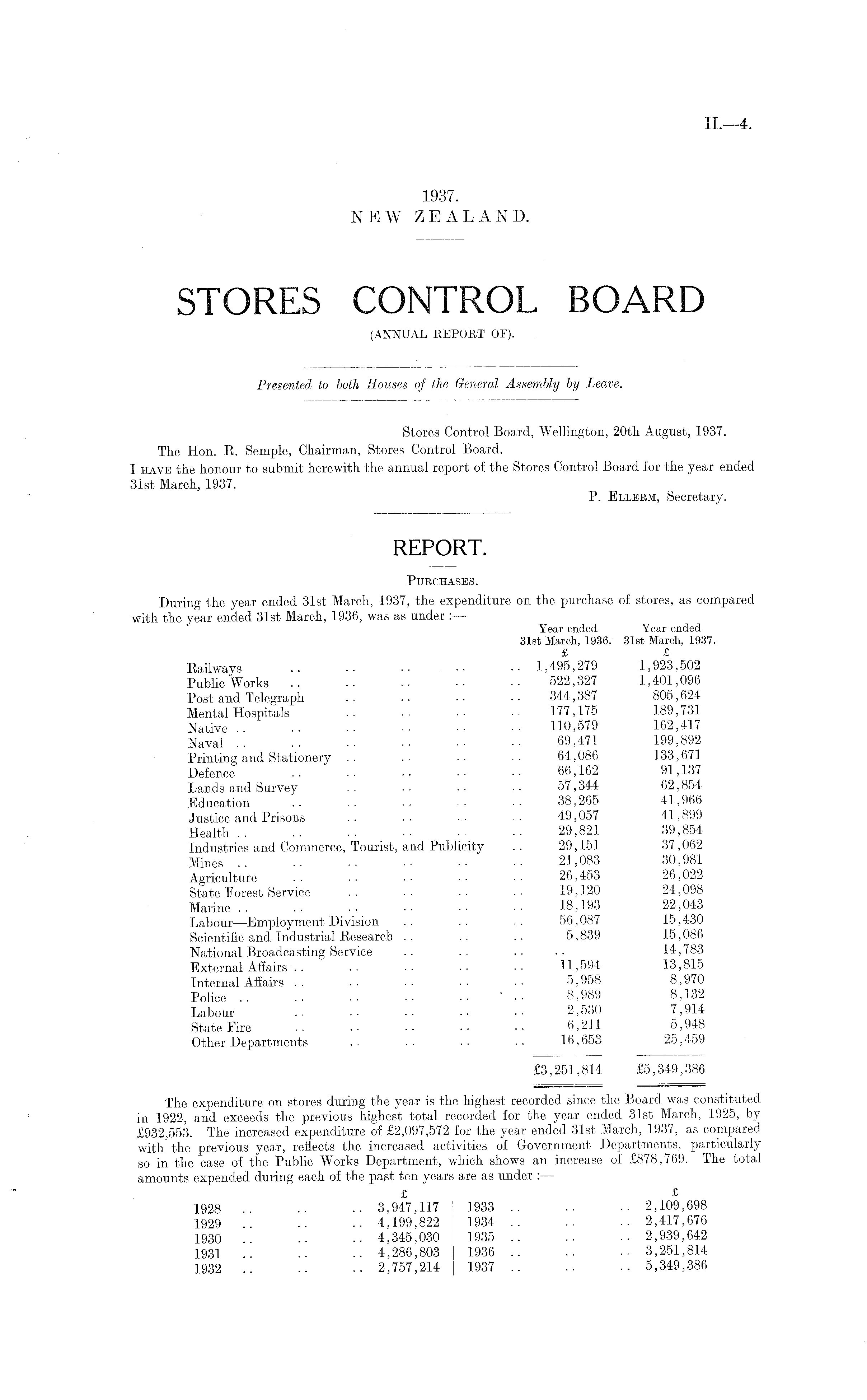 Stores Control Board, Wellington, 20tli August, 1937. The Hon. R. Seniple, Chairman, Stores Control Board. I have the honour to submit herewith the annual report of the Stores Control Board for the year ended 31st March, 1937. P. Ellerm, Secretary.