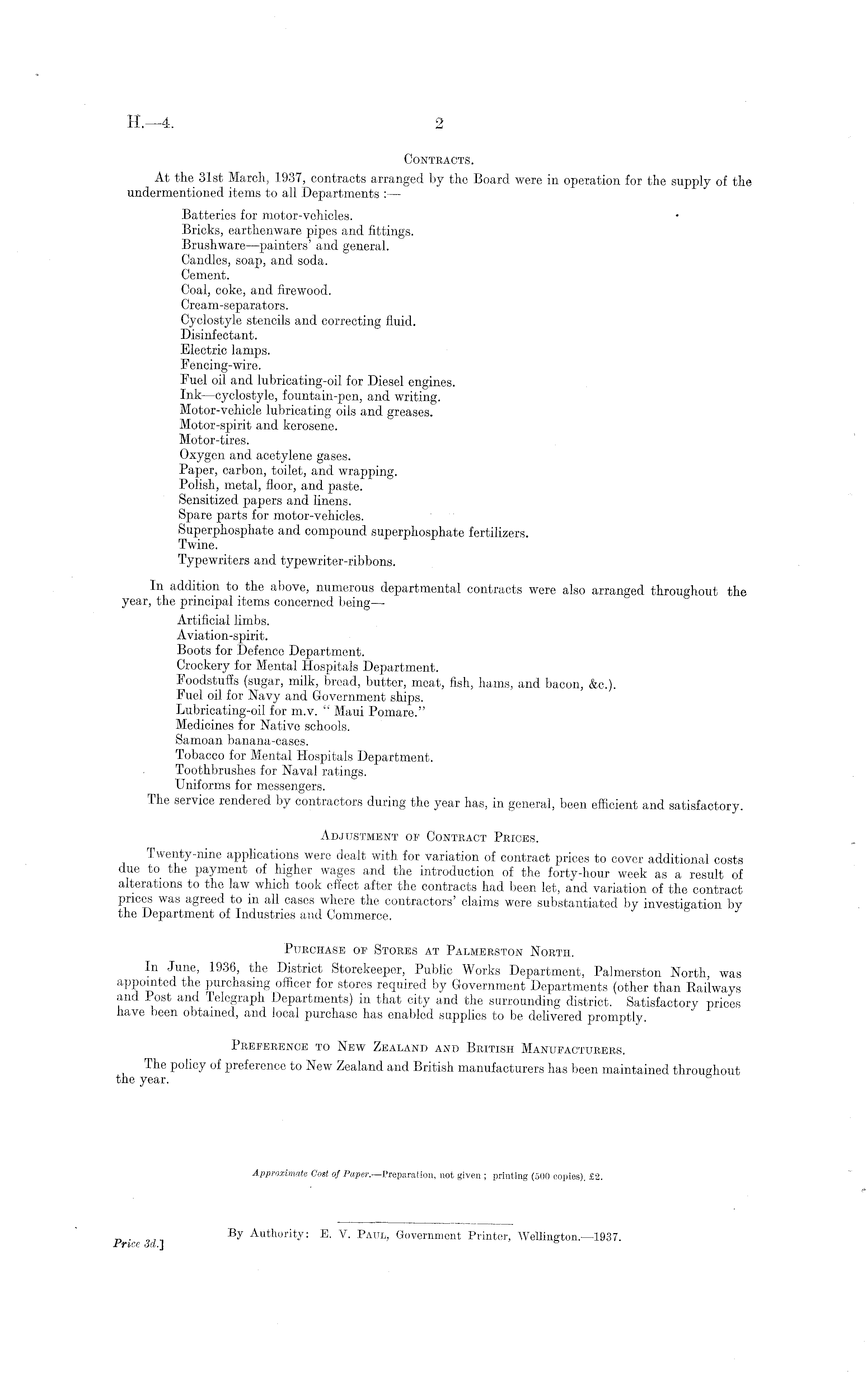 Contracts. At the 31st March, 1937, contracts arranged by the Board were in operation for the supply of the undermentioned items to all Departments :— Batteries for motor-vehicles. Bricks, earthenware pipes and fittings. Brushware —painters' and general. Candles, soap, and soda. Cement. Coal, coke, and firewood. Cream-separators. Cyclostyle stencils and correcting fluid. Disinfectant. Electric lamps. Fencing-wire. Fuel oil and lubricating-oil for Diesel engines. Ink —cyclostyle, fountain-pen, and writing. Motor-vehicle lubricating oils and greases. Motor-spirit and kerosene. Motor-tires. Oxygen and acetylene gases. Paper, carbon, toilet, and wrapping. Polish, metal, floor, and paste. Sensitized papers and linens. Spare parts for motor-vehicles. Superphosphate and compound superphosphate fertilizers. Twine. Typewriters and typewriter-ribbons. In addition to the above, numerous departmental contracts were also arranged throughout the year, the principal items concerned being—• Artificial limbs. Aviation-spirit. Boots for Defence Department. Crockery for Mental Hospitals Department. Foodstuffs (sugar, milk, bread, butter, meat, fish, hams, and bacon, &c.). Fuel oil for Navy and Government ships. Lubricating-oil for m.v. " Maui Pomare." Medicines for Native schools. Samoan banana-cases. Tobacco for Mental Hospitals Department. Toothbrushes for Naval ratings. Uniforms for messengers. The service rendered by contractors during the year has, in general, been efficient and satisfactory. Adjustment op Contract Prices. Twenty-nine applications were dealt with for variation of contract prices to cover additional costs due to the payment of higher wages and the introduction of the forty-hour week as a result of alterations to the law which took effect after the contracts had been let, and variation of the contract prices was agreed to in all cases where the contractors' claims were substantiated by investigation by the Department of Industries and Commerce. Purchase of Stores at Palmerston North. In June, 1936, the District Storekeeper, Public Works Department, Palmerston North, was appointed the purchasing officer for stores required by Government Departments (other than Railways and Post and Telegraph Departments) in that city and the surrounding district. Satisfactory prices have been obtained., and local purchase has enabled supplies to be delivered promptly. Preference to New Zealand and British Manufacturers. The policy of preference to New Zealand and British manufacturers has been maintained throughout the year. Approximate Cost of Paper.—Preparation, not given ; printing (500 copies). £2.