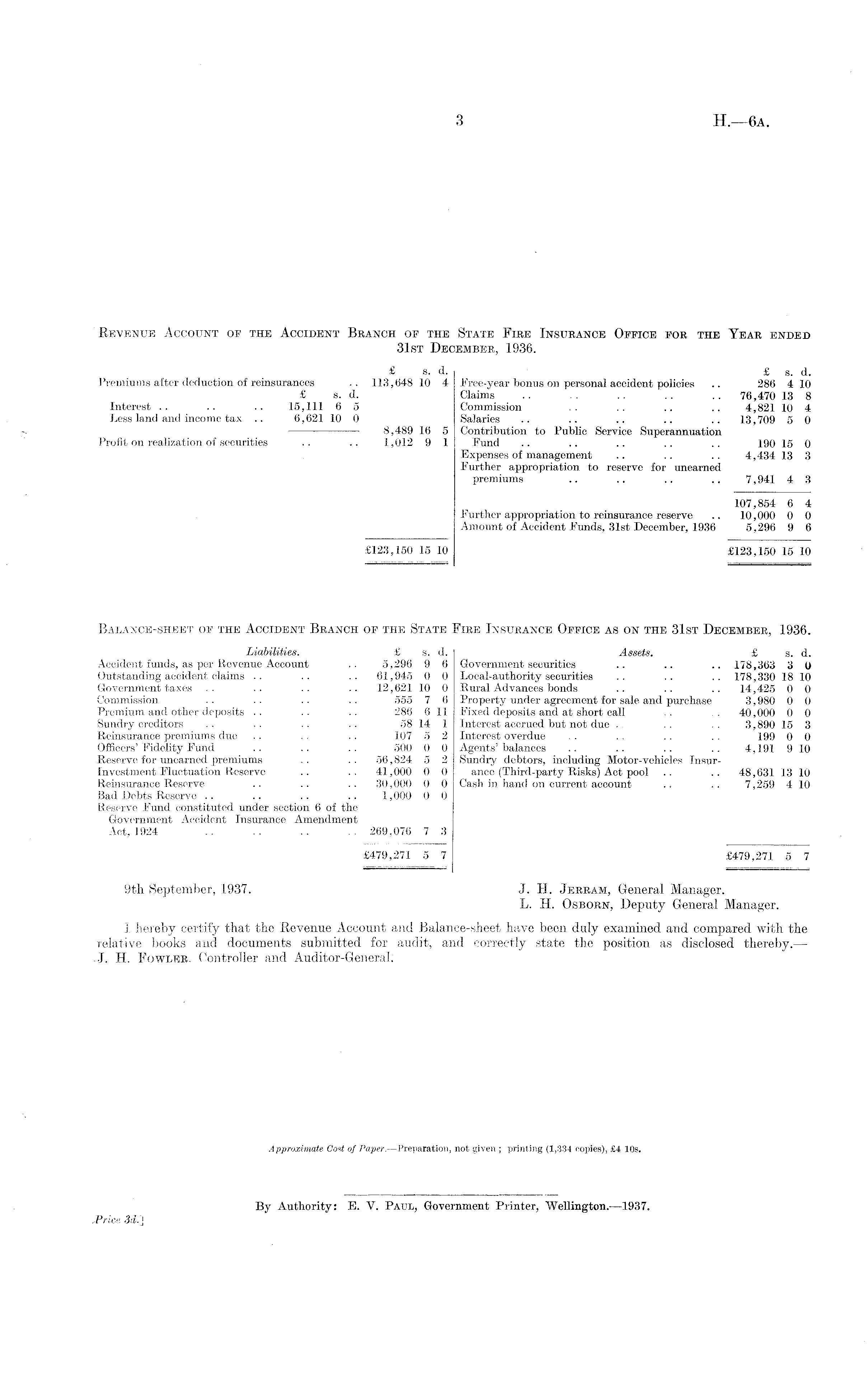 Revenue Account op the Accident Branch of the State Fire Insurance Office for the Year ended 31st December, 1936. £ s. d. £ s. d. Premiums after deduction of reinsurances .. 113,648 10 4 Free-year bonus on personal accident policies .. 286 410 £ s. d. Claims .. .. .. .. .. 76,470 13 8 Interest .. .. .. 15,11165 Commission .. .. .. .. 4,821 10 4 Less land and income tax .. 6,621 10 0 Salaries .. .. .. .. .. 13,709 5 0 8,489 16 5 Contribution to Public Service Superannuation Profit on realization of securities .. .. 1,012 9 1 Fund .. .. .. .. .. 190 15 0 Expenses of management .. .. .. 4,434 13 3 Further appropriation to reserve for imearned premiums .. .. .. .. 7,941 4 3 107,854 6 4 Further appropriation to reinsurance reserve .. 10,000 0 0 Amount of Accident Funds, 31st December, 1936 5,296 9 6 £123,150 15 10 £123,150 15 10 Balance-sheet of the Accident Branch of the State Fire Insurance Office as on the 31st December, 1936. Liabilities. £ s. d. Assets. £ s. d. Accident funds, as per Revenue Account .. 5,296 9 6 Government securities .. .. .. 178,363 3 U Outstanding accident claims .. .. .. 61,945 0 0 Local-authority securities .. .. .. 178,330 18 10 Government taxes .. .. .. .. 12,621 10 0 Rural Advances bonds .. .. .. 14,425 0 0 Commission .. .. . . .. 555 7 6 Property under agreement for sale and purchase 3,980 0 0 Premium and other deposits .. .. .. 286 611 Fixed deposits and at short call .. .. 40,000 0 0 Sundry creditors .. .. .. .. 58 14 1 Interest accrued but not due . .. .. 3,890 15 3 Reinsurance premiums due . . . . .. 107 5 2 Interest overdue .. . . .. .. 199 0 0 Officers' Fidelity Fund .. .. .. 500 0 0 Agents'balances .. .. .. .. 4,191 9 10 Reserve for unearned premiums .. .. 56,824 5 2 Sundry debtors, including Motor-vehicles InsurInvestment Fluctuation Reserve .. .. 41,000 0 0 ance (Third-party Risks) Act pool .. .. 48,631 13 10 Reinsurance Reserve .. .. .. 30,000 0 0 Cash in hand on current account .. .. 7,259 410 Bad Debts Reserve .. .. .. .. 1,000 0 0 Reserve Fund constituted under section 6 of the Government Accident Insurance Amendment Act, 1924 . . .. .. . . 269,076 7 3 £479,271 5 7 £479,271 5 7 9th September, 1937. J. H. Jerram, General Manager. L. H. Osborn, Deputy General Manager. I hereby certify that the Revenue Account and Balance-sheet have been duly examined and compared with the relative books and documents submitted for audit, and correctly state the position as disclosed thereby.—--J. H. Fowler. Controller and Auditor-General.