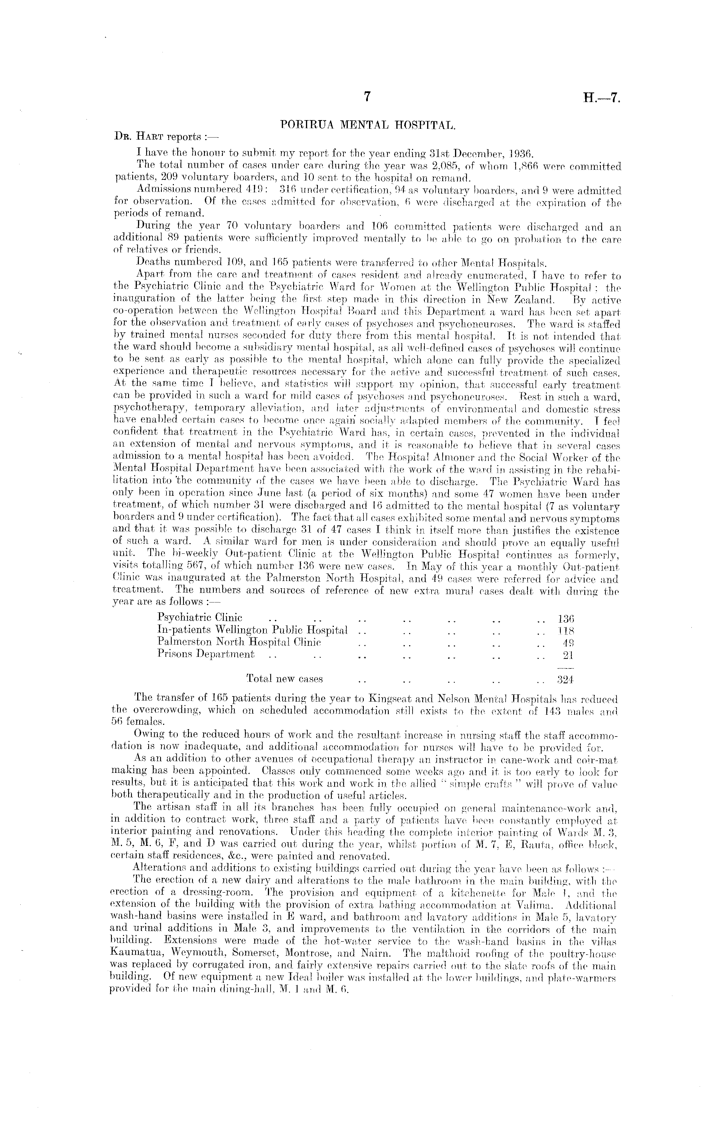 PORIRUA MENTAL HOSPITAL. Dr. Hart reports : — I have the honour to submit my report for the year ending 31st December, 1936. The total number of cases under care during the year was 2,085, of whom 1,866 were committed patients, 209 voluntary boarders, and 10 sent to the hospital on remand. Admissions numbered 419 : 316 under certification, 94 as voluntary boarders, and 9 were admitted for observation. Of the cases admitted for observation, 6 were discharged at the expiration of the periods of remand. During the year 70 voluntary boarders and 106 committed patients were discharged and an additional 89 patients were sufficiently improved mentally to be able to go on probation to the care of relatives or friends. Deaths numbered 109, and 165 patients were transferred to other Mental Hospitals. Apart from the care and treatment of cases resident and already enumerated, I have to refer to the Psychiatric Clinic and the Psychiatric Ward for Women at the Wellington Public Hospital; the inauguration of the latter being "the first step made in this direction in New Zealand. By active co-operation between the Wellington Hospital Board and this Department a ward has been set apart for the observation and treatment of ea-rly cases of psychoses and psychoneuroses. The ward is staffed by trained mental nurses seconded for duty there from this mental hospital. It is not intended that the ward should become a subsidiary mental hospital, as all well-defined cases of psychoses will continue to be sent as early as possible to the mental hospital, which alone can fully provide the specialized experience and therapeutic resources necessary for the active and successful treatment of such cases. At the same time I believe, and statistics will support my opinion, that successful early treatment can be provided in such a ward for mild cases of psychoses and psychoneuroses. Rest in such a ward, psychotherapy, temporary alleviation, and later adjustments of environmental and domestic stress have enabled certain cases to become once again socially adapted members of the community. I feel confident that treatment in the Psychiatric Ward has, in certain cases, prevented in the individual an extension of mental and nervous symptoms, and it is reasonable to believe that in several cases admission to a mental hospital has been avoided. The Hospital Almoner and the Social Worker of the Mental Hospital Department have been associated with the work of the ward in assisting in the rehabilitation into 'the community of the cases we have been able to discharge. The Psychiatric Ward has only been in operation since June last (a period of six months) and some 47 women have been under treatment, of which number 31 were discharged and 16 admitted to the mental hospital (7 as voluntary boarders and 9 under certification). The fact that all cases exhibited some mental and nervous symptoms and that it was possible to discharge 31 of 47 eases I think in itself more than justifies the existence of such a ward. A similar ward for men is under consideration and should prove an equally useful unit. The bi-weekly Out-patient Clinic at the Wellington Public Hospital continues as formerly, visits totalling 567, of which number 136 were new cases. In May of this year a monthly Out-patient Clinic was inaugurated at the Palmerston North Hospital, and 49 cases were referred for advice and treatment. The numbers and sources of reference of new extra mural cases dealt with during the year are as follows : — Psychiatric Clinic .. .. .. .. .. .. 136 In-patients Wellington Public Hospital .. .. .. .. .. 118 Palmerston North Hospital Clinic .. .. .. .. 49 Prisons Department . . .. .. .. .. .. 21 Total new cases .. .. .. .. , . 324 The transfer of 165 patients during the year to Kingseat and Nelson Mental Hospitals has reduced the overcrowding, which on scheduled accommodation still exists to the extent of 143 males and 56 females. Owing to the reduced hours of work and the resultant increase in nursing staff the staff accommodation is now inadequate, and additional accommodation for nurses will have to be provided for. As an addition to other avenues ot occupational therapy an instructor in cane-work and coir-mat making has been appointed. Classes only commenced some weeks ago and it is too early to look for results, but it is anticipated that this work and work in the allied " simple crafts " will prove of value both therapeutically and in the production of useful articles. The artisan staff in all its branches has been fully occupied on general maintenance-work and, in addition to contract work, three staff and a party of patients have been constantly employed at interior painting and renovations. Under this heading the complete interior painting of Wards M. 3, M. 5, M. 6, F, and D was carried out during the year, whilst portion of M. 7, E, Rauta, office block, certain staff residences, &c., were painted and renovated. Alterations and additions to existing buildings carried out during the year have been as follows :— The erection of a new dairy and alterations to the male bathroom in the main building, with the erection of a dressing-room. The provision and equipment of a kitchenette for Male 1, and the extension of the building with the provision of extra bathing accommodation at Yalima. Additional wash-hand basins were installed in E ward, and bathroom and lavatory additions in Male 5, lavatory and urinal additions in Male 3, and improvements to the ventilation in the corridors of the main building. Extensions were made of the hot-water service to the wash-hand basins in the villas Kaumatua, Weymouth, Somerset, Montrose, and Nairn. The malthoid roofing of the poultry-house wa« replaced by corrugated iron, and fairly extensive repairs carried out to the slate roofs of the main building. Of new equipment a new Ideal boiler was installed at the lower buildings, and plate-warmers provided for the main dining-hall, M. 1 and M. 6.