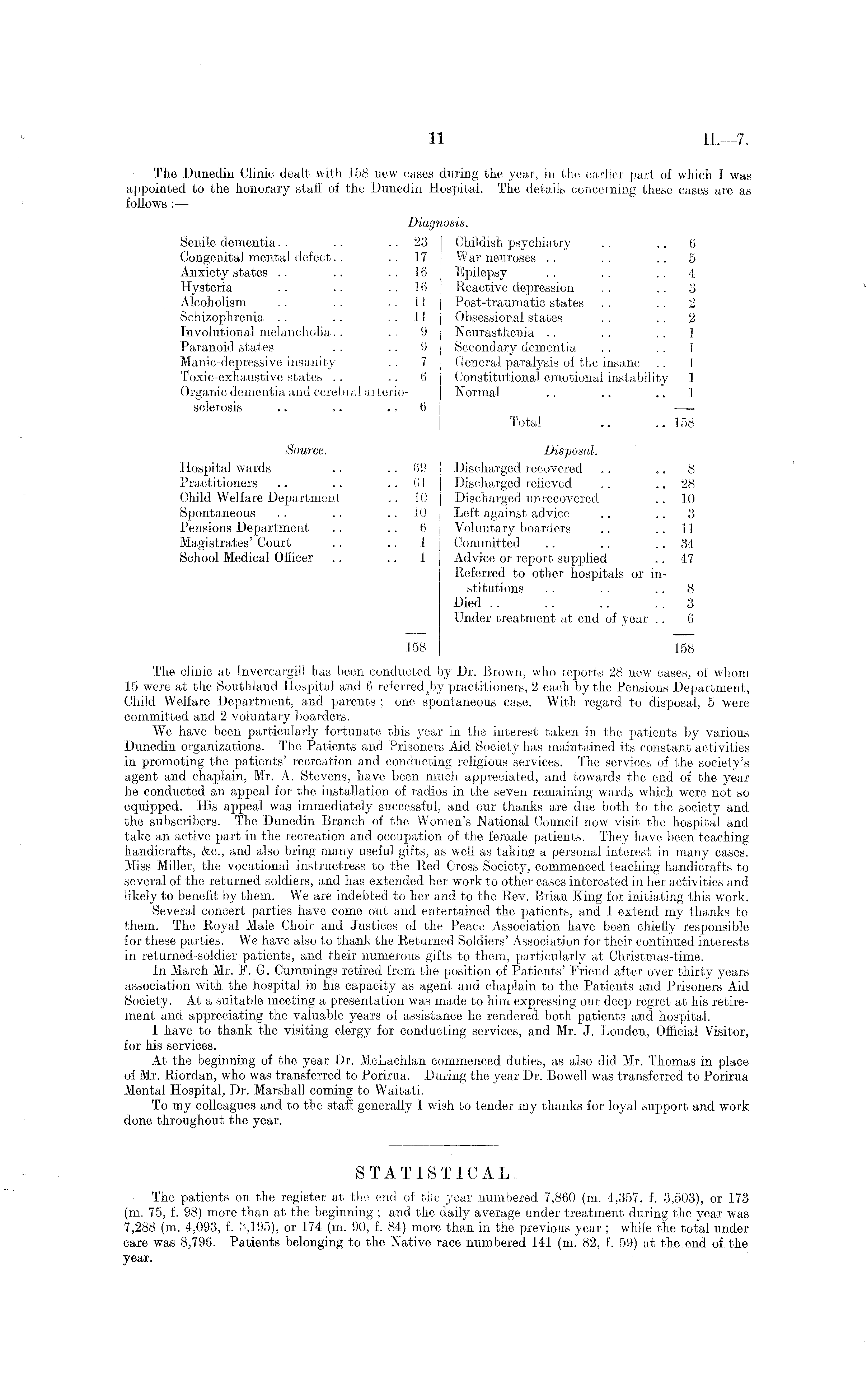 The Dunedin Clinic dealt with 158 new cases during the year, in the earlier part of which I was appointed to the honorary staff of the Dunedin Hospital. The details concerning these cases are as follows: — Diagnosis. Senile dementia.. .. .. 23 Childish psychiatry .. .. 6 Congenital mental defect.. .. 17 War neuroses .. .. .. 5 Anxiety states .. .. 16 Epilepsy .. .. 4 Hysteria .. .. 16 Reactive depression . . .. 3 Alcoholism .. .. ..11 Post-traumatic states .. .. 2 Schizophrenia .. .. ..11 Obsessional states .. .. 2 Involutional melancholia. . .. 9 Neurasthenia .. .. .. 1 Paranoid states . . .. 9 Secondary dementia .. . . ] Manic-depre,ssive insanity . . 7 General paralysis of the insane .. I Toxic-exhaustive states .. .. 6 Constitutional emotional instability 1 Organic dementia and cerebral arterio- Normal .. .. .. 1 sclerosis .. .. .. 6 Total .. ..158 Source. Disposal. Hospital wards .. 69 Discharged recovered .. .. 8 Practitioners .. .. .. 61 Discharged relieved .. .. 28 Child Welfare Department .. 10 Discharged unrecovered .. 10 Spontaneous . . .. 10 Left against advice .. .. 3 Pensions Department .. .. 6 Voluntary boarders .. .. 11 Magistrates' Court . . .. 1 Committed .. .. 34 School Medical Officer .. .. 1 Advice or report supplied .. 47 Referred to other hospitals or institutions .. . . 8 Died .. .. .. 3 Under treatment at end of year .. 6 158 158 The clinic at Invercargill has been conducted by Dr. Brown, who reports 28 new cases, of whom 15 were at the Southland Hospital and 6 referred Joy practitioners, 2 each by the Pensions Department, Child Welfare Department, and parents ; one spontaneous case. With regard, to disposal, 5 were committed and 2 voluntary boarders. We have been particularly fortunate this year in the interest taken in the patients by various Dunedin organizations. The Patients and Prisoners Aid Society has maintained its constant activities in promoting the patients' recreation and conducting religious services. The services of the society's agent and chaplain, Mr. A. Stevens, have been much appreciated, and towards the end of the year he conducted an appeal for the installation of radios in the seven remaining wards which were not so equipped. His appeal was immediately successful, and our thanks are due both to the society and the subscribers. The Dunedin Branch of the Women's National Council now visit the hospital and take an active part in the recreation and occupation of the female patients. They have been teaching handicrafts, &c., and also bring many useful gifts, as well as taking a personal interest in many cases. Miss Miller, the vocational instructress to the Red Cross Society, commenced teaching handicrafts to several of the returned soldiers, and has extended her work to other cases interested in her activities and likely to benefit by them. We are indebted to her and to the Rev. Brian King for initiating this work. Several concert parties have come out and entertained the patients, and I extend my thanks to them. The Royal Male Choir and Justices of the Peace Association have been chiefly responsible for these parties. We have also to thank the Returned Soldiers' Association for their continued interests in returned-soldier patients, and their numerous gifts to them, particularly at Christmas-time. In March Mr. F. G. Cummings retired from the position of Patients' Friend after over thirty years association with the hospital in his capacity as agent and chaplain to the Patients and Prisoners Aid Society. At a suitable meeting a presentation was made to him expressing our deep regret at his retirement and appreciating the valuable years of assistance he rendered both patients and hospital. I have to thank the visiting clergy for conducting services, and Mr. J. Louclen, Official Visitor, for his services. At the beginning of the year Dr. McLachlan commenced duties, as also did Mr. Thomas in place of Mr. Riordan, who was transferred to Poriraa. During the year Dr. Bowell was transferred to Porirua Mental Hospital, Dr. Marshall coming to Waitati. To my colleagues and to the staff generally I wish to tender my thanks for loyal support and work done throughout the year.