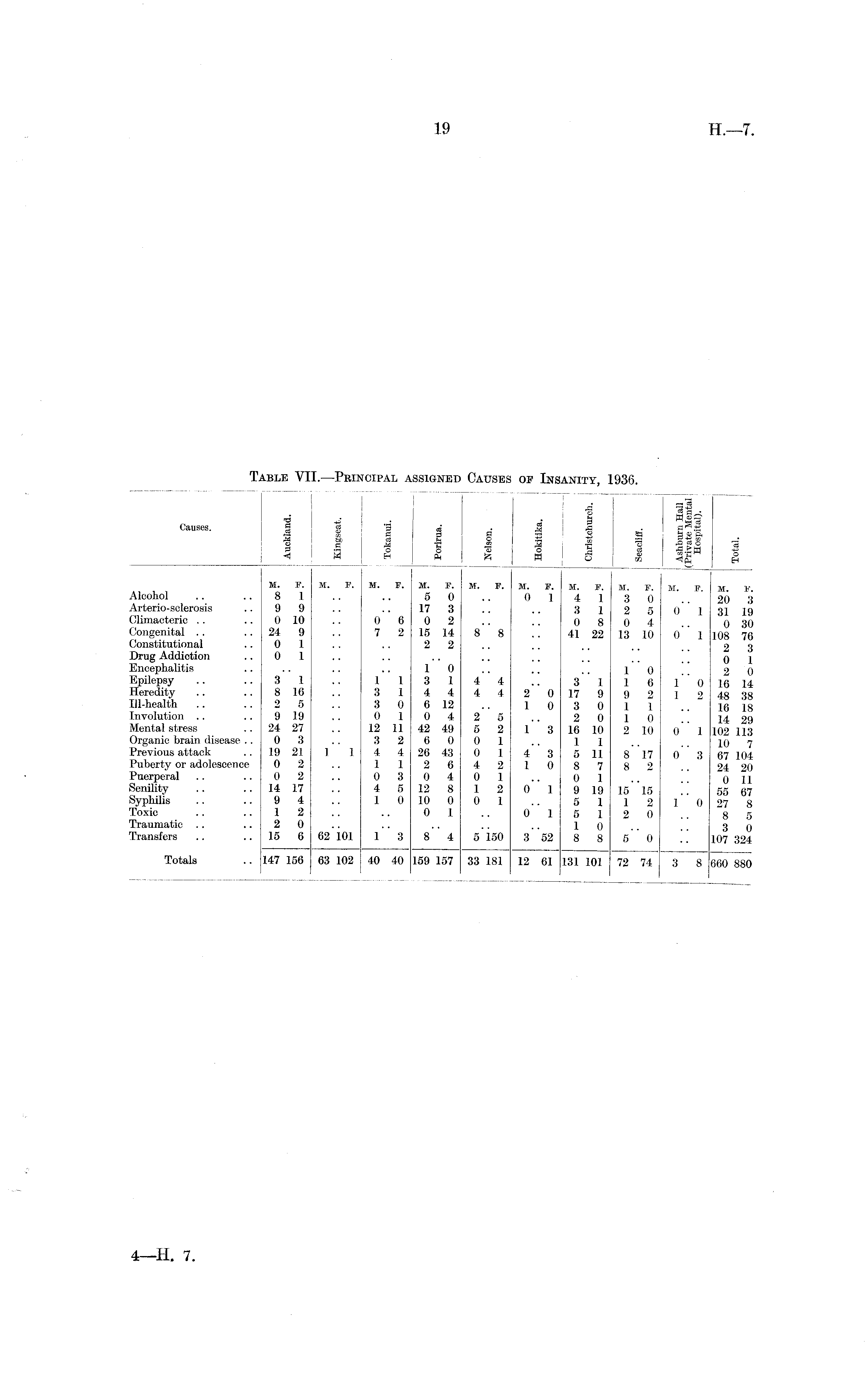 Table VII.—Principal assigned Causes of Insanity, 1936.