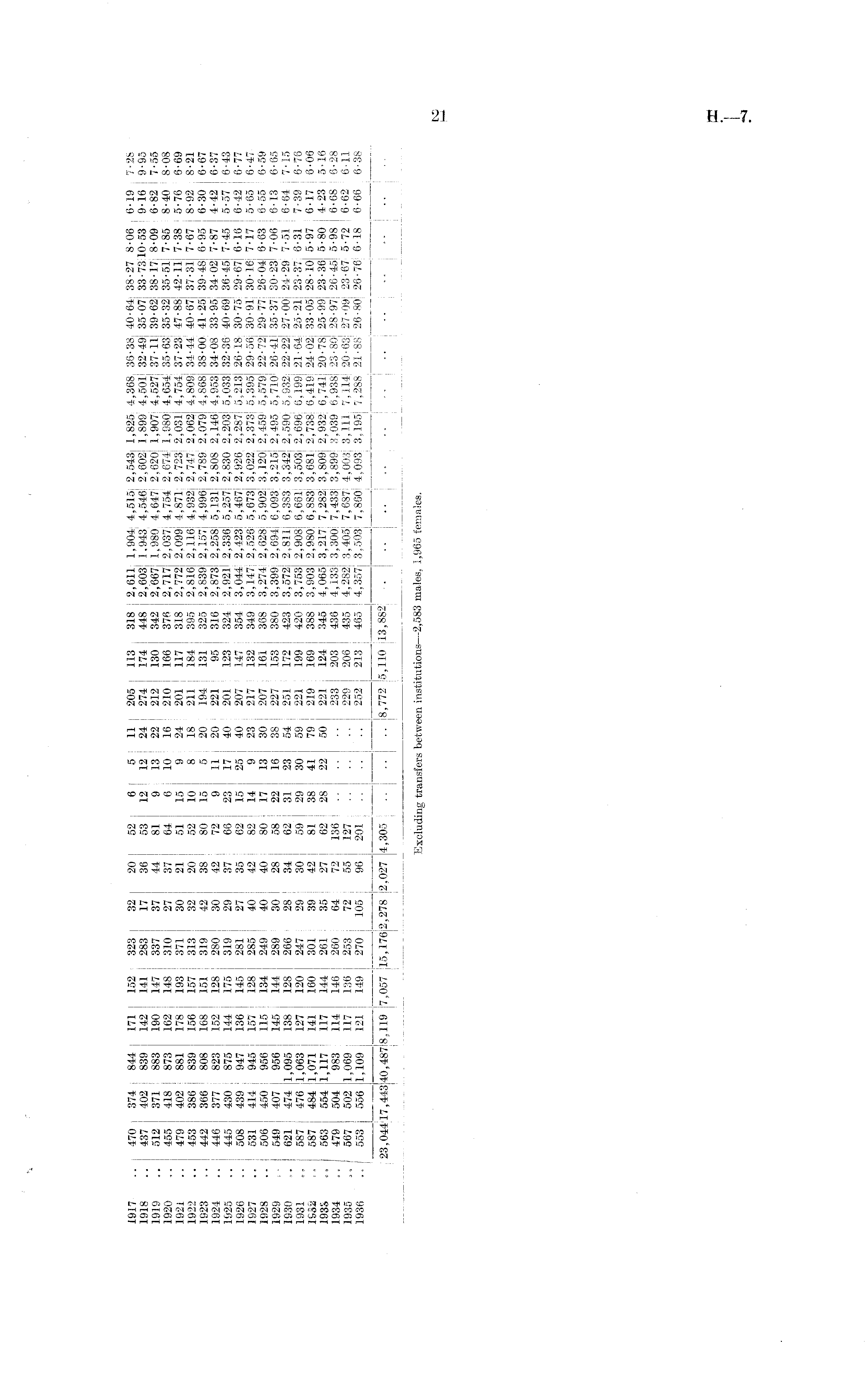 1917 .. 470 374 844 171 152 323 32 20 52 6 5 11 205 113 318 2,611 1,904 4,515 2,543 1,825 4,368 36-38 40-64 38-27 8-06 6-19 7-28 1918 .. 437 402 839 142 141 283 17 36 53 12 12 24 274 174 448 2,603 1,943 4,546 2,602 1,899 4,501 32-49 35-07 33-7310-53 9-16 9-95 1919 .. 512 371 883 190 147 337 37 44 81 9 13 22 212 130 342 2,667 1,980 4,647 2,620 1,907 4,527 37-11 39-62 38-17 8-09 6-82 7-55 1920 455 418 873 162 148 310 27 37 64 6 10 16 210 166 376 2,717 2,037 4,754 2,674 1,980 4,654 35-63 35-32 35-51 7-85 8-40 8-08 1921 .. 479 402 881 178 193 371 30 21 51 15 9 24 201 117 318 2,772 2,099 4,871 2,723 2,031 4,754 37-23 47-88 42-11 7-38 5-76 6-69 1922 .. 453 386 839 156 157 313 32 20 52 10 8 18 211 184 395 2,816 2,116 4,932 2,747 2,062 4,809 34-44 40-67 37-31 7-67 8-92 8-21 1923 .. 442 366 808 168 151 319 42 38 80 15 5 20 194 131 325 2,839 2,157 4,996 2,789 2,079 4,868 38-00 41-25 39-48 6-95 6-30 6-67 1924 .. 446 377 823 152 128 280 30 42 72 9 11 20 221 95 316 2,873 2,258 5,131 2,808 2,146 4,953 34-08 33-95 34-02 7-87 4-42 6-37 1925 445 430 875 144 175 319 29 37 66 23 17 40 201 123 324 2,921 2,336 5,257 2,830 2,203 5,033 32-36 40-69 36-45 7-45 5-57 6-43 1926 .. 508 439 947 136 145 281 27 35 62 15 25 40 207 147 354 3,044 2,423 5,467 2,926 2,287 5,213 26-18 30-75 29-67 6-16 6-42 6-77 1927 .. 531 414 945 157 128 285 40 42 82 14 9 23 217 132 349 3,147 2,526 5,673 3,022 2,373 5,395 29-56 30-91 30-16 7-17 5-65 6-47 1928 .. 506 450 956 115 134 249 40 40 80 17 13 30 207 161 368 3,274 2,628 5,902 3,120 2,459 5,579 22-72 29-77 26-04 6-63 6-55 6-59 1929 549 407 956 145 144 289 30 28 58 22 16 38 227 153 380 3,399 2,694 6,093 3,215 2,495 5,710 26-41 35-37 30-23 7-06 6-13 6-65 1930 .. 621 474 1,095 138 128 266 28 34 62 31 23 54 251 172 423 3,572 2,811 6,383 3,342 2,590 5,932 22-22 27-00 24-29 7-51 6-64 7-15 1931 .. 587 476 1,063 127 120 247 29 30 59 29 30 59 221 199 420 3,753 2,908 6,661 3,503 2,696 6,199 21-64 25-21 23-37 6-31 7-39 6-76 1SS2 587 484 1 071 141 160 301 39 42 81 38 41 79 219 169 388 3,903 2,980 6,883 3,681 2,738 6,419 24-02 33-05 28-10 5-97 6-17 6-06 1933 563 554 1 117 117 144 261 35 27 62 28 22 50 221 124 345 4,065 3,217 7,282 3,809 2,932 6,741 20-78 25-99 23-36 5-80 4-23 5-16 1934 479 504 '983 114 146 260 64 72 136 233 203 436 4,133 3,300 7,433 3,899 3,039 6,938 23-80 28-97 26-45 5-98 6-68 6-28 1935 567 502 1,069 117 136 253 72 55 127 229 206 435 4,282 3,405 7,687 4,003 3,111 7,114 20-63 27-09 23-67 5-72 6-62 6-11 1936 553 556 1,109 121 149 270 105 96 201 .. .. .. 252 213 465 4,357 3,503 7,860 4,093 3,195 7,288 21-88 26-80 26-76 6-18 6-66 6-38 23,04417,443 40,487 8,119 7,057 15,1762,278 2,027 4,305 8,772 5,110 13,882; .. .. .. j Excluding transfers between institutions —2,583 males, 1,965 females.