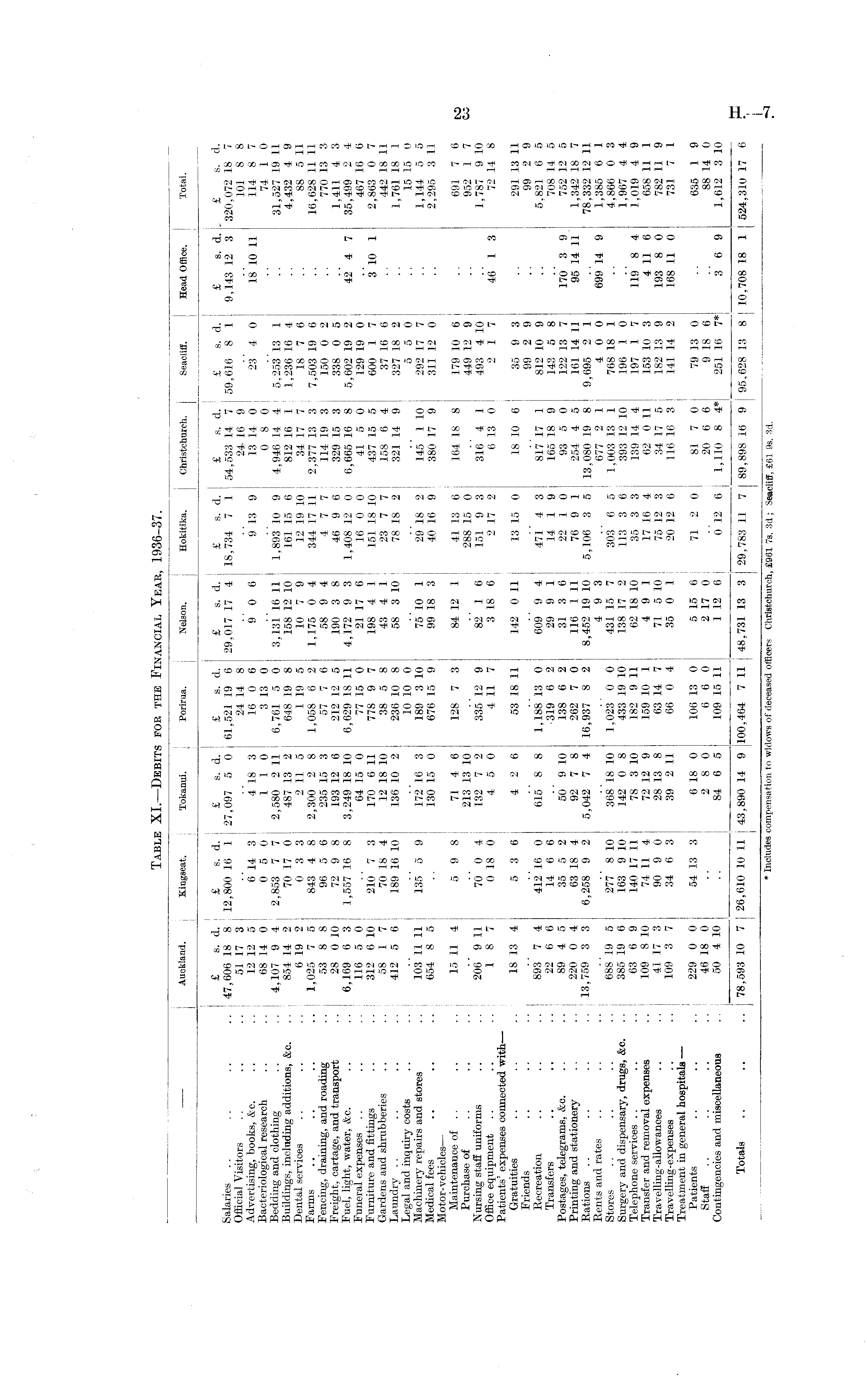 Auckland. j Kingseat. Tokanui. Porirua. Nelson. Hokitika. Christchnrch. Seacliff. Head Office. Total. £ s. d. £ s. d. £ s. d. £ s. d. £ s. d. £ s. d. £ s. d. £ s. d. £ s. d. * £ s. d. Salaries .. .. 47,606 18 8 12,800 16 1 27,097 5 0 61,521 19 6 29,017 17 4 18,734 7 1 54,633 14 7 59,616 8 1 9,143 12 3 320,072 18 7 Official Visitors .. .. .. 51 17 3 .. .. 24 14 8 . . .. 24 16 9 .. .. 101 8 8 Advertising, boots, &c. .. .. 12 12 5 6 14 3 4 18 3 16 0 6 9 0 6 9 13 9 13 14 0 23 4 0 18 10 11 114 8 7 Bacteriological research .. .. 68 14 0 050 110 3 13 0 .. .. 080 .. .. 74 10 Bedding and clothing .. .. 4,107 9 4 2,853 7 7 2,580 2 11 6,761 5 0 3,131 16 11 1,893 10 9 4,946 14 4 5,253 13 1 .. 31,527 19 11 Buildings, including additions, &c. .. 854 14 2 70 17 0 487 13 2 648 19 8 158 12 10 161 15 6 812 16 1 1,236 16 4 .. 4,432 4 9 Dental services .. .. 6 19 2 0 3 3 2 11 5 1 19 5 10 7 9 12 19 10 34 17 7 18 7 6 .. 88 5 11 Farms .. .. .. .. 1,025 7 5 843 4 8 2,300 2 8 1,058 6 2 1,175 0 4 344 17 11 2,377 13 3 7,503 19 6 .. 16,628 11 11 Fencing, draining, and roading .. 53 8 8 96 5 6 235 15 3 57 7 6 58 9 4 4 7 7 114 19 3 150 0 2 .. 770 13 3 Freight, cartage, and transport .. 28 0 10 72 9 8 193 12 6 212 12 5 190 3 8 46 9 6 329 15 3 338 0 5 .. 1,411 4 3 Fuel, light, water, &c. .. .. 6,169 6 3 1,557 16 8 3,249 18 10 6,629 18 11 4,172 9 3 1,408 12 0 6,665 16 8 5,602 19 2 42 4 7 35,499 2 4 Funeral expenses .. .. .. 116 5 0 .. 64 15 0 77 15 0 21 17 6 16 0 0 41 5 0 129 19 0 .. 467 16 6 Furniture and fittings .. 312 6 10 210 7 3 170 6 11 778 9 7 198 4 1 151 18 10 437 15 5 600 1 7 3 10 1 2,863 0 7 Gardens and shrubberies .. .. 58 1 7 70 18 4 12 18 10 38 5 8 43 4 1 23 7 7 158 6 4 37 16 6 .. 442 18 11 Laundry .. .. .. .. 412 5 6 189 16 10 136 10 2 236 10 8 58 3 10 78 18 2 321 14 9 327 18 2 .. 1,761 18 1 Legal and inquiry costs .. .. .. .. .. 10 10 0 .. .. .. 5 5 0 .. 15 15 0 Machinery repairs and stores .. 103 11 11 135 5 9 172 16 3 189 3 10 75 10 1 29 18 2 145 1 10 292 17 7 .. 1,144 5 5 Medical fees .. .. .. 654 8 5 130 15 0 676 15 9 99 18 3 40 16 9 380 17 9 311 12 0 .. 2,295 3 11 Motor-vehicles — Maintenance of .. .. .. 15 11 4 5 9 8 71 4 6 128 7 3 84 12 1 41 13 6 164 18 8 179 10 6 .. 691 7 6 Purchase of .. .. .. .. .. 213 13 10 .. .. 288 15 0 . . 449 12 9 .. 952 1 7 Nursing staff uniforms .. .. 206 9 11 70 0 4 132 7 2 335 12 9 82 1 6 151 9 3 316 4 1 493 4 10 .. 1,787 9 10 Office equipment .. .. .. 187 0 18 0 450 4 11 7 3 18 6 2 17 2 6 13 0 217 46 13 72 14 8 Patients' expenses connected with — Gratuities .. .. .. 18 13 4 5 3 6 4 2 6 53 18 11 142 0 11 13 15 0 18 10 6 35 9 3 .. 291 13 11 Friends .. .. .. .. .. .. .. .. .. .. 99 2 9 .. 99 2 9 Recreation .. .. .. 893 7 4 412 16 0 615 8 8 1,188 13 0 609 9 4 471 4 3 817 17 1 812 10 9 .. 5,821 6 5 Transfers .. .. .. 22 6 6 14 6 6 .. -319 6 2 29 9 1 14 1 9 165 18 9 143 5 8 .. 708 14 5 Postages, telegrams, &o. .. .. 89 4 5 35 5 2 50 9 10 138 6 2 31 3 6 22 1 0 93 5 0 122 13 7 170 3 9 752 12 5 Printing and stationery .. .. 220 0 4 63 18 4 92 7 8 262 7 0 116 1 11 76 9 1 254 4 5 161 14 11 95 14 11 1,342 18 7 Rations .. .. .. .. 13,759 3 3 6,258 9 2 5,042 7 4 16,937 8 2 8,452 19 10 5,106 3 5 13,080 19 8 9,695 2 1 .. 78,332 12 11 Rents and rates .. .. .. .. .. 4 9 3 .. 677 2 1 4 0 0 699 14 9 1,385 6 1 Stores .. .. .. .. 688 19 5 277 8 10 368 18 10 1,023 0 0 431 15 7 303 6 5 1,003 13 1 768 18 1 .. 4,866 0 3 Surgery and dispensary, drugs, &c. .. 385 19 6 163 9 10 142 0 8 433 19 10 138 17 2 113 3 6 393 12 10 196 1 0 .. 1,967 4 4 Telephone services .. .. .. 63 6 9 140 17 11 78 3 10 182 9 11 62 18 10 35 3 3 139 14 4 197 1 7 119 8 4 1,019 4 9 Transfer and removal expenses .. 109 8 10 74 11 4 72 12 9 159 10 1 4 9 1 17 16 4 62 0 11 153 10 3 4 11 6 658 11 1 Travelling-allowances .. .. 41 17 3 90 9 0 28 13 8 63 14 7 71 5 10 75 12 3 34 17 5 182 13 9 193 8 0 782 11 9 Travelling-expenses .. .. 109 3 7 34 6 3 39 2 11 66 0 4 35 0 1 20 12 6 116 16 3 141 14 2 168 11 0 731 7 1 Treatment in general hospitals — Patients .. .. .. 229 0 0 54 13 3 6 18 0 106 13 0 5 15 6 71 2 0 81 7 0 79 13 0 .. 635 1 9 Staff .. .. .. .. 46 18 0 .. 2 8 0 6 6 0 2 17 0 .. 20 6 6 9 18 6 .. 88 14 0 Contingencies and miscellaneous .. 50 4 10 .. 84 6 5 109 15 11 1 12 6 0 12 6 1,110 8 4* 251 16 7* 3 6 9 1,612 3 10 Totals .. .. .. 78,593 10 7 26,610 10 11 43,890 14 9 jl00,464 7 11 48,731 13 3 29,783 11 7 89,898 16 9 95,628 13 8 10,708 18 1 524,310 17 6 * Includes compensation to widows of deceased officers Christchurch, £961 7s. 3d ; Seacliff, £61 9s. 3d.