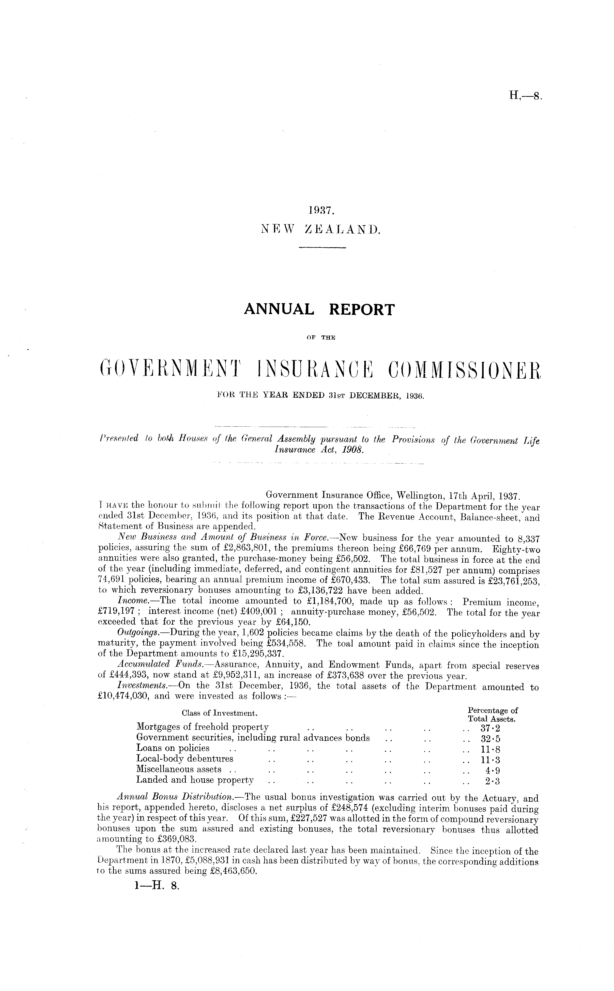 Government Insurance Office, Wellington, 17th April, 1937. I have the honour to submit the following report upon the transactions of the Department for the year ended 31st December, 1936, and its position at that date. The Revenue Account, Balance-sheet, and Statement of Business are appended. New Business and Amount of Business in Force.—New business for the year amounted to 8,337 policies, assuring the sum of £2,863,801, the premiums thereon being £66,769 per annum. Eighty-two annuities were also granted, the purchase-money being £56,502. The total business in force at the end of the year (including immediate, deferred, and contingent annuities for £81,527 per annum) comprises 74,691 policies, bearing an annual premium income of £670,433. The total sum assured is £23,761,253, to which reversionary bonuses amounting to £3,136,722 have been added. Income. —The total income amounted to £1,184,700, made up as follows : Premium income, £719,197 ; interest income (net) £409,001 ; annuity-purchase money, £56,502. The total for the year exceeded that for the previous year by £64,150. Outgoings.—During the year, 1,602 policies became claims by the death of the policyholders and by maturity, the payment involved being £534,558. The toal amount paid in claims since the inception of the Department amounts to £15,295,337. Accumulated Funds. —Assurance, Annuity, and Endowment Funds, apart from special reserves of £444,393, now stand at £9,952,311, an increase of £373,638 over the previous year. Investments. —On the 31st December, 1936, the total assets of the Department amounted to £10,474,030, and were invested as follows :— Class of Investment. Percentage of Total Assets. Mortgages of freehold property .. . . .. . . .. 37 • 2 Government securities, including rural advances bonds .. .. .. 32 • 5 Loans on policies .. .. .. .. .. .. .. 11-8 Local-body debentures .. .. .. .. .. ..11-3 Miscellaneous assets .. .. .. . . . . . . .. 4-9 Landed and house property .. .. .. .. .. .. 2-3 Annual Bonus Distribution.— I The usual bonus investigation was carried out by the Actuary, and his report, appended hereto, discloses a net surplus of £248,574 (excluding interim bonuses paid during the year) in respect of this year. Of this sum, £227,527 was allotted in the form of compound reversionary bonuses upon the sum assured and existing bonuses, the total reversionary bonuses thus allotted amounting to £369,083. The bonus at the increased rate declared last year has been maintained. Since the inception of the Department in 1870, £5,088,931 in cash has been distributed by way of bonus, the corresponding additions to the sums assured being £8,463,650. I—H. 8.